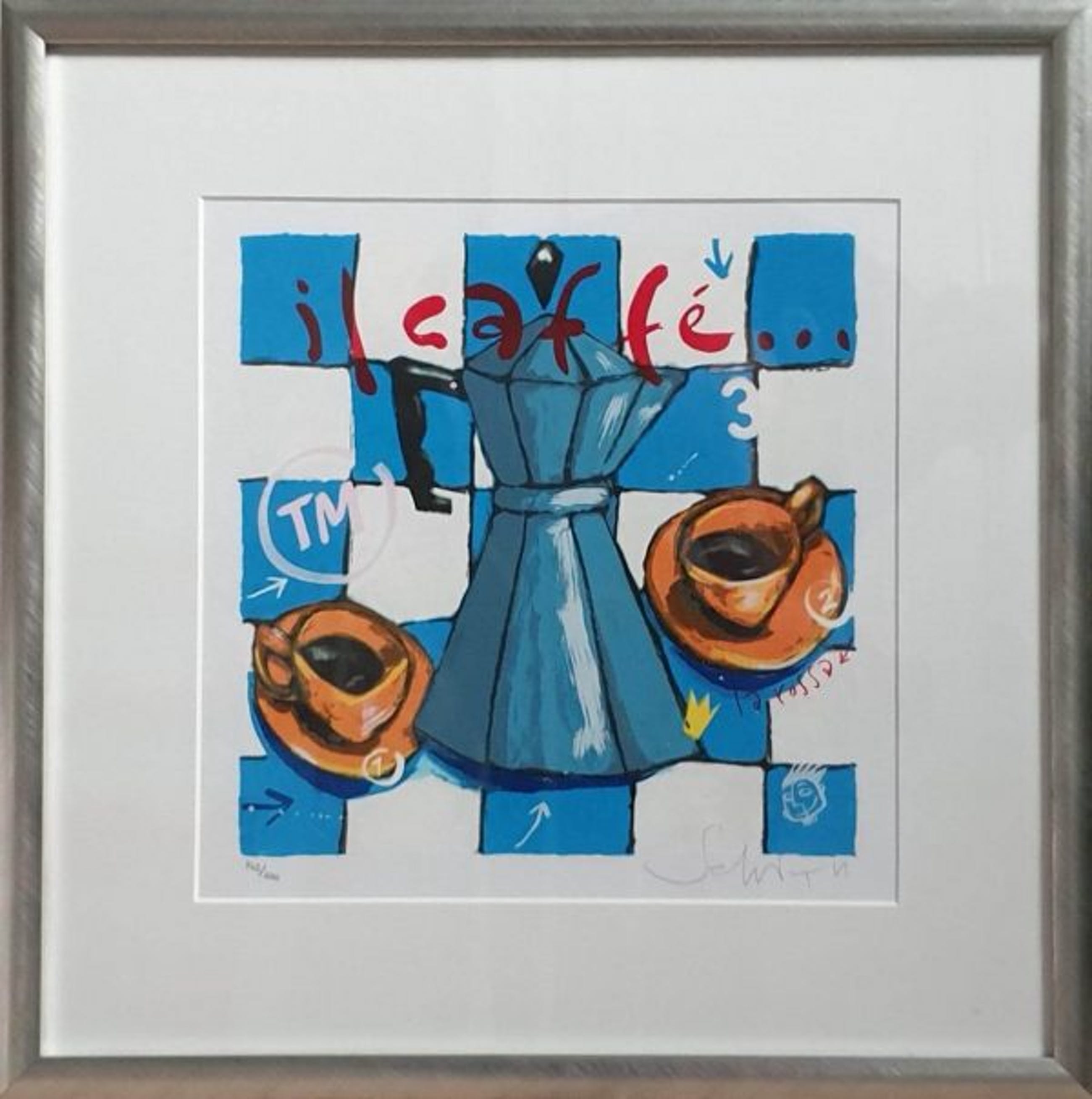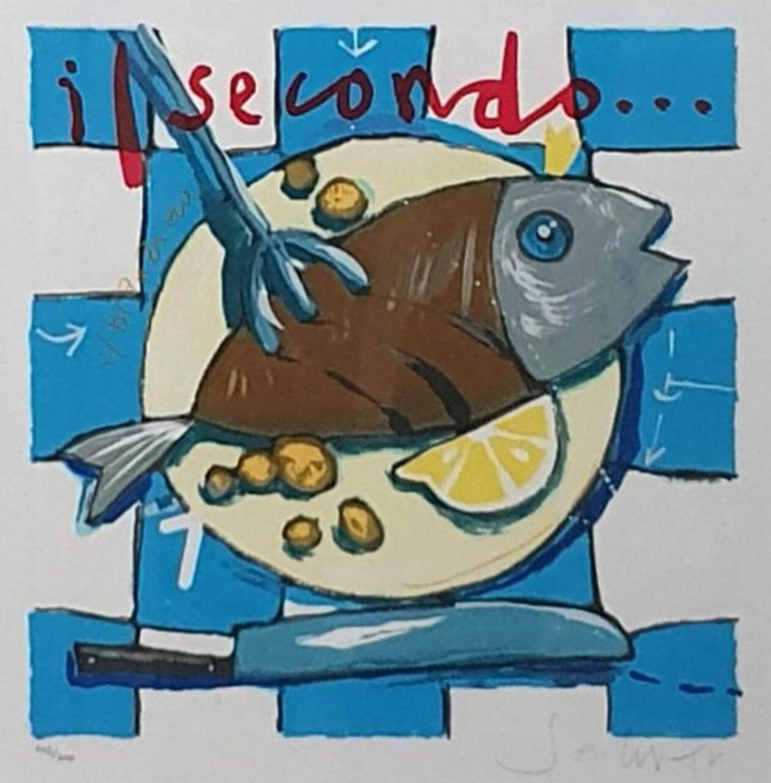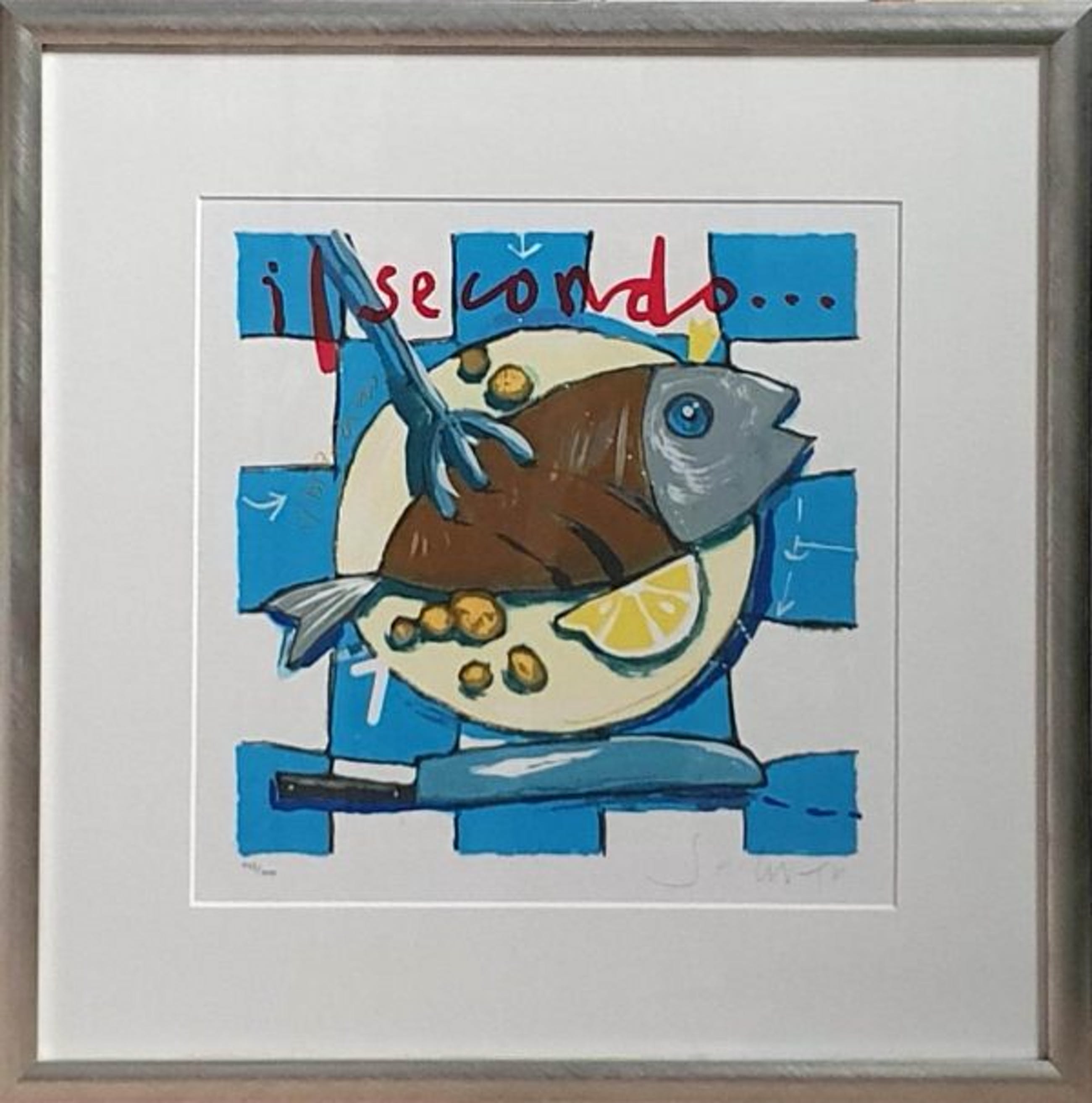 Erg mooie set van 4 bij elkaar horende hand gesigneerde zeefdrukken, voorstellende de gangen van een Italiaanse maaltijd. Allen hebben nummer 143/200.