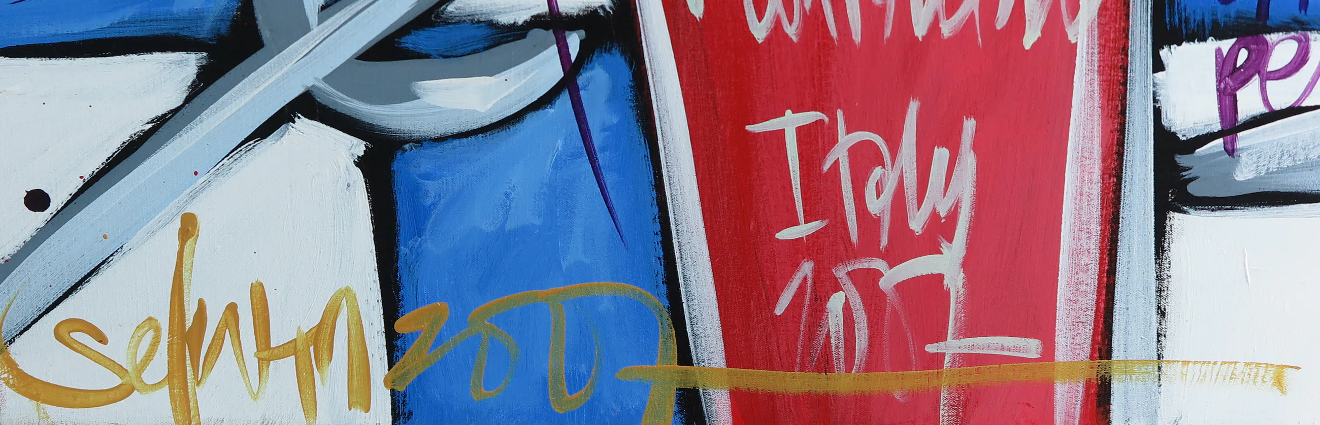 Kleurrijk doek in de herkenbare stijl van de bekende Selwyn Senatori.