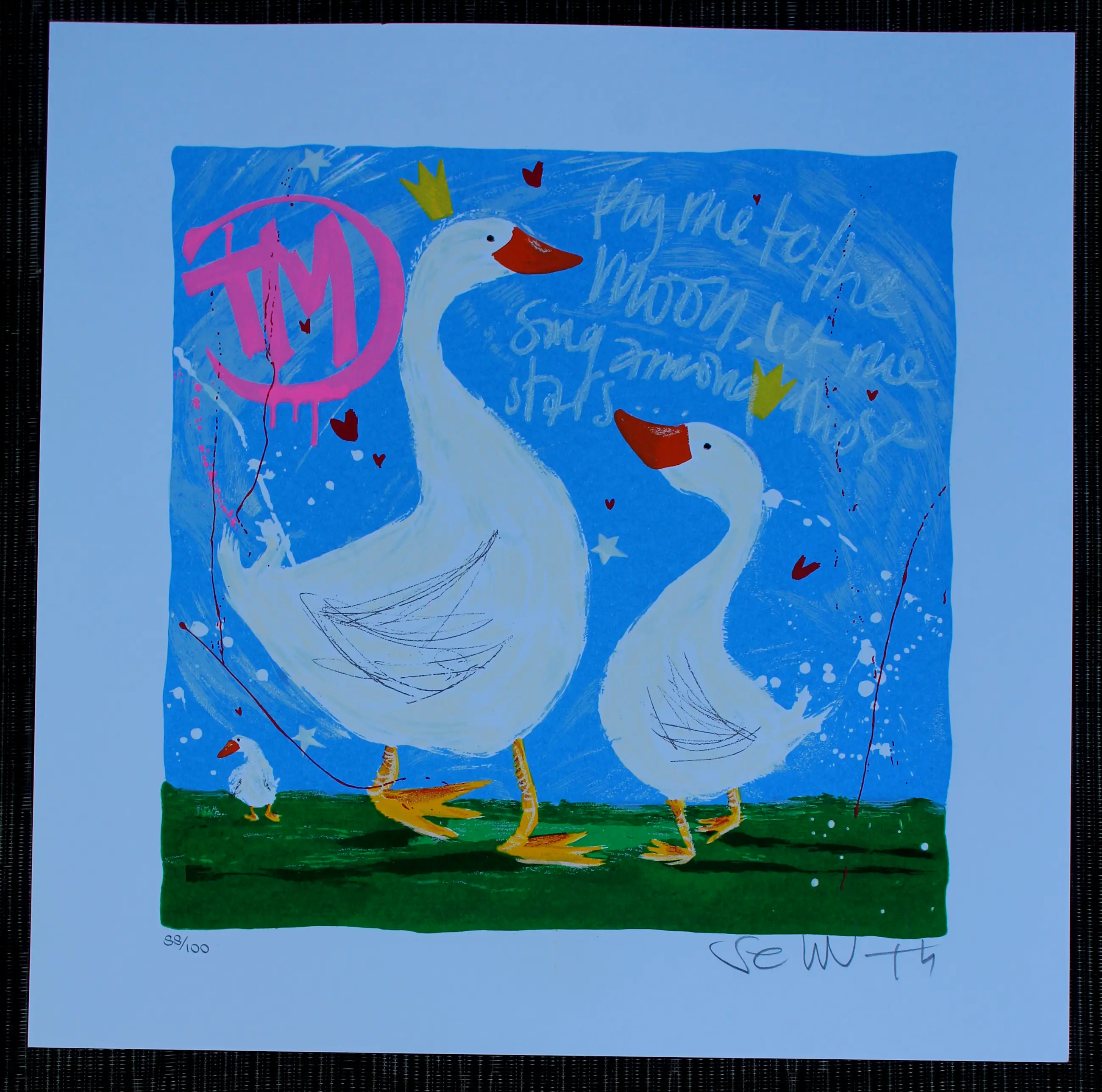 Zeefdruk van Selwyn Senatori. Titel: Fly me to the moon. Oplage: 88/100. Afmetingen blad: H40 x b40cm. Afmetingen voorstelling: H30 x b30cm. Het werk is rechts onderaan, gesigneerd door de kunstenaar. De authenticiteit van dit werk wordt volledig gegarandeerd. Een certificaat van echtheid kan, op aanvraag, worden gemaild.