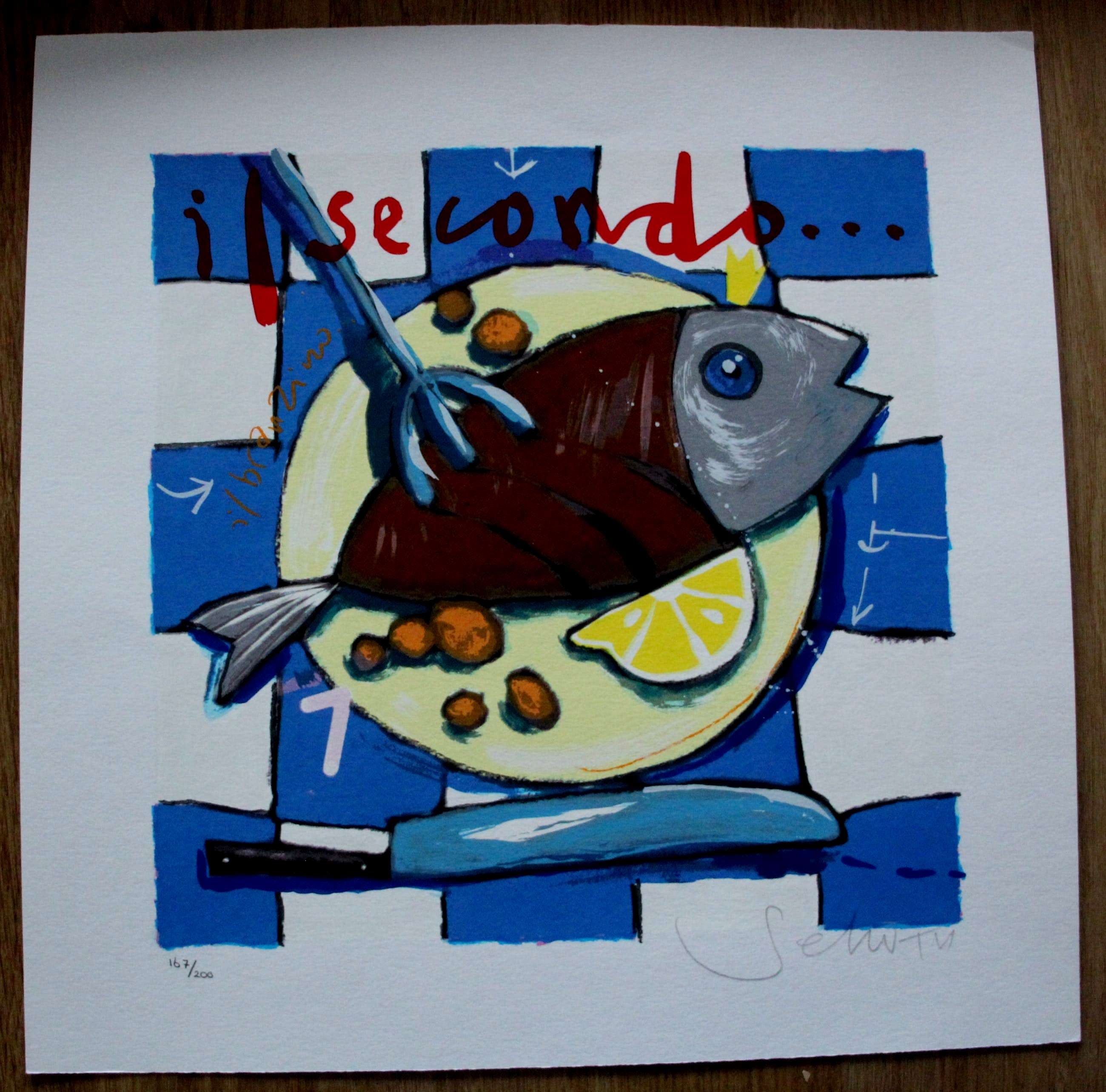 Zeefdruk van Selwyn Senatori: "IL Secundo". Dit werk komt uit een serie van vier bij elkaar horende zeefdrukken, voorstellende de gangen van een Italiaanse maaltijd. Oplage: 167/200. Afmetingen blad: H40 x b40cm. Afmetingen voorstelling: H30 x b30cm. Het werk is rechts onderaan, gesigneerd door de kunstenaar. De authenticiteit van dit werk wordt volledig gegarandeerd. Een certificaat van echtheid kan, op aanvraag, worden gemaild.