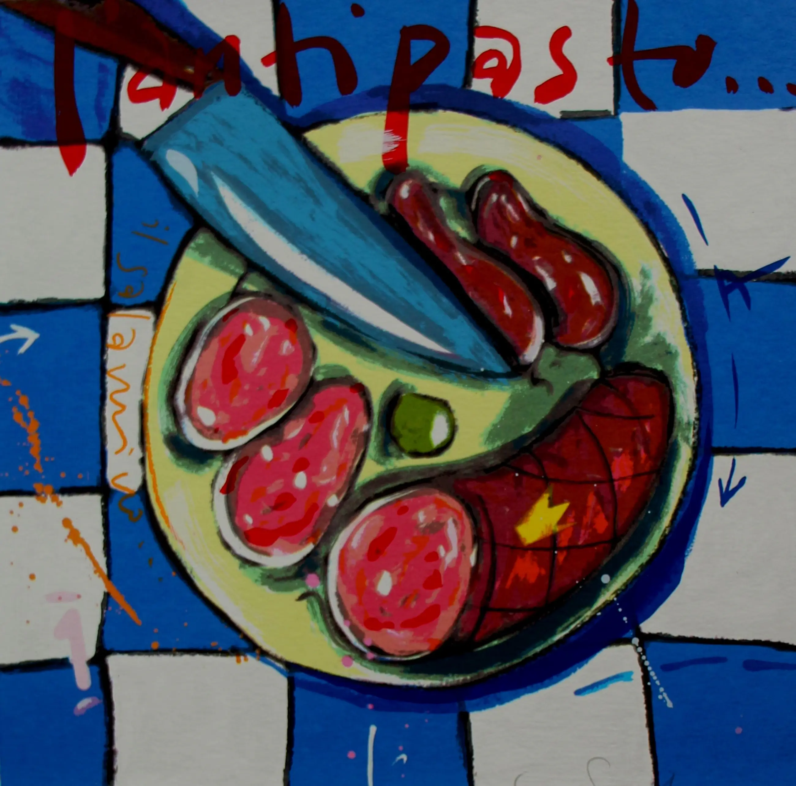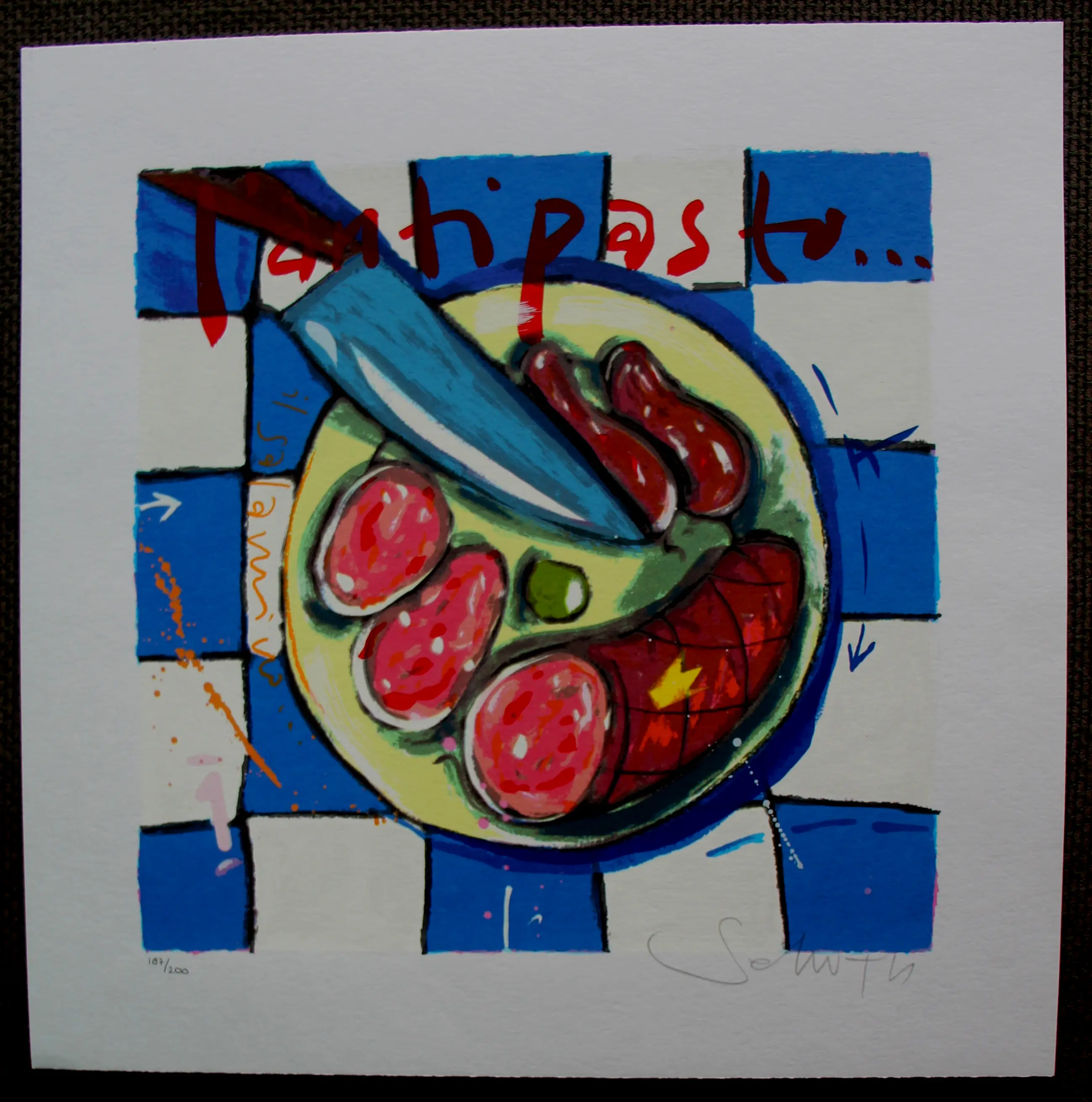 Zeefdruk van Selwyn Senatori. Titel: l'antipasta(het voorgerecht). Oplage: 187/200. Afmetingen blad: H40 x b40cm. Afmetingen voorstelling: H30 x b30cm. Het werk is rechts onderaan, gesigneerd door de kunstenaar. De authenticiteit van dit werk wordt volledig gegarandeerd. Een certificaat van echtheid kan, op aanvraag, worden gemaild.
