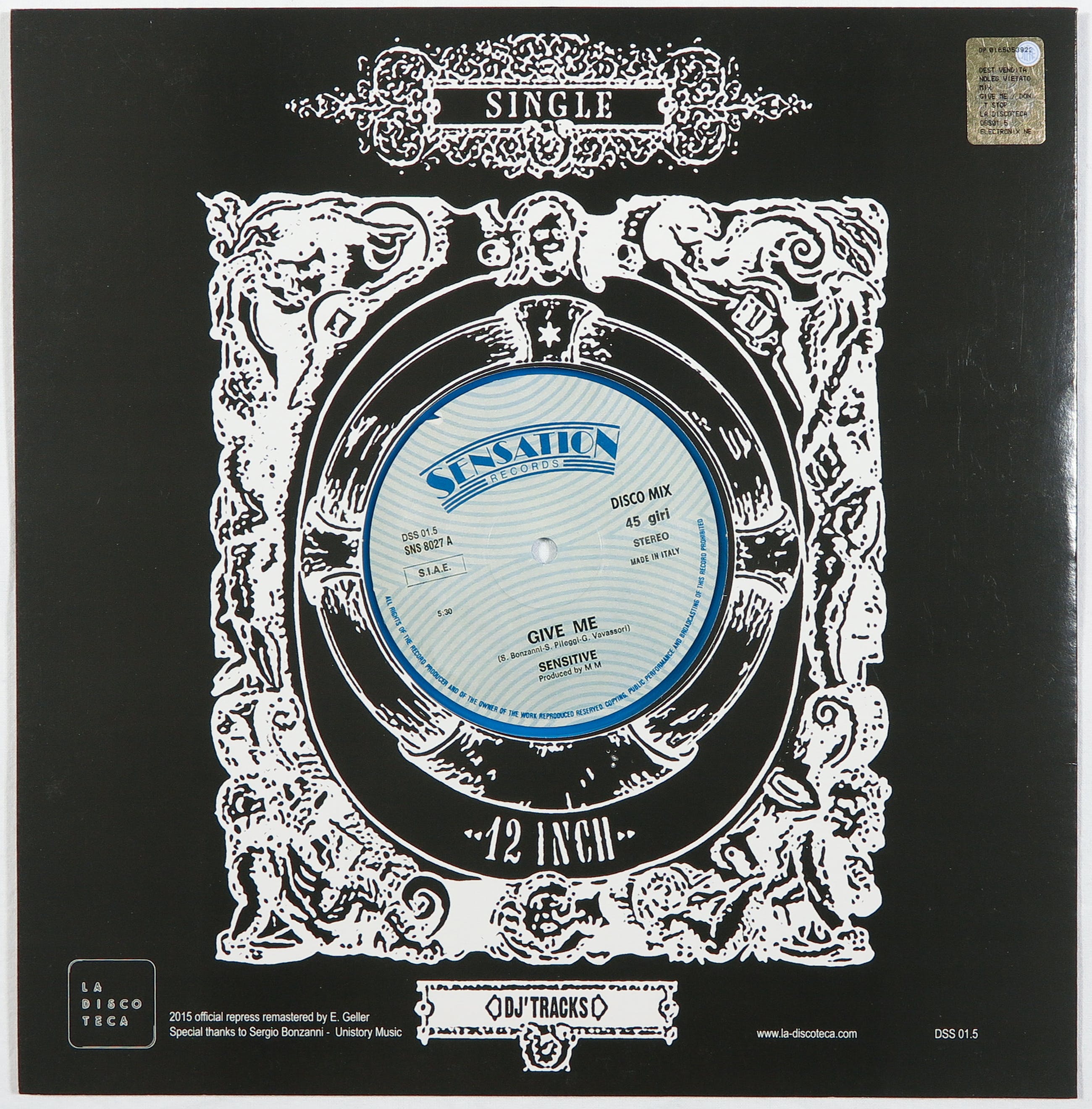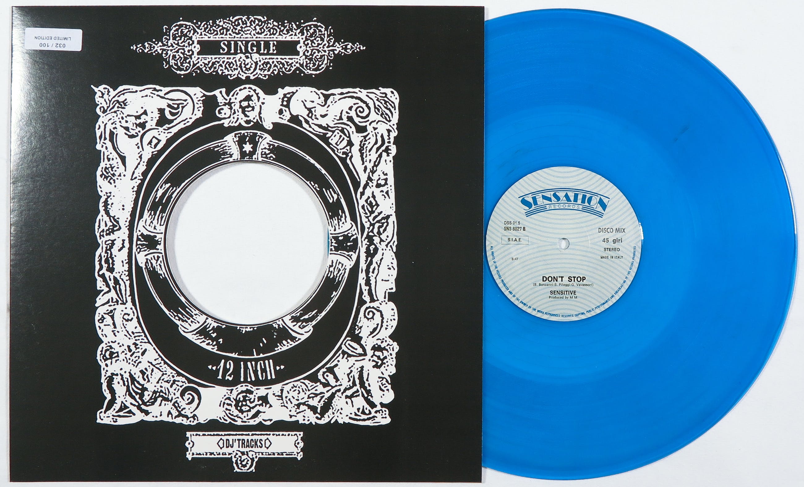 Limited edition album Give me/Don't stop van de Italiaanse band Sensitive. Het genummerde album (32/100) is uitgegeven op blauw vinyl.