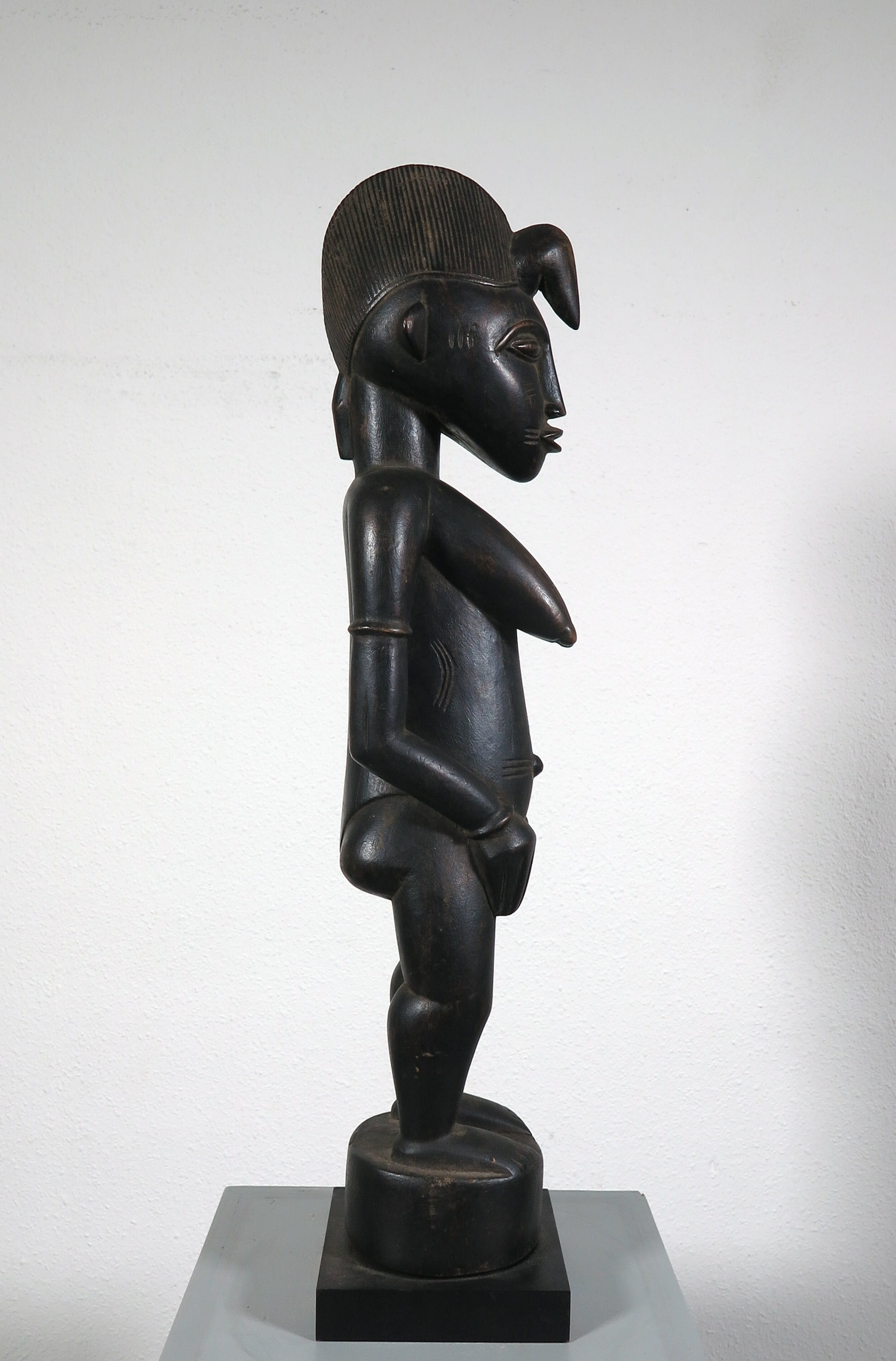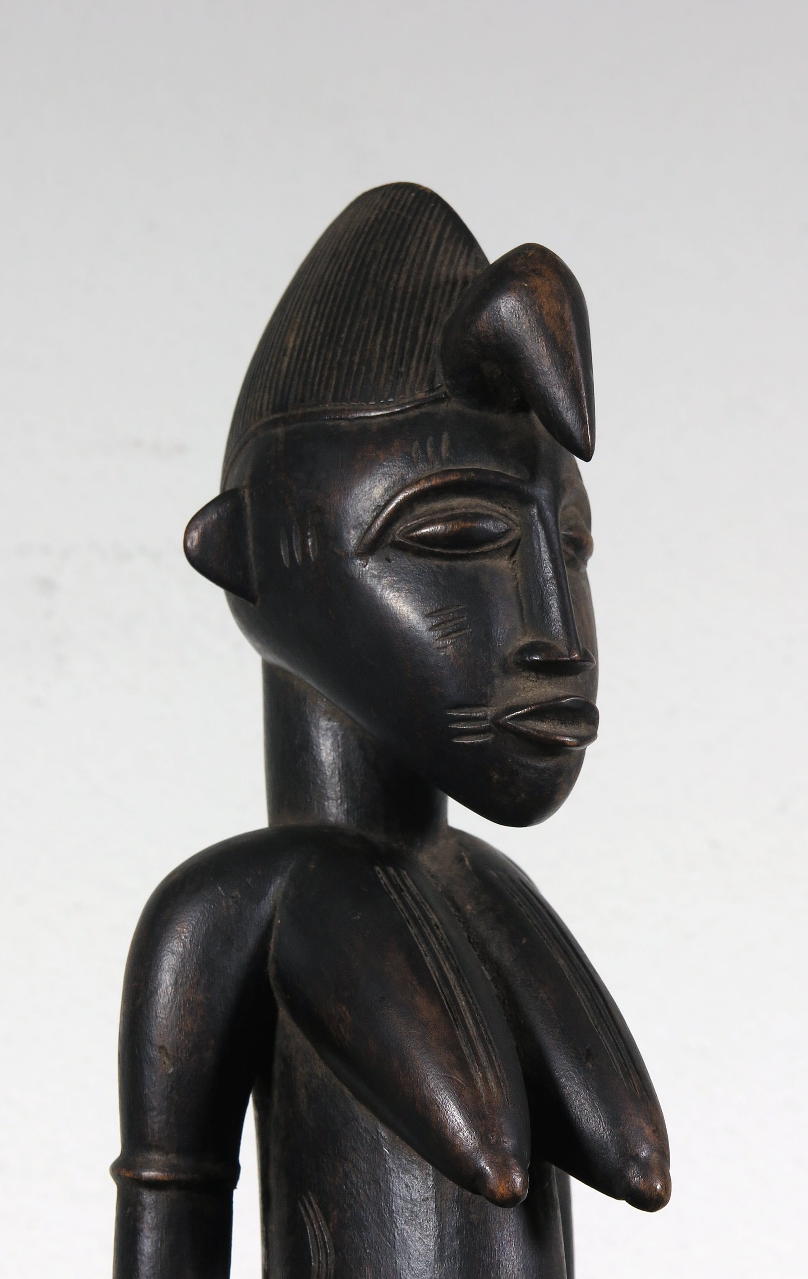 Houten gestoken oud Senufo sculptuur bestaande uit staand vrouwelijk figuur bekroond met hoorn en tatoeages.