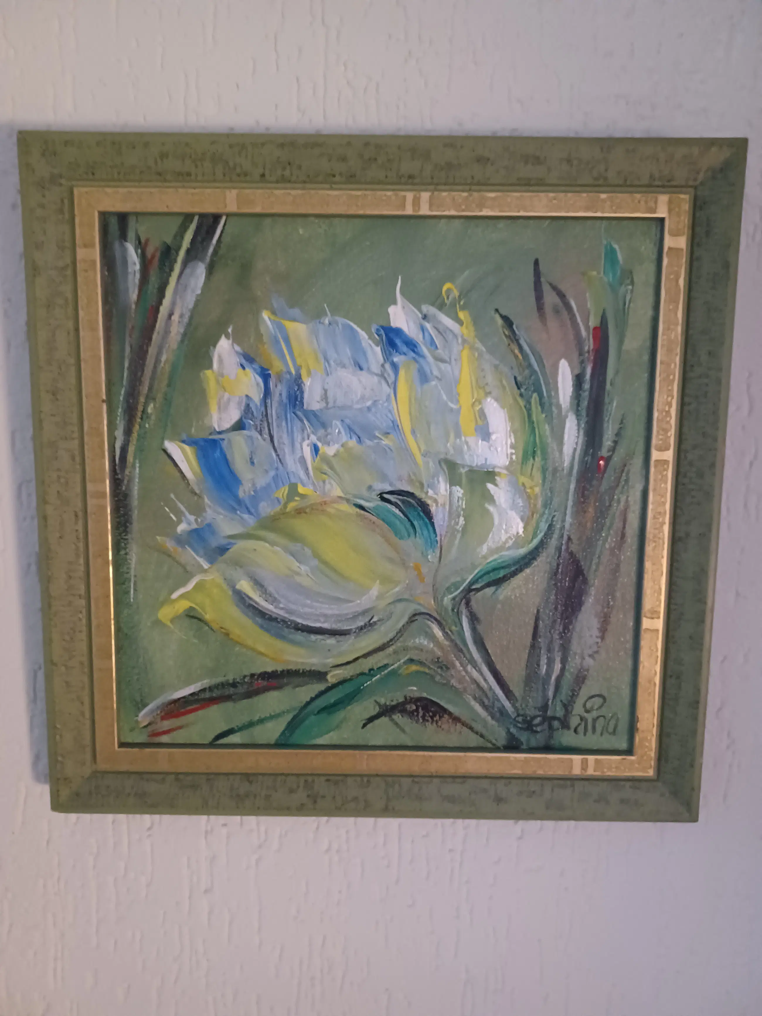 In enkele streken subliem weergegeven vorm van een tulp. Frisse kleuren Fraaie bijpassende lijst