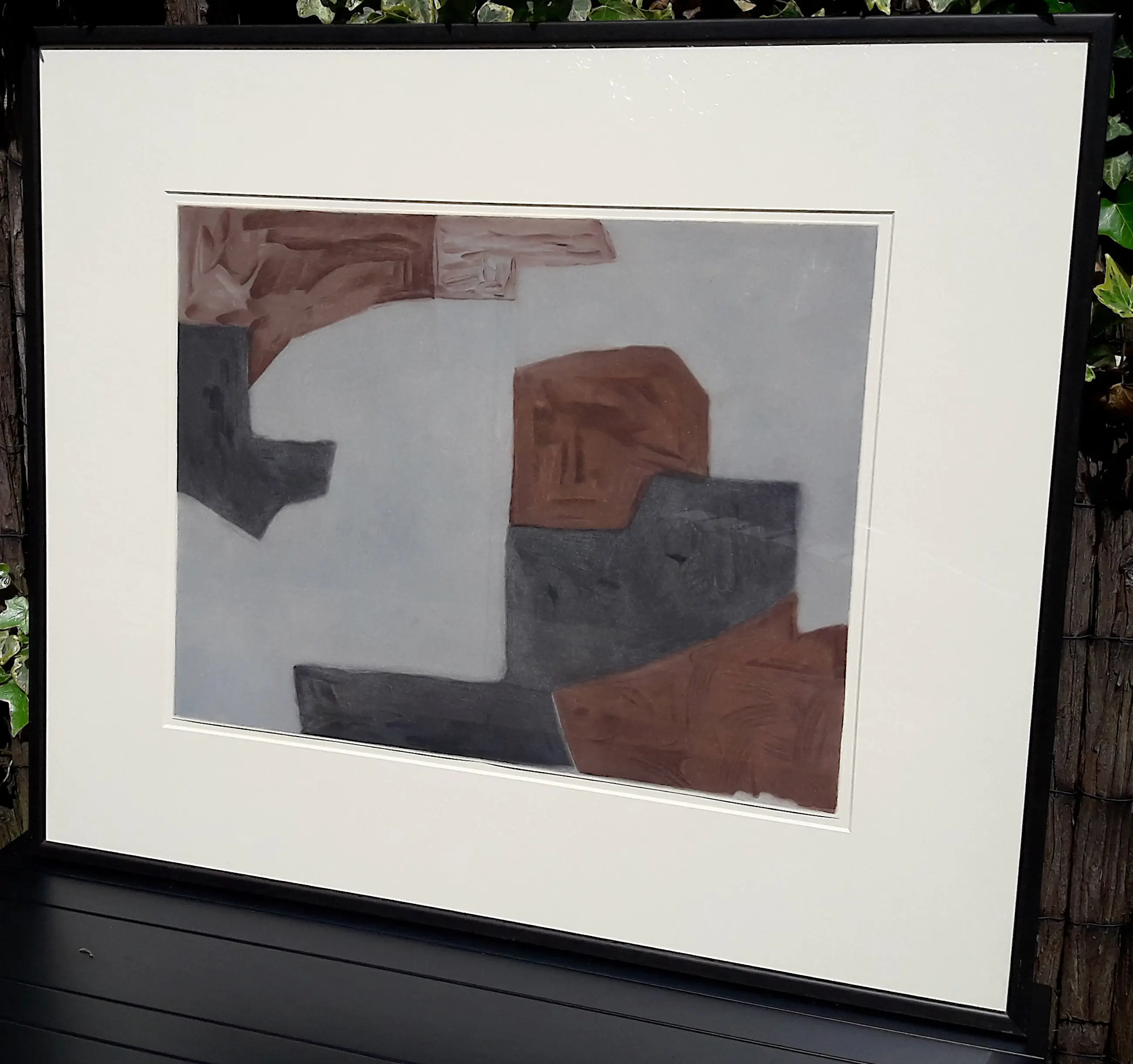 Krachtig signatuurwerk van Serge Poliakoff. Aquatint-ets op papier, niet gesigneerd . In een nette lijst, achter glas en met een gaaf zuurvrij passe-partout. Allemaal in zeer goede staat. Literatuur: Poliakoff - oeuvrecatalogus stempels/prenten, p. 226-227 Nr. XVII.