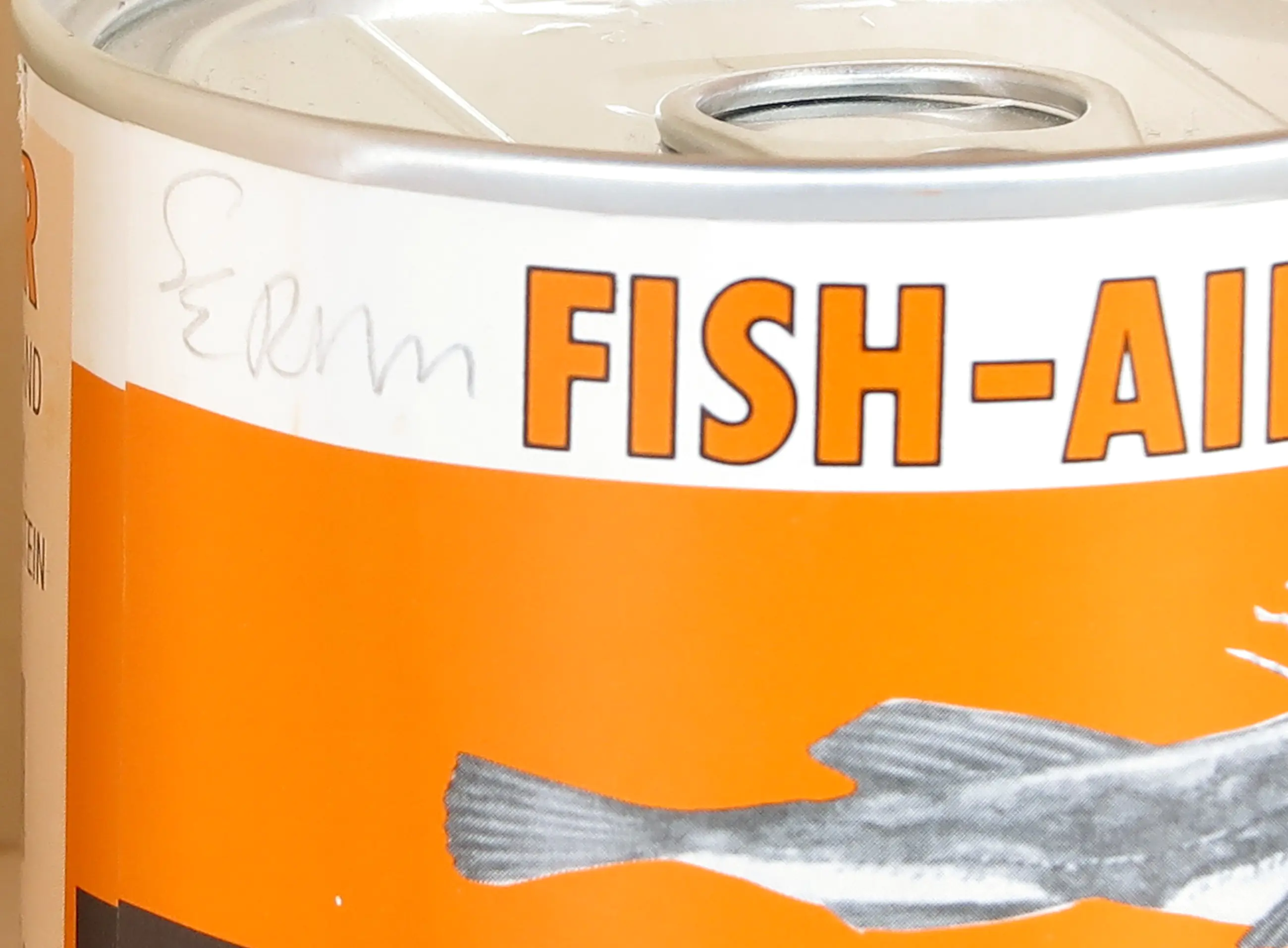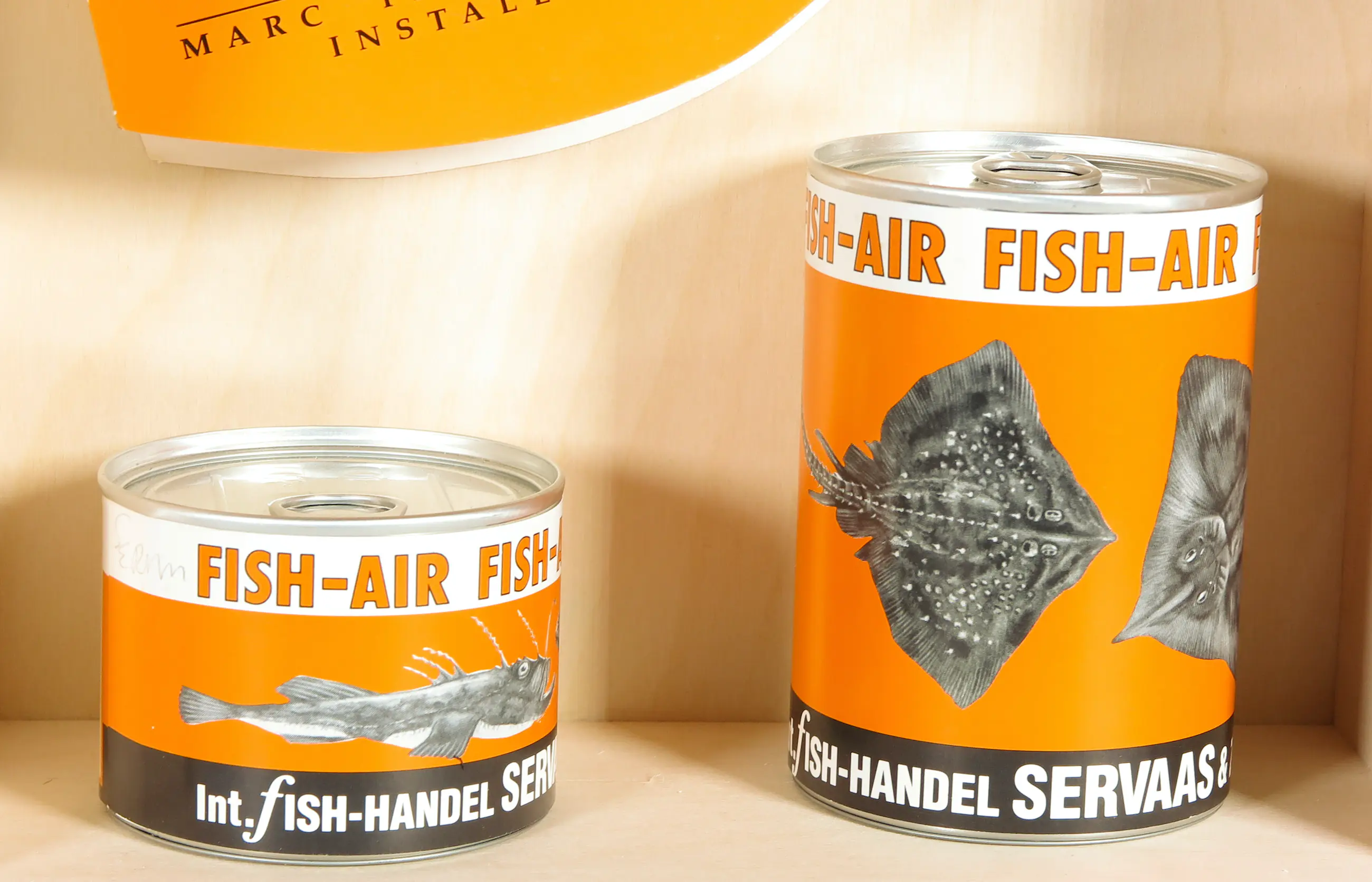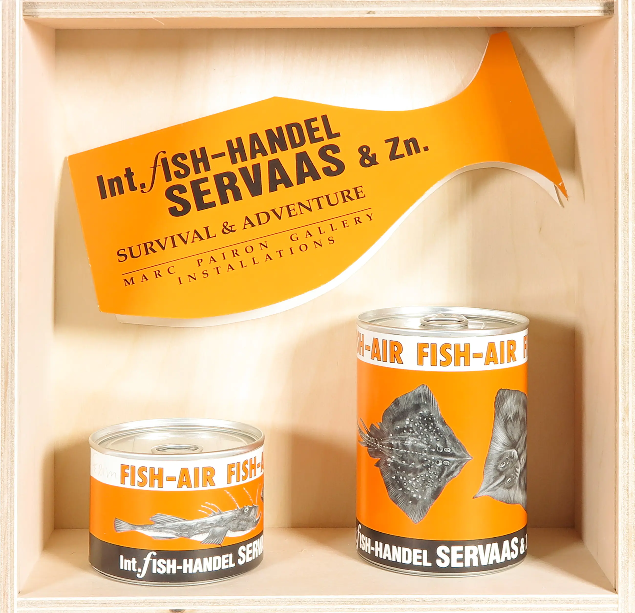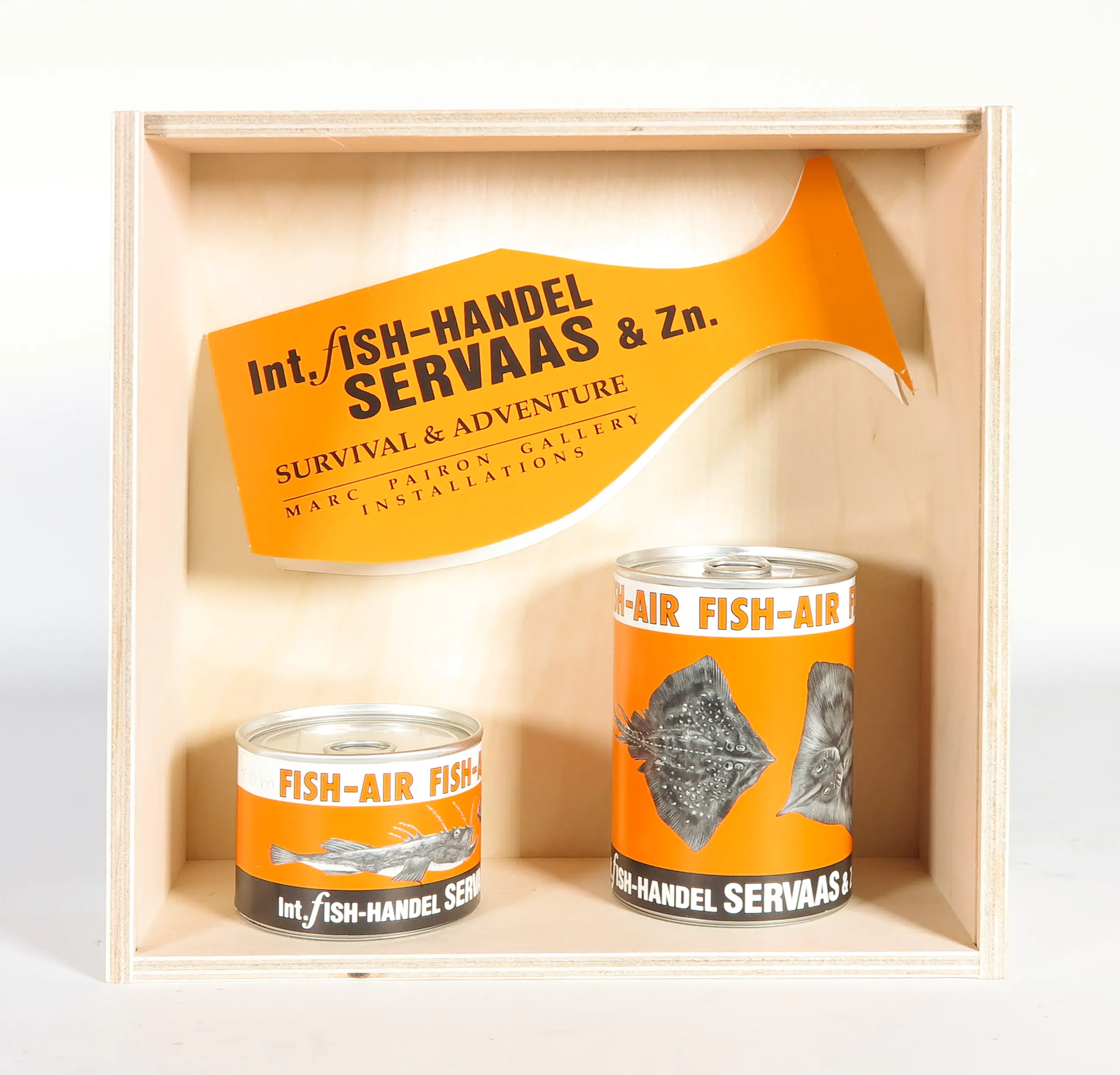 Het betreffen twee blikjes met Fish Air, handgesigneerd door kunstenaar Servaas. Daarnaast is er een originele uitnodiging toegevoegd van de expositie waarop Servaas zijn blikjes met vislucht introduceerde bij het Belgische Marc Pairon Gallery Installations te Knokke. De blikjes zitten bevestigd in een houten kastje met glasplaat. Het glas kan er eventueel uitgeschoven worden. De gegeven maten zijn van het houten kastje.