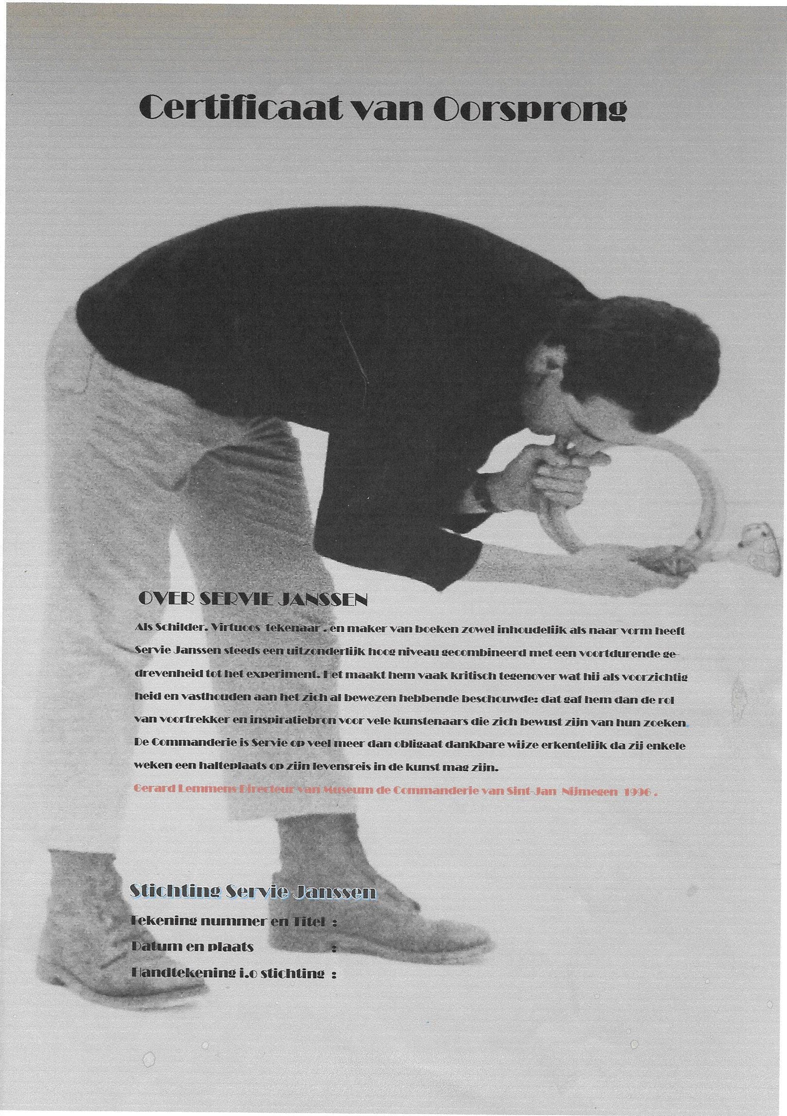 De koper ontvangt bij het werk een Certificaat van Oorsprong en een Curriculum over zijn Kunstenaars leven.