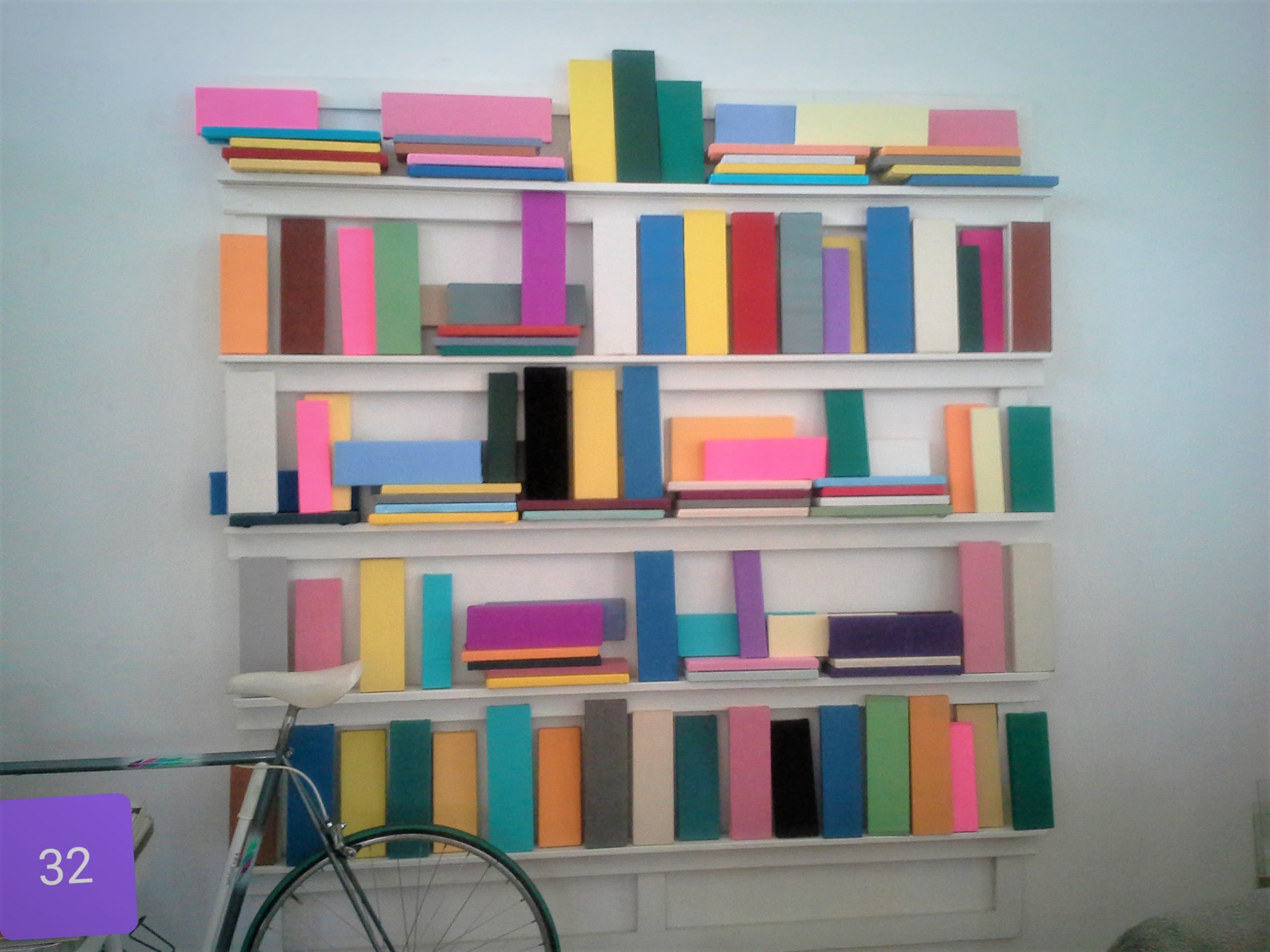Naast het rek bestaat het werk uit 120 gekleurde blokjes van 32x10x2 cm opgeborgen in een separate trolley.