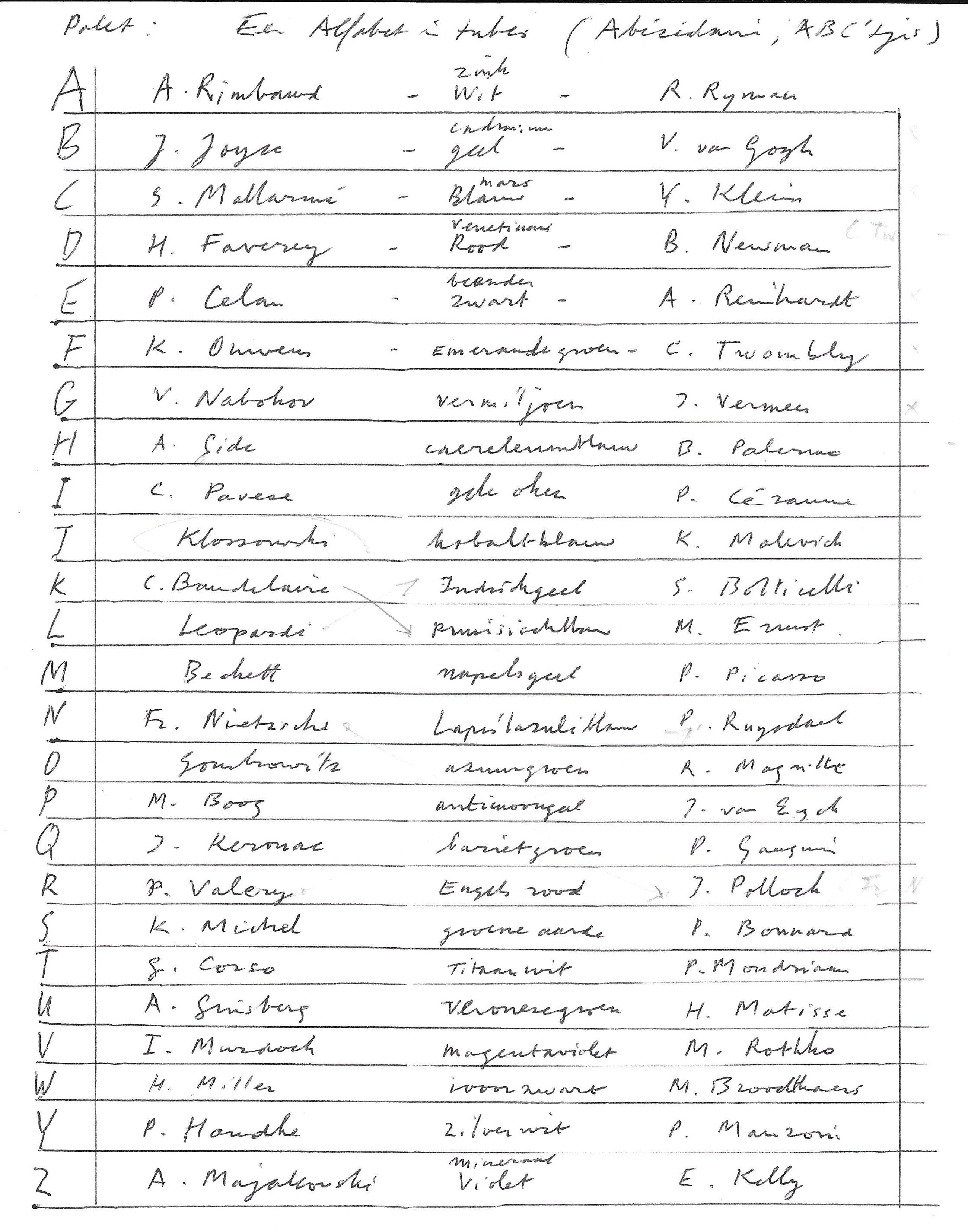 Tevens word meegeleverd een kleuren alfabet gebaseerd op voorkeur kleuren van Kunstenaars en Philosofen uit het zelfde Tijdperk. Hiermede en met de gekleurde blokjes te gebruiken kan een compositie op tekst gemaakt worden!