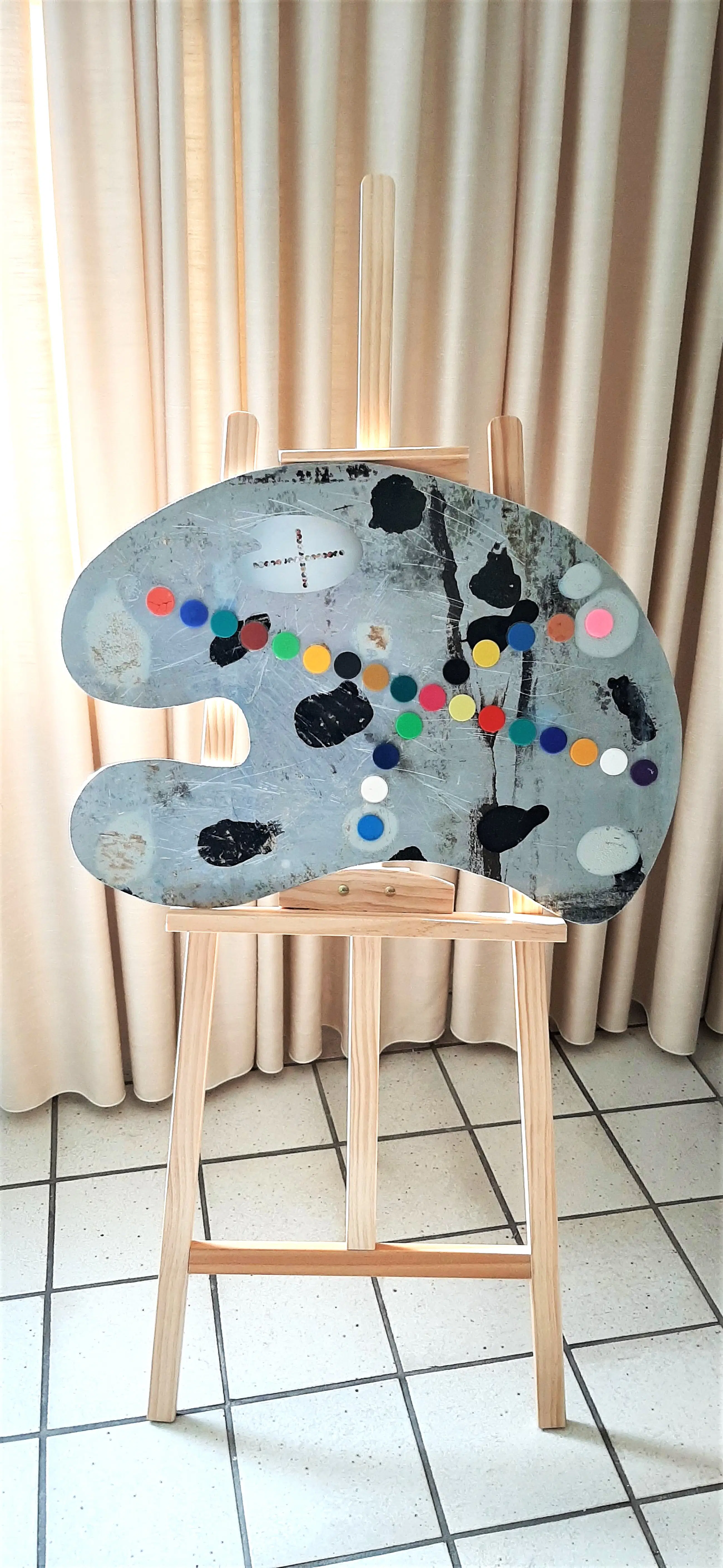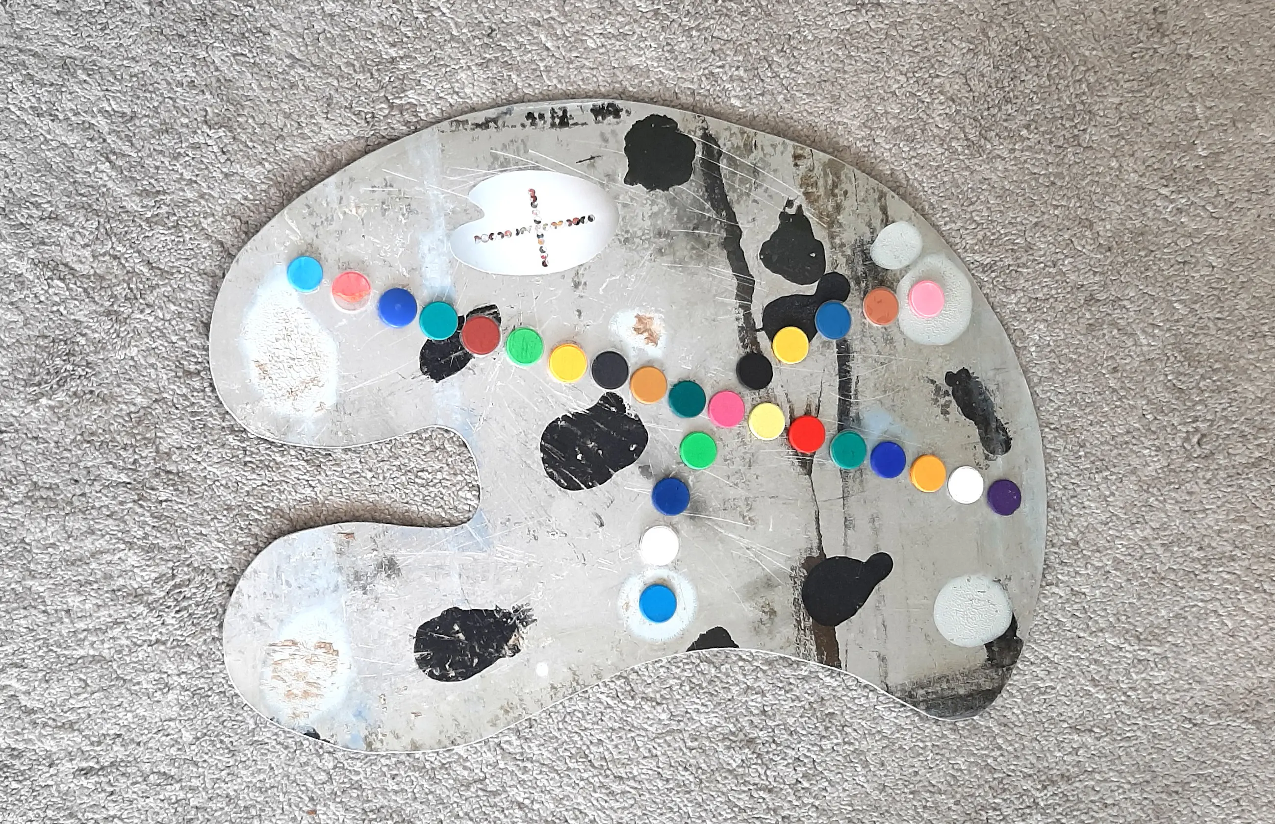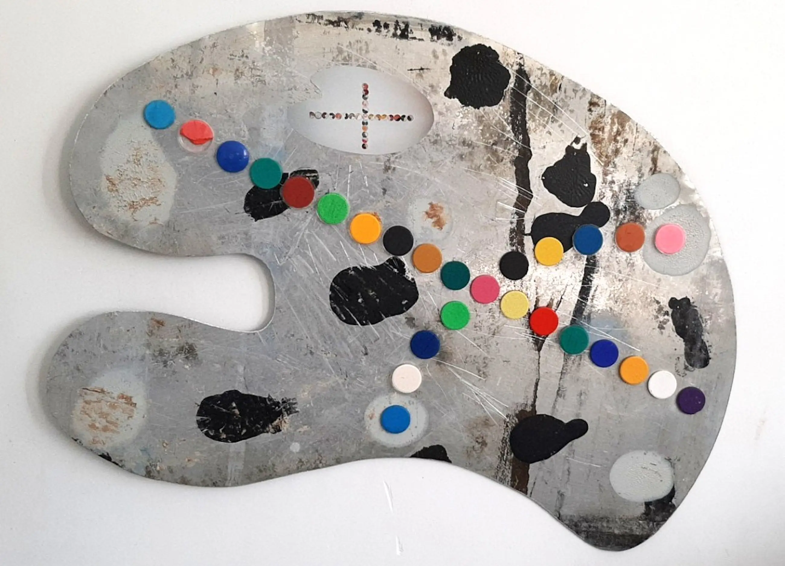 Het "Palet" is met de hand uitgezaagd uit 1mm dik Aluminium plaat . Het kleuren kruis is gemaakt van opgeplakte waterverf cupjes .