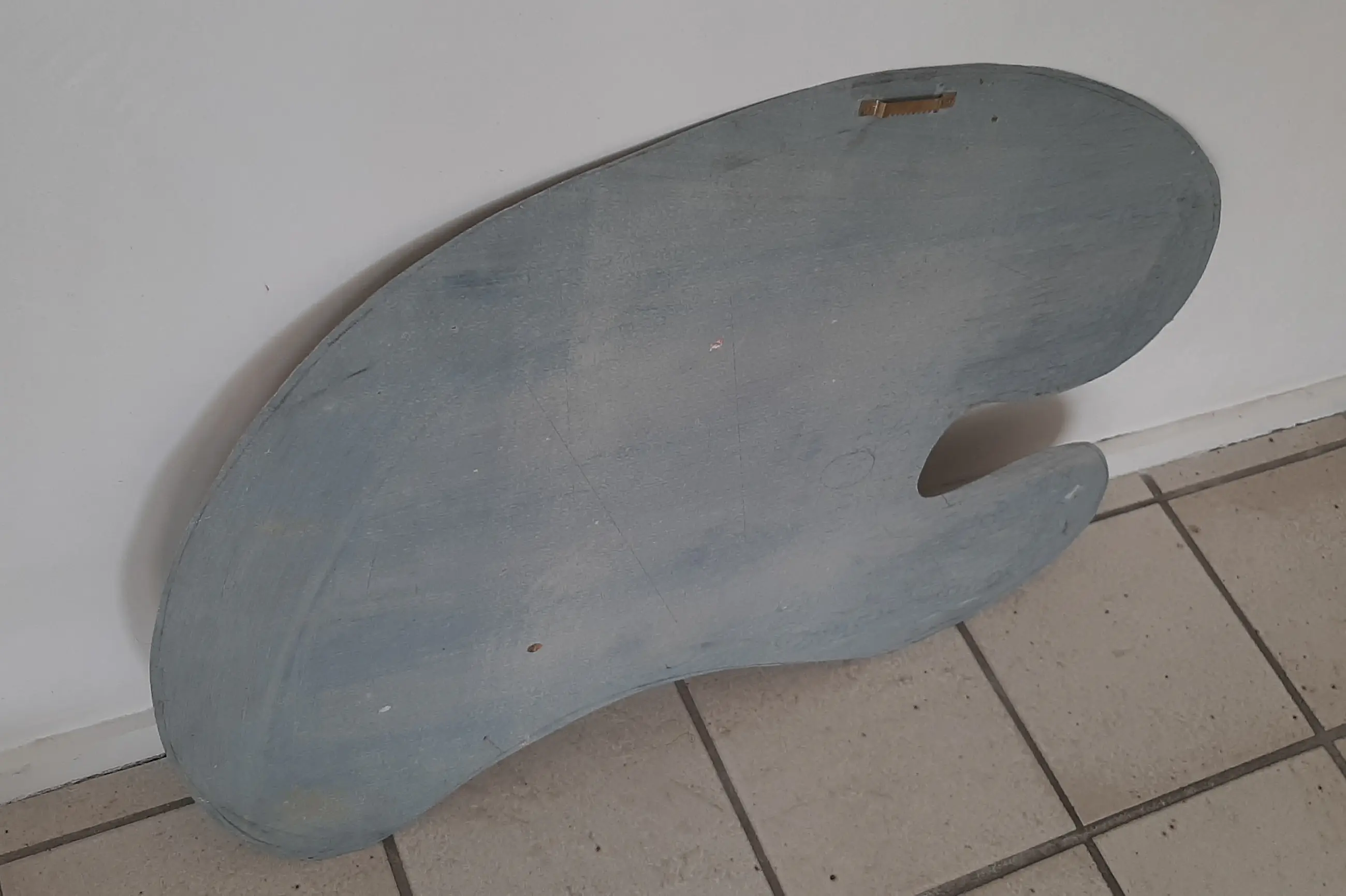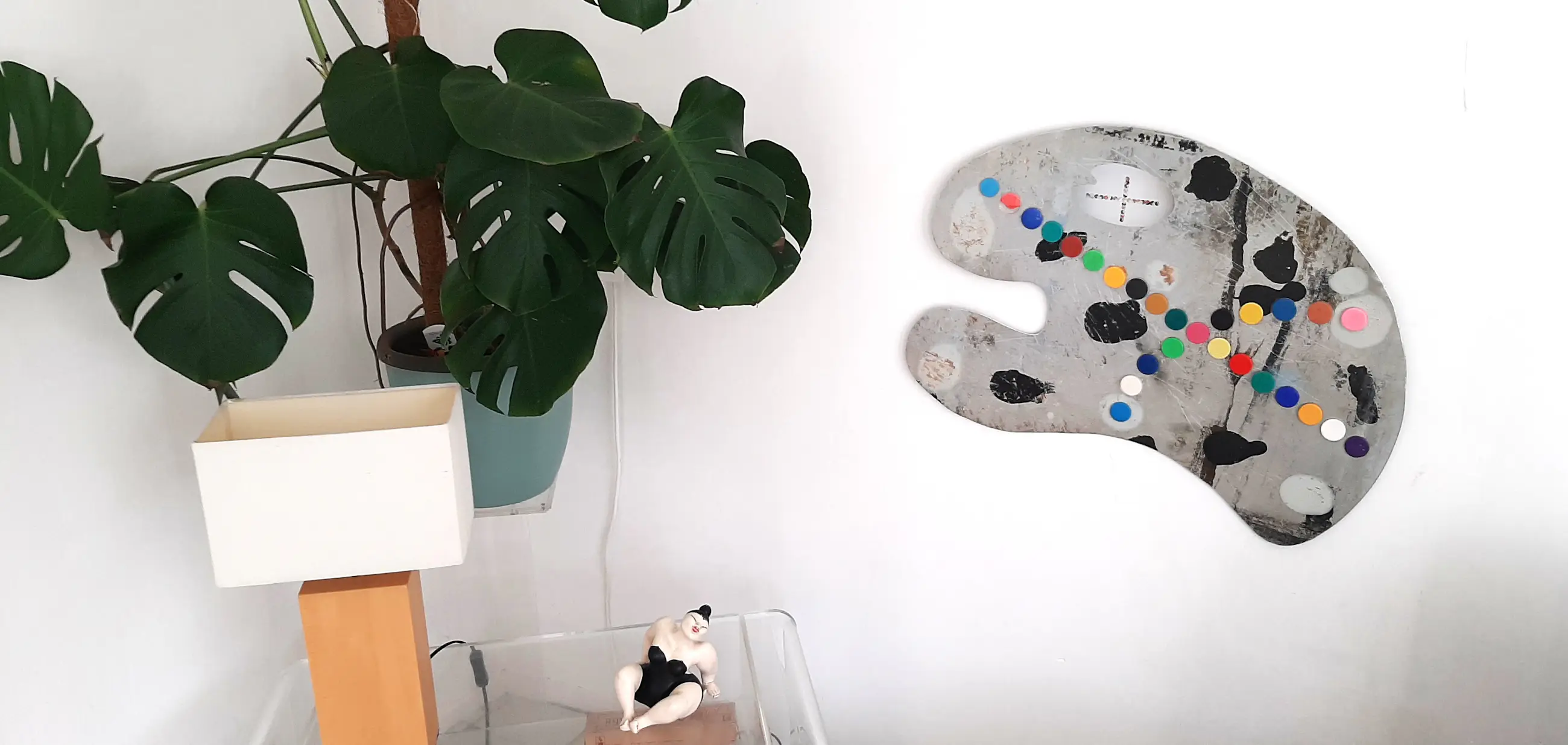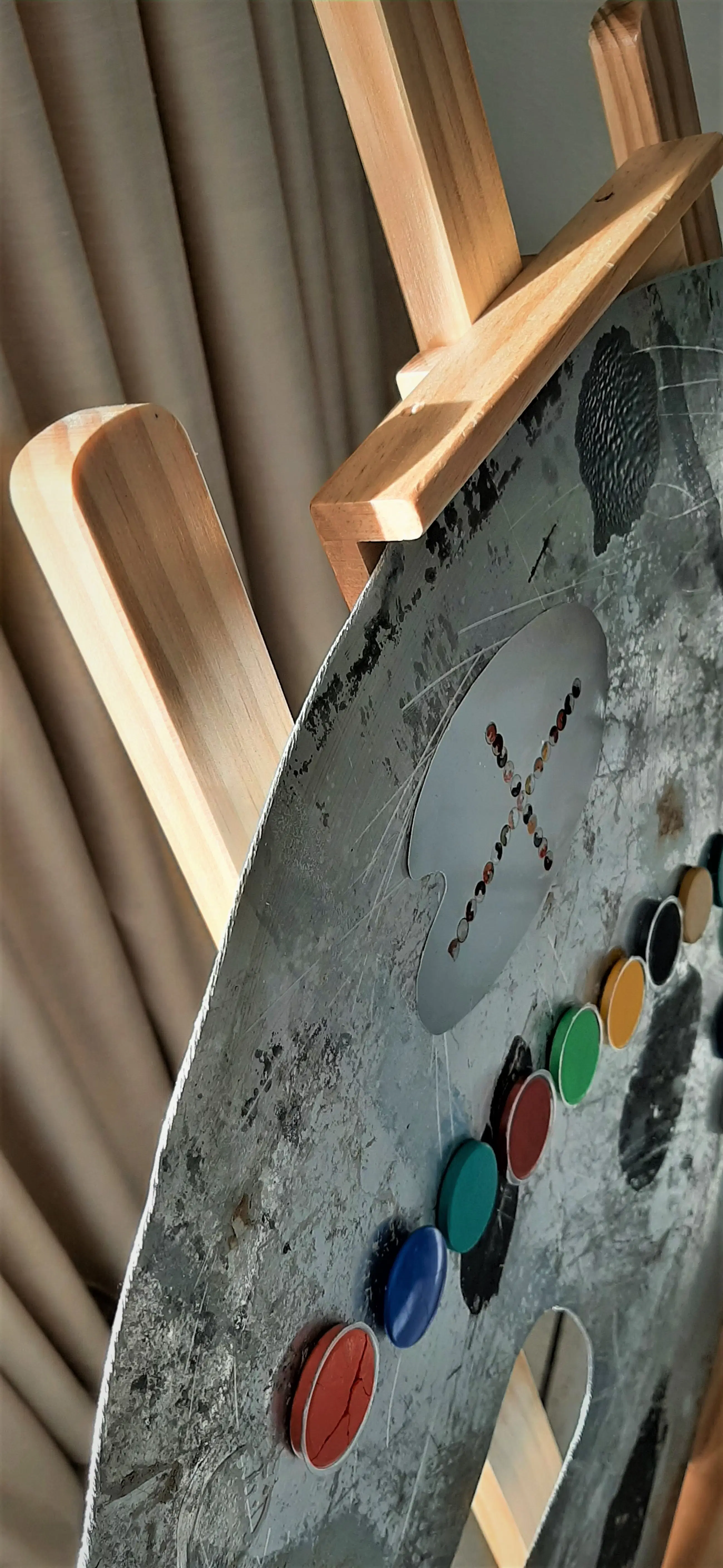 Het "Palet" is met de hand uitgezaagd uit 1mm dik Aluminium plaat . Het kleuren kruis is gemaakt van opgeplakte waterverf cupjes .