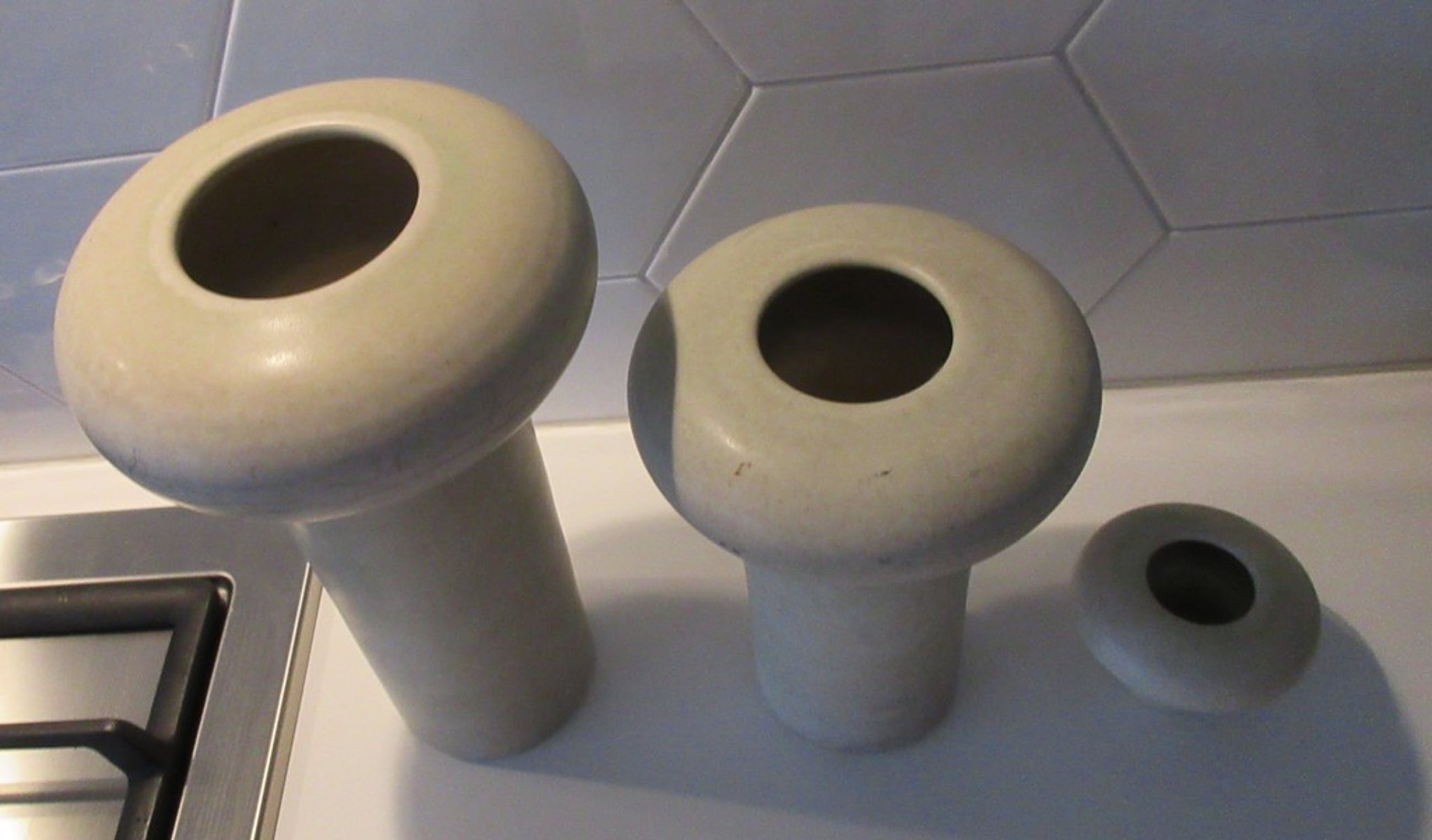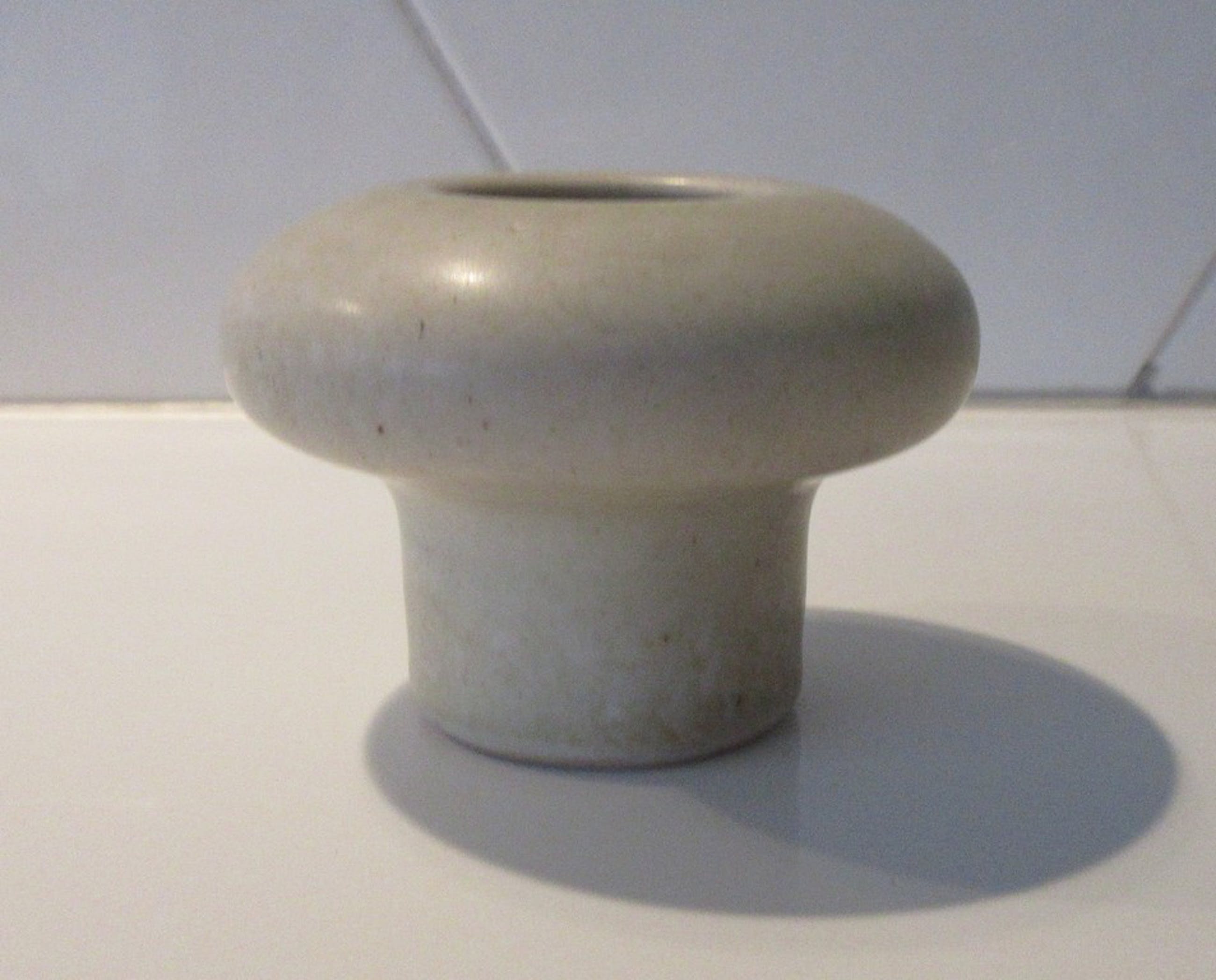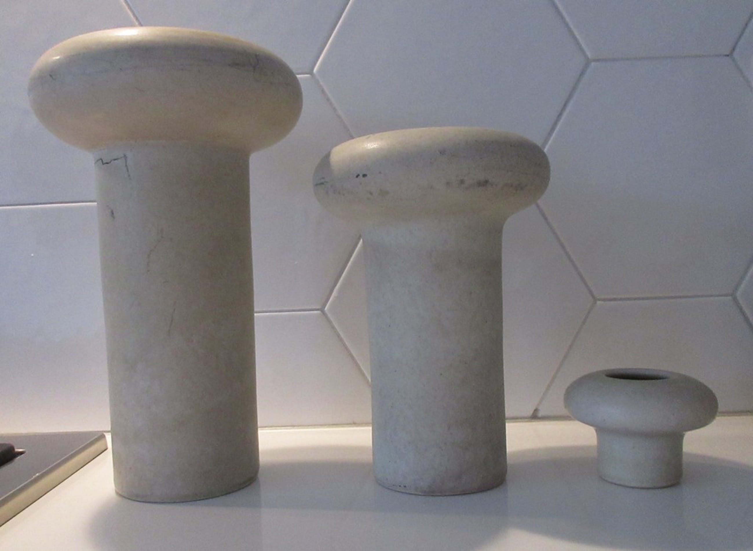Set van drie studio aardewerken vazen van Ecri Katwijk gesigneerd KE. De vazen hebben een paddestoel vorm en zijn wit/beige/groen mat geglazuurd. Wel wat krasjes op het glazuur, verder geen beschadigingen.