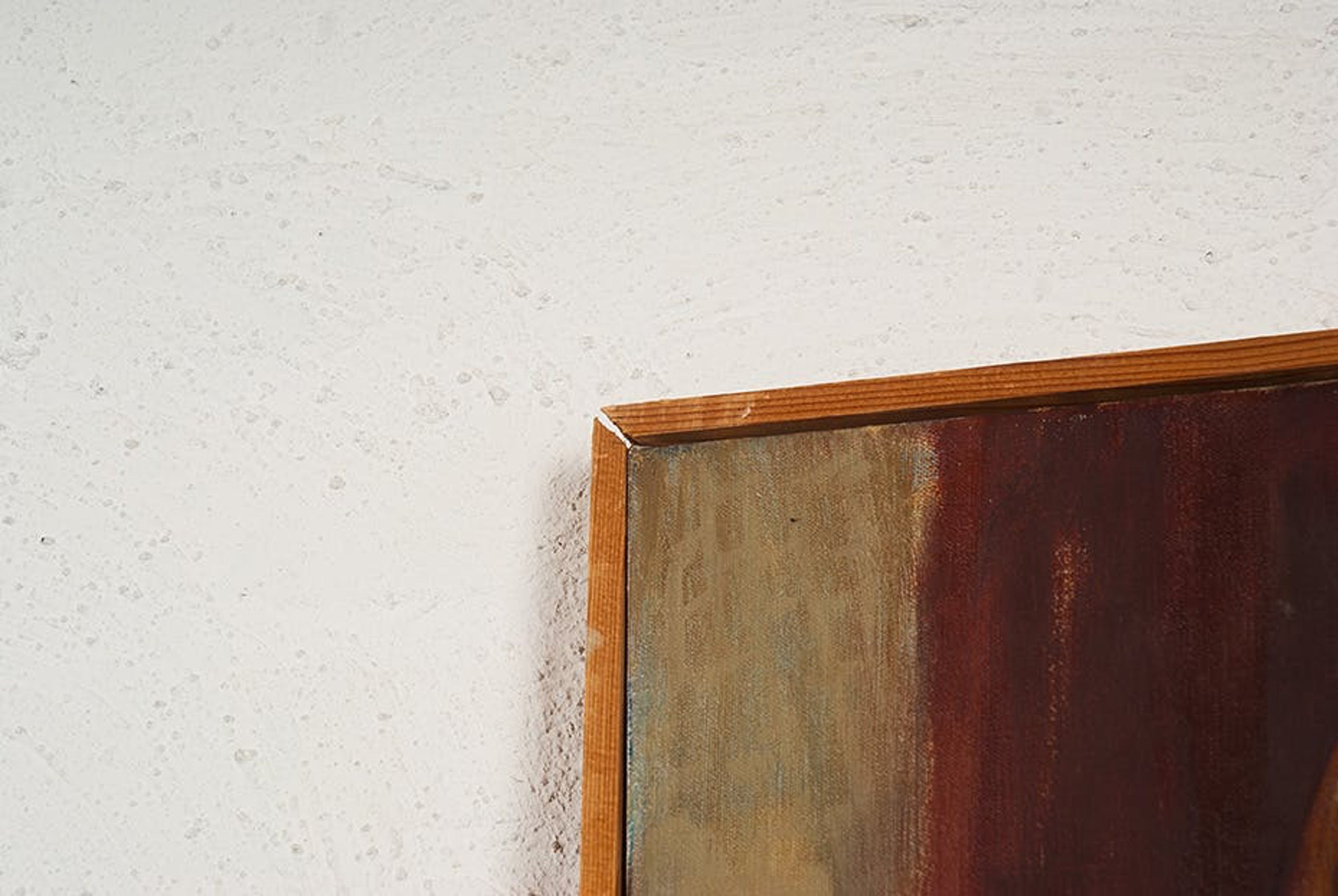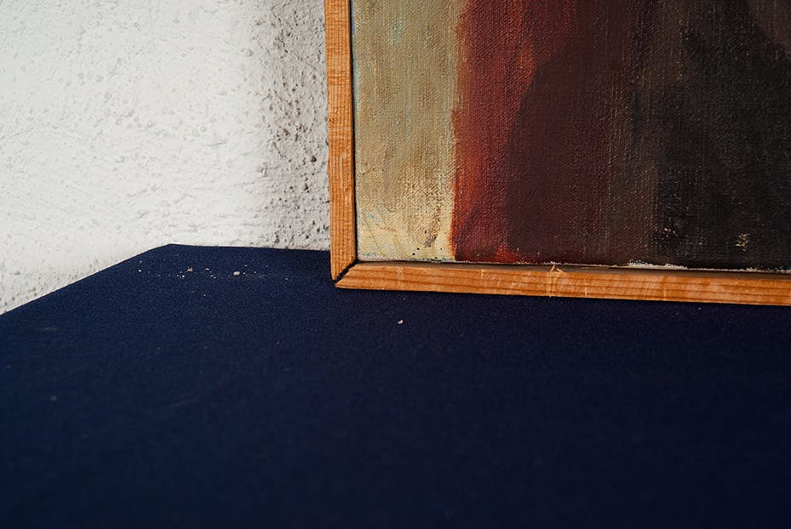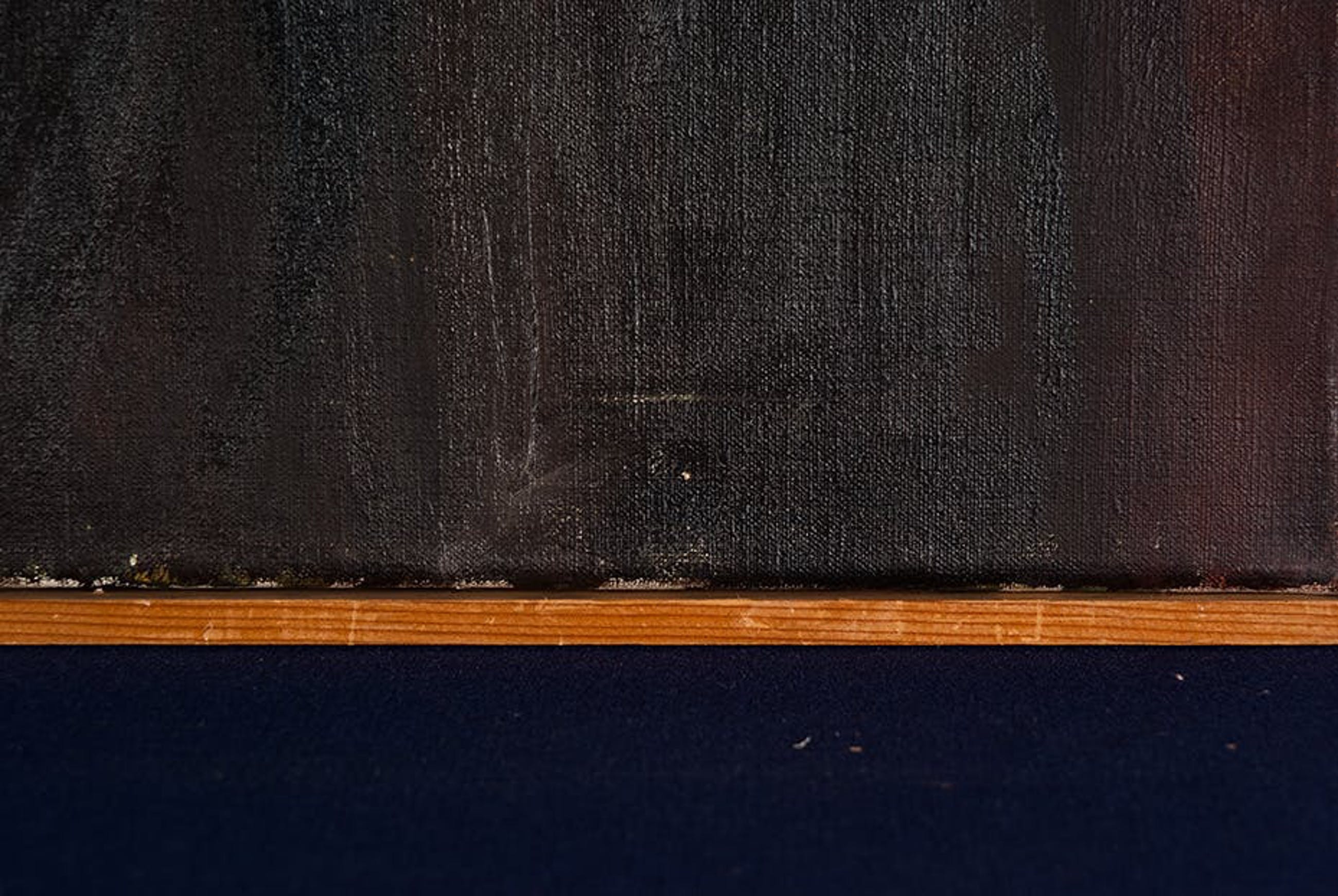 | Er zijn verschillende spetters van witte en blauwe transparante verf op de oppervlakte van het kunstwerk. Tevens zijn er verschillende kleine krassen en deuken. Op de achter- en onderzijde van de lijst zijn grote hoeveelheid zwart/donkerblauwe spetters. Daarnaast lijken de hoeken van de omlijsting niet helemaal te verbinden. | |