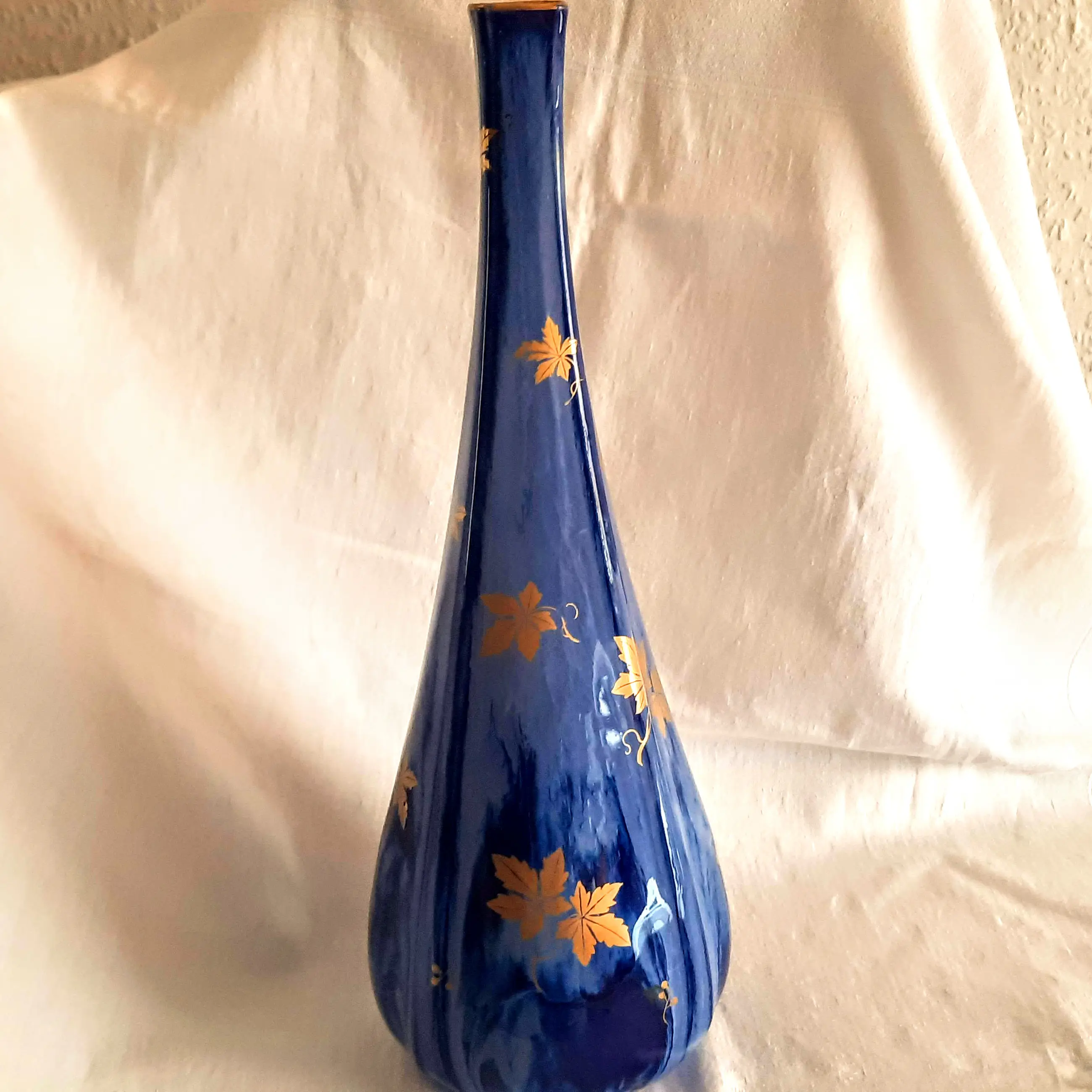 De Art Nouveau vaas heeft een bolvorm, een slanke hals met een smalle opening, is middelblauw van kleur met donkere accenten en een decoratie van gouden bladeren -