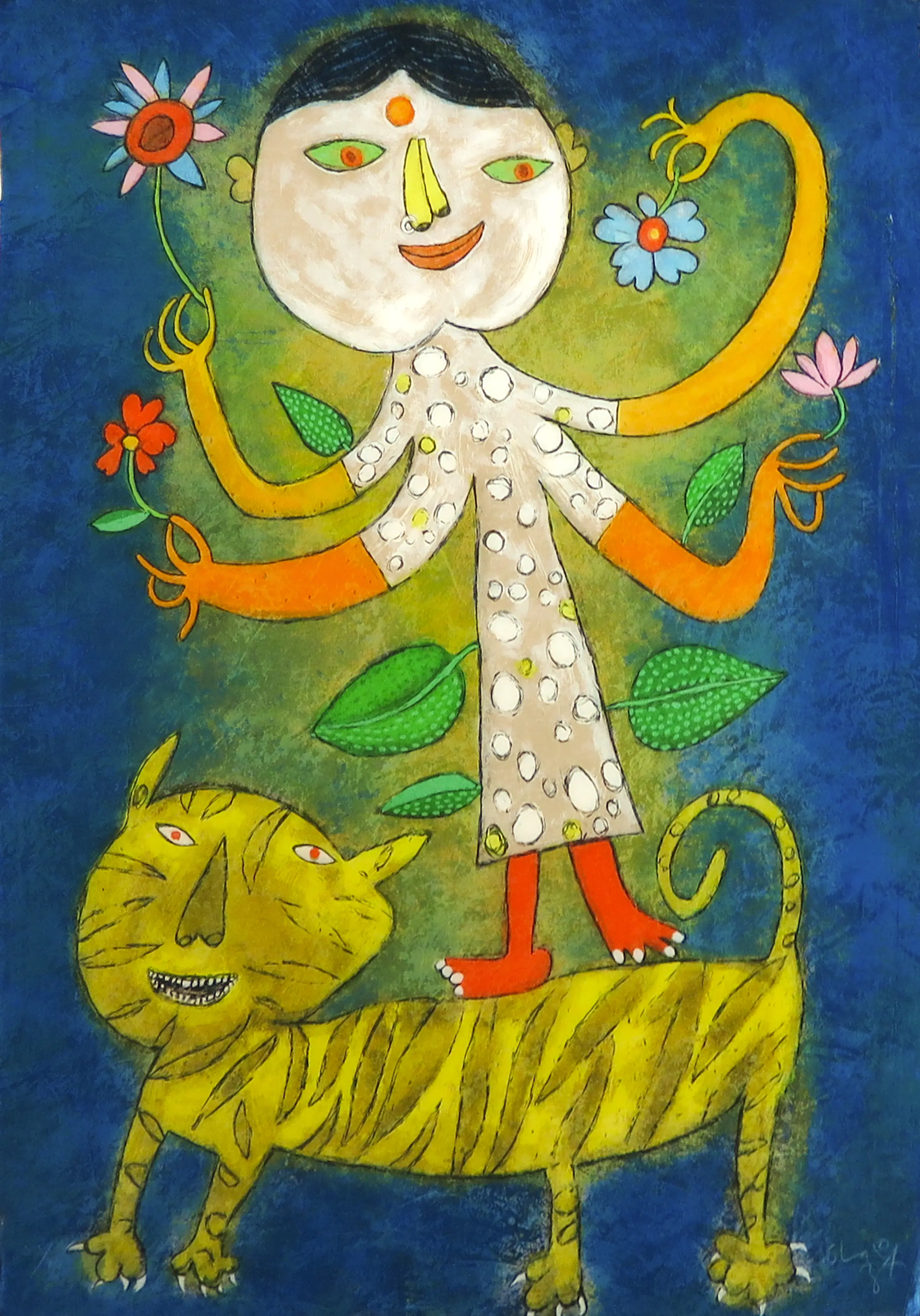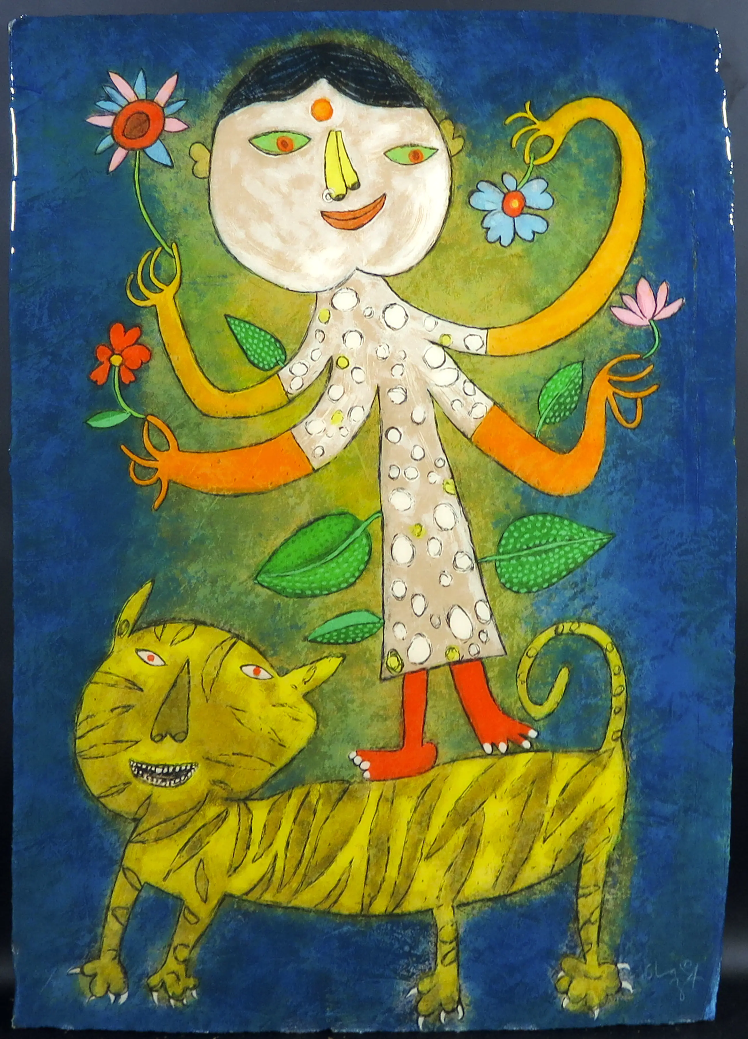 Mooie zeefdruk op papier van Shahid Parvez, die is bevestigd op dibond met ophangsysteem. Ter bescherming is er een hoogglans epoxylaag over het papier gegoten.