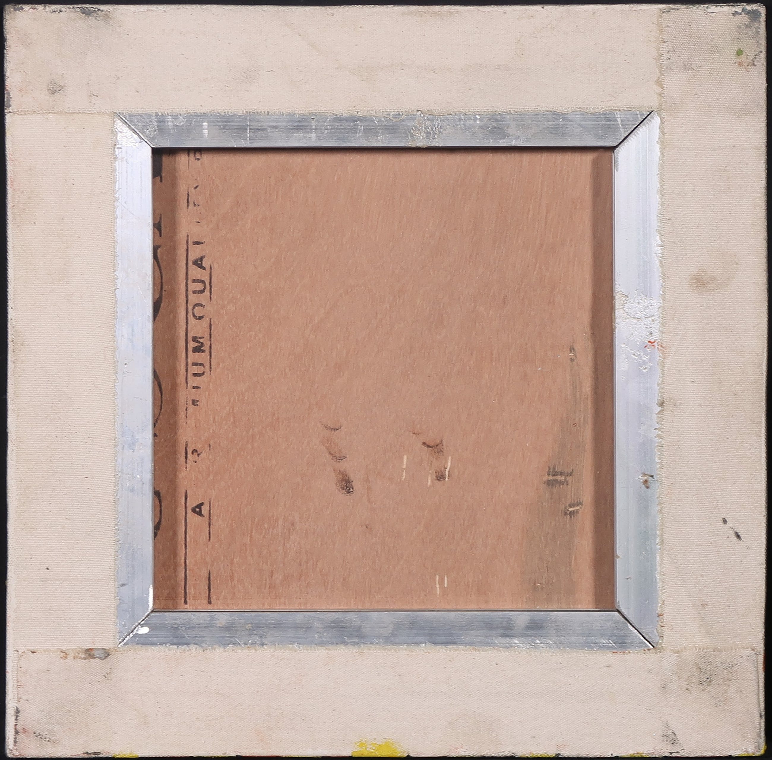 Zeefdruk op doek, bevestigd op houten drager en spieraam.