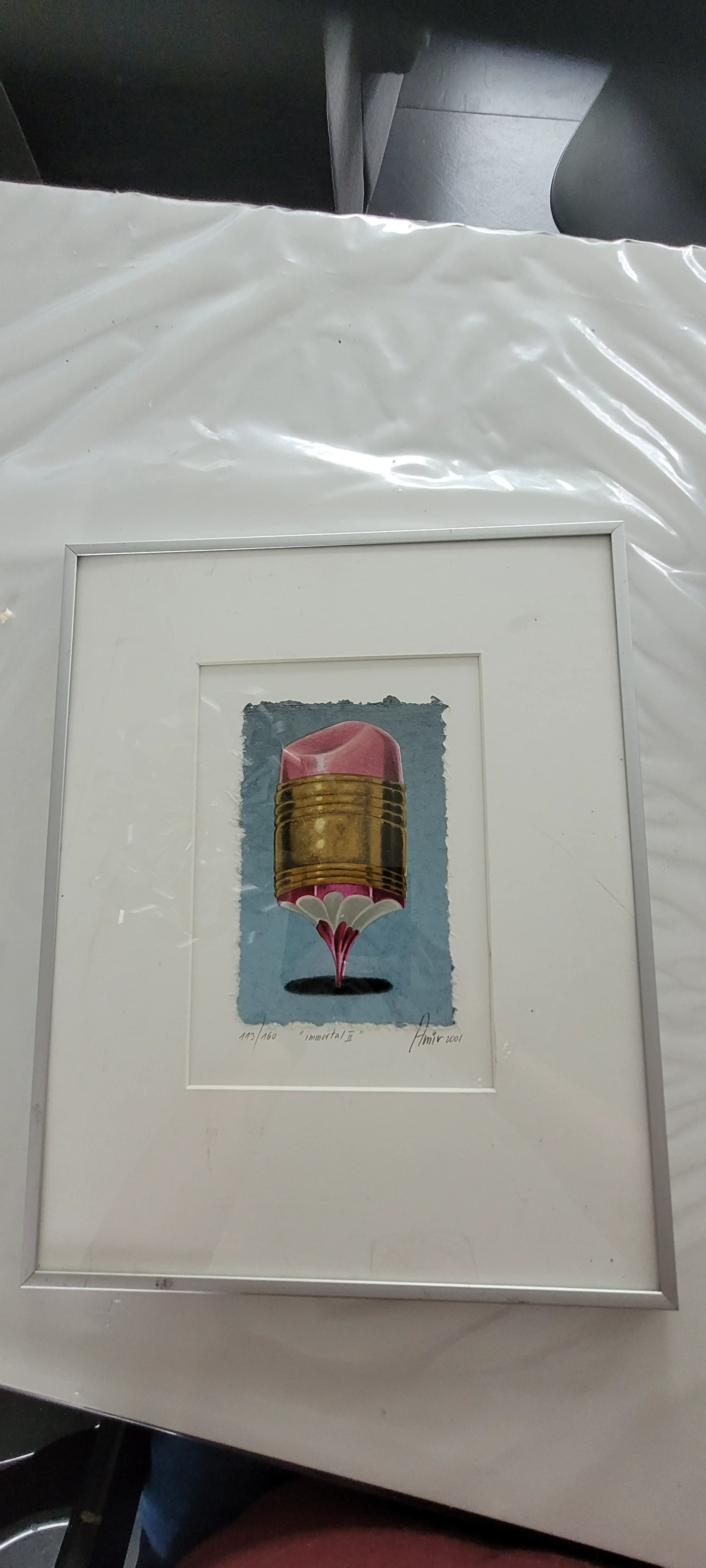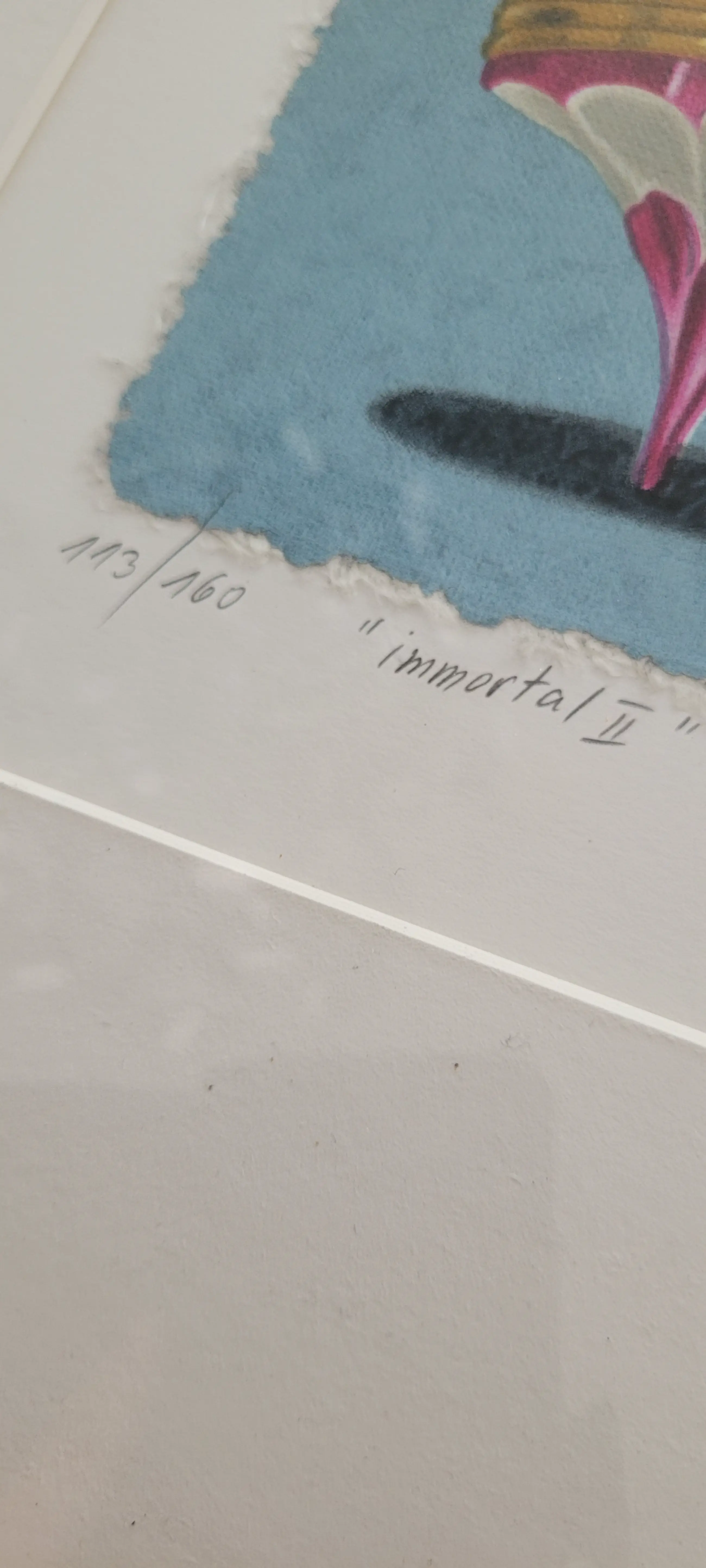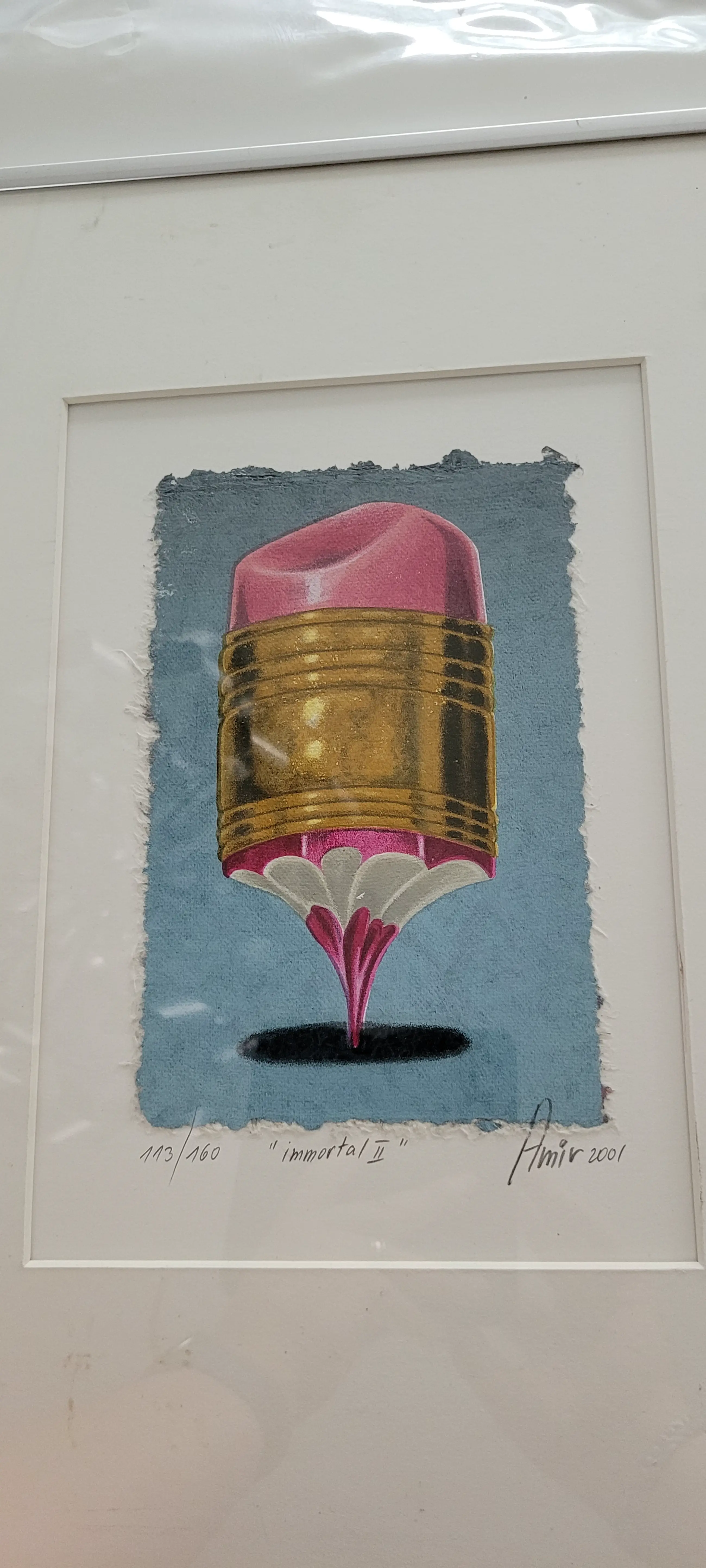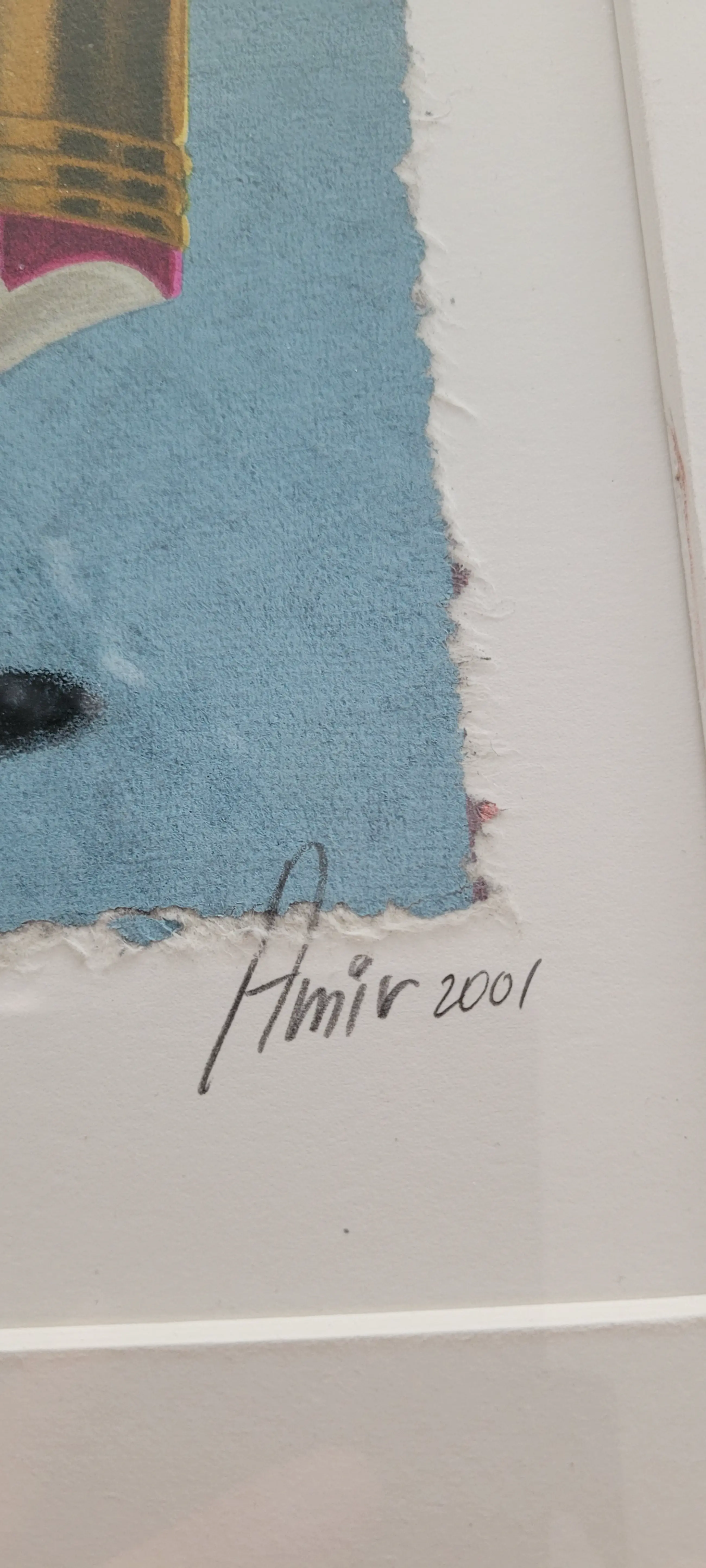 Verfijnde humoristische zeefdruk van Sharon Amir uit 2001. Is gedrukt op een speciaal soort papier met gescheurde randen, daarna weer gelijmd op stevig karton