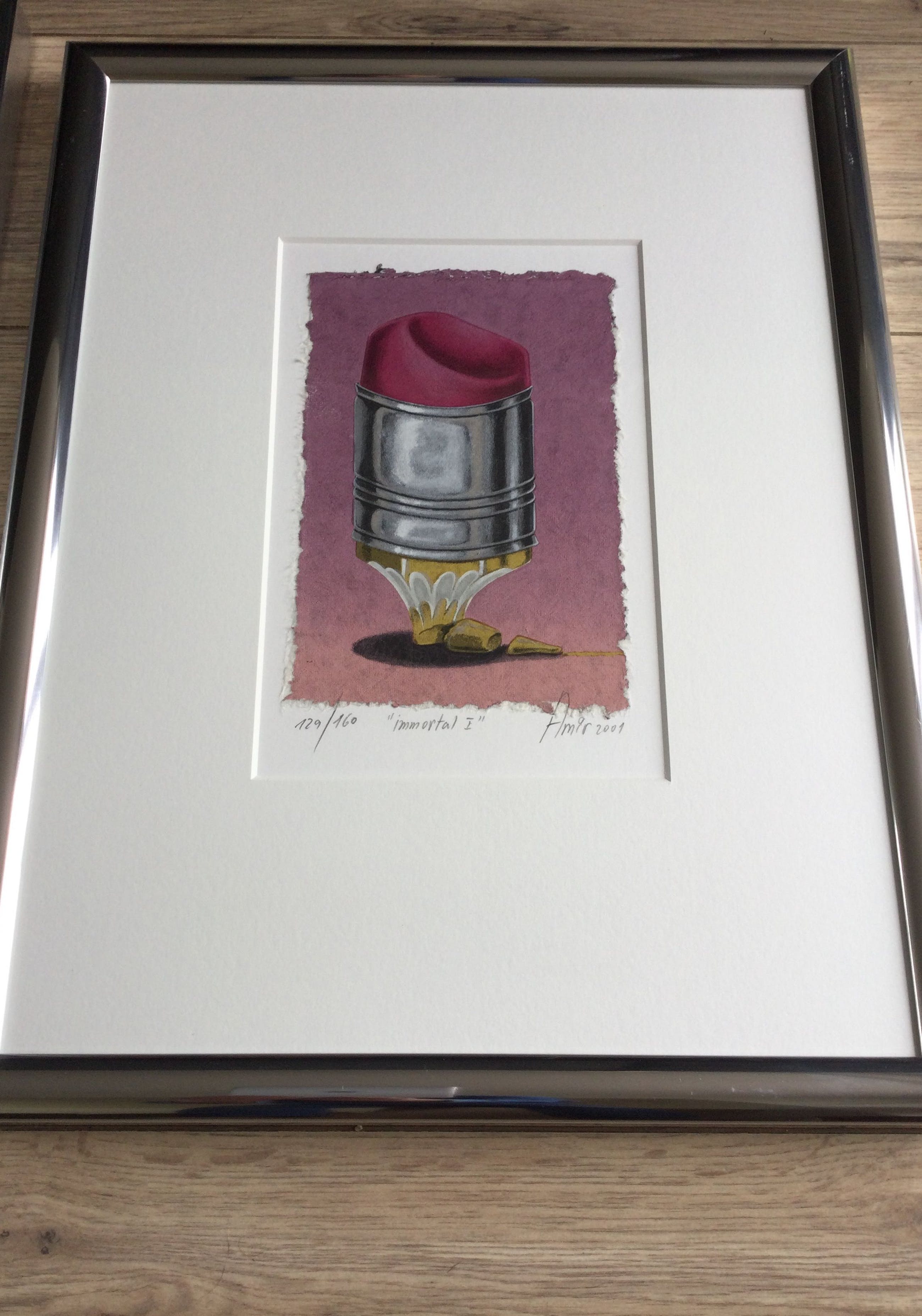 Het werk zit in een kostbare, mooie en zware chromen lijst