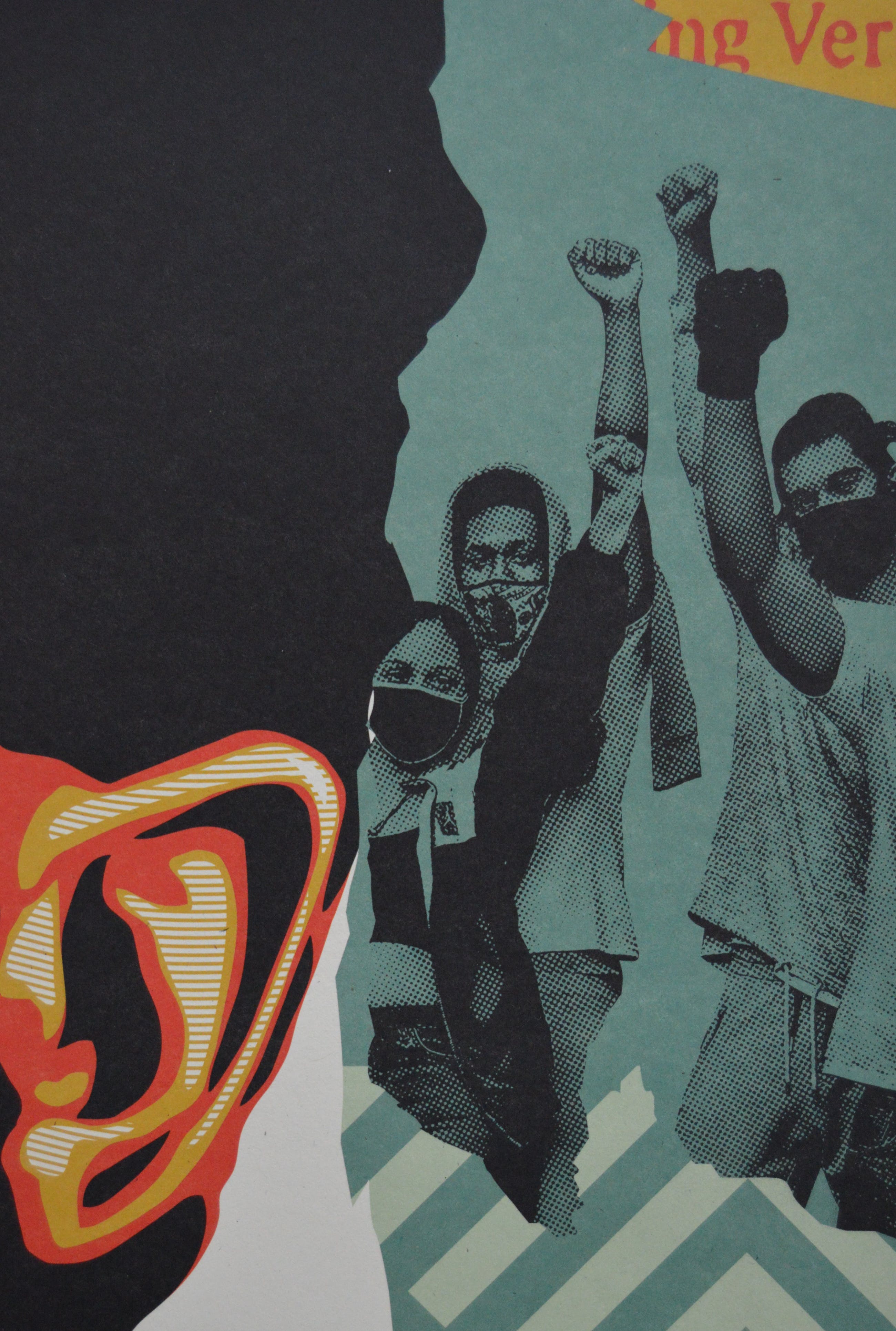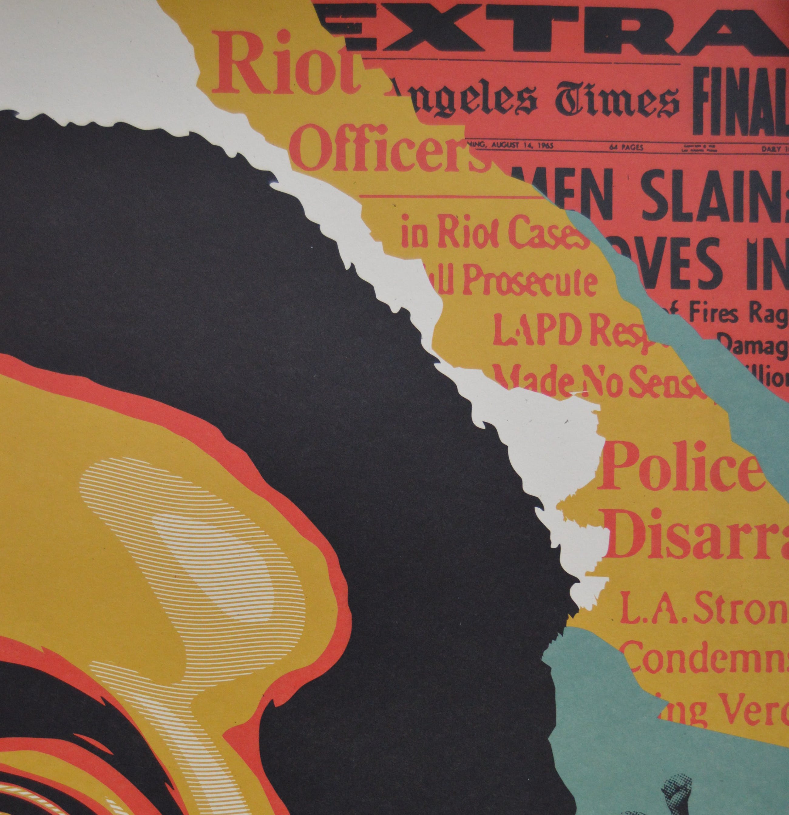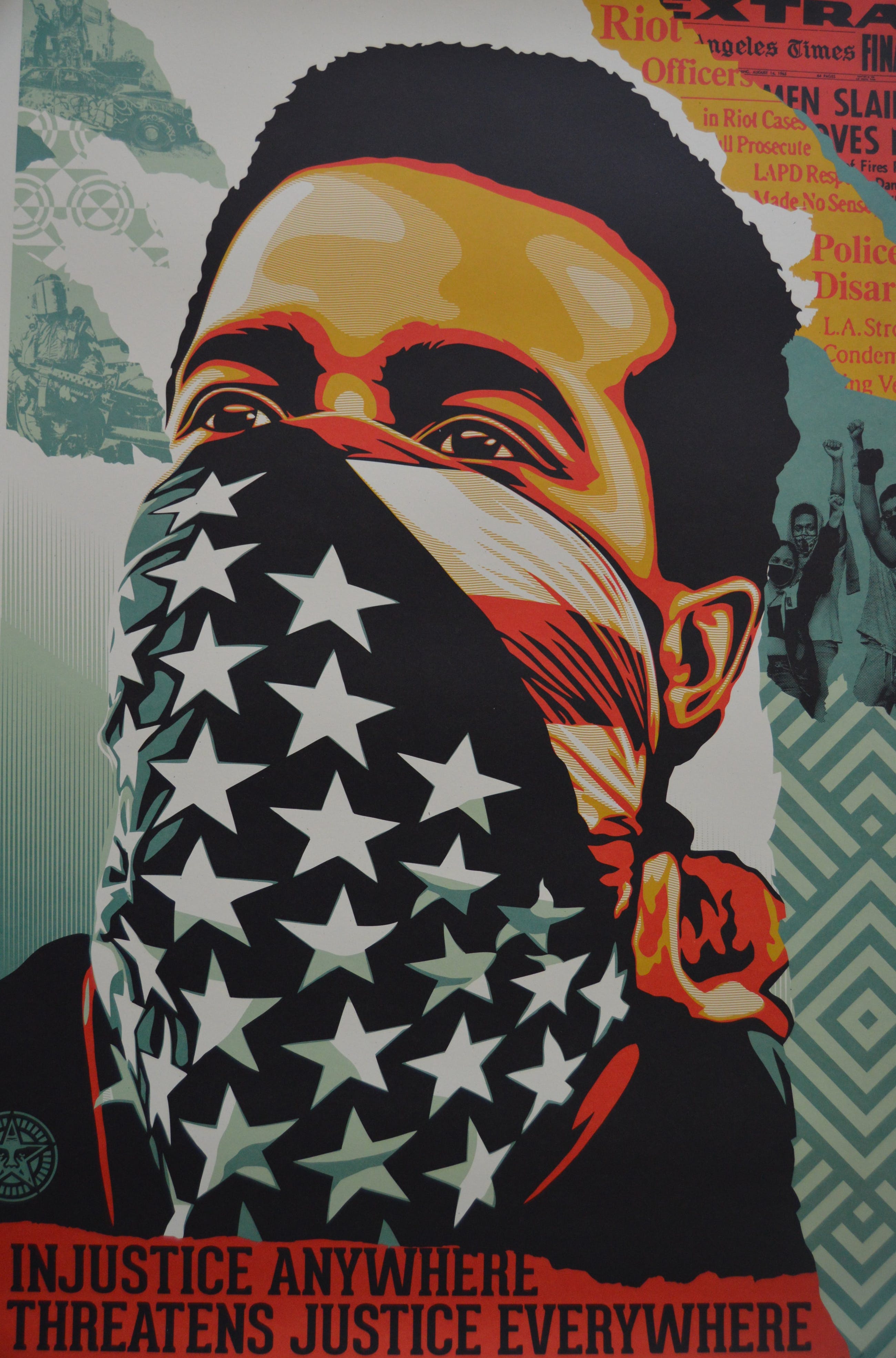 Deze "American Rage" print is gebaseerd op een foto, die genomen is tijdens de rellen in LA in het voorjaar van 1992, door fotograaf Ted Soqui. Een zeer actuele print van Shepard Fairey.