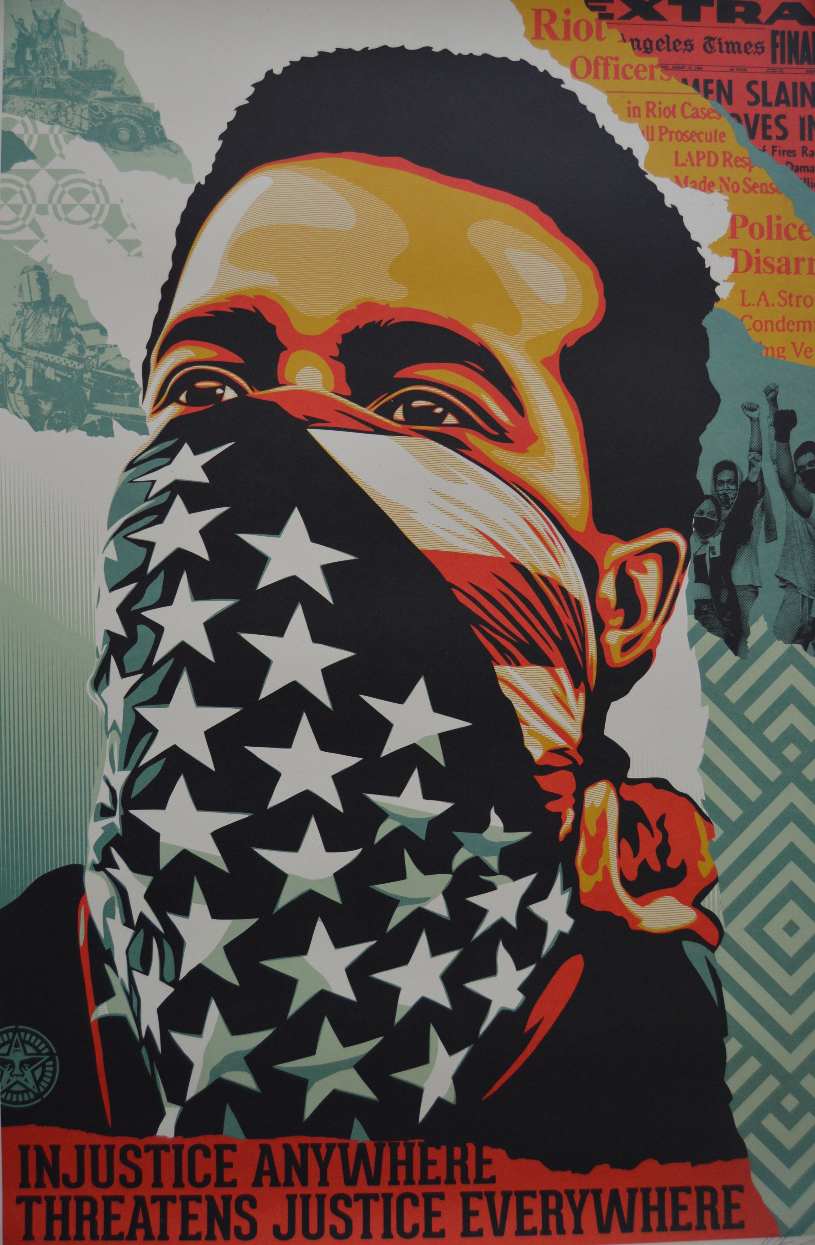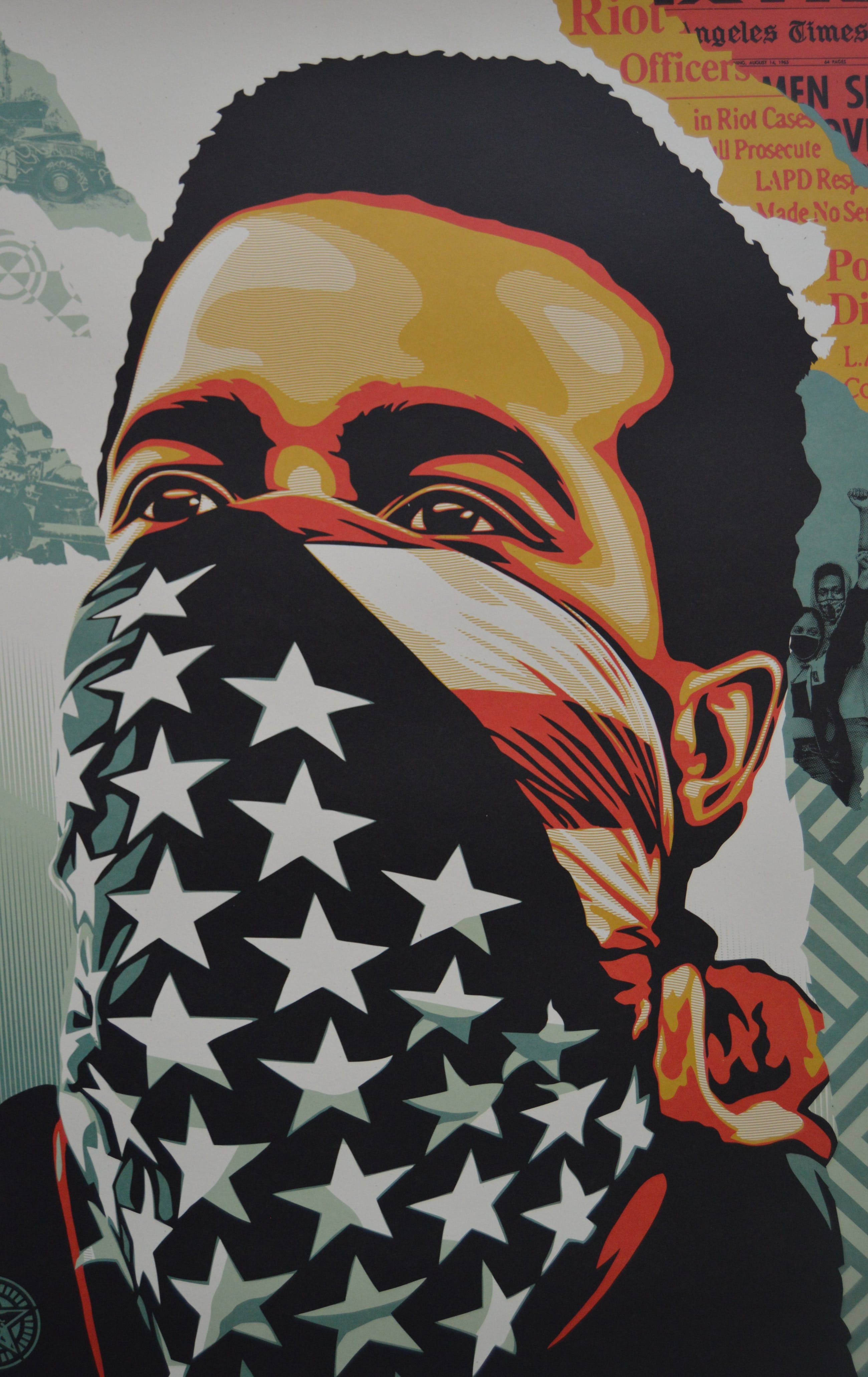 Deze "American Rage" print is gebaseerd op een foto, die genomen is tijdens de rellen in LA in het voorjaar van 1992, door fotograaf Ted Soqui. Een zeer actuele print van Shepard Fairey.