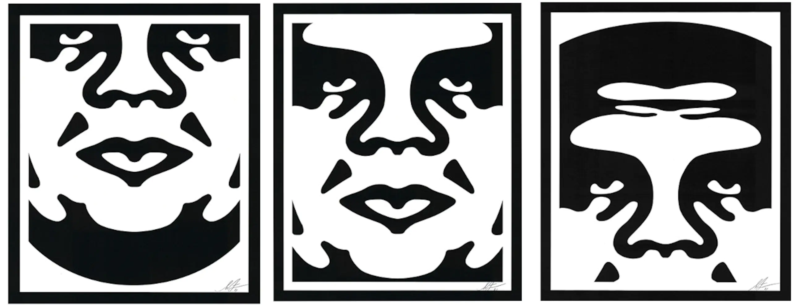 De complete set van drie zwart/wit Offset-litho,s van Shephard Fairey uit 2021.