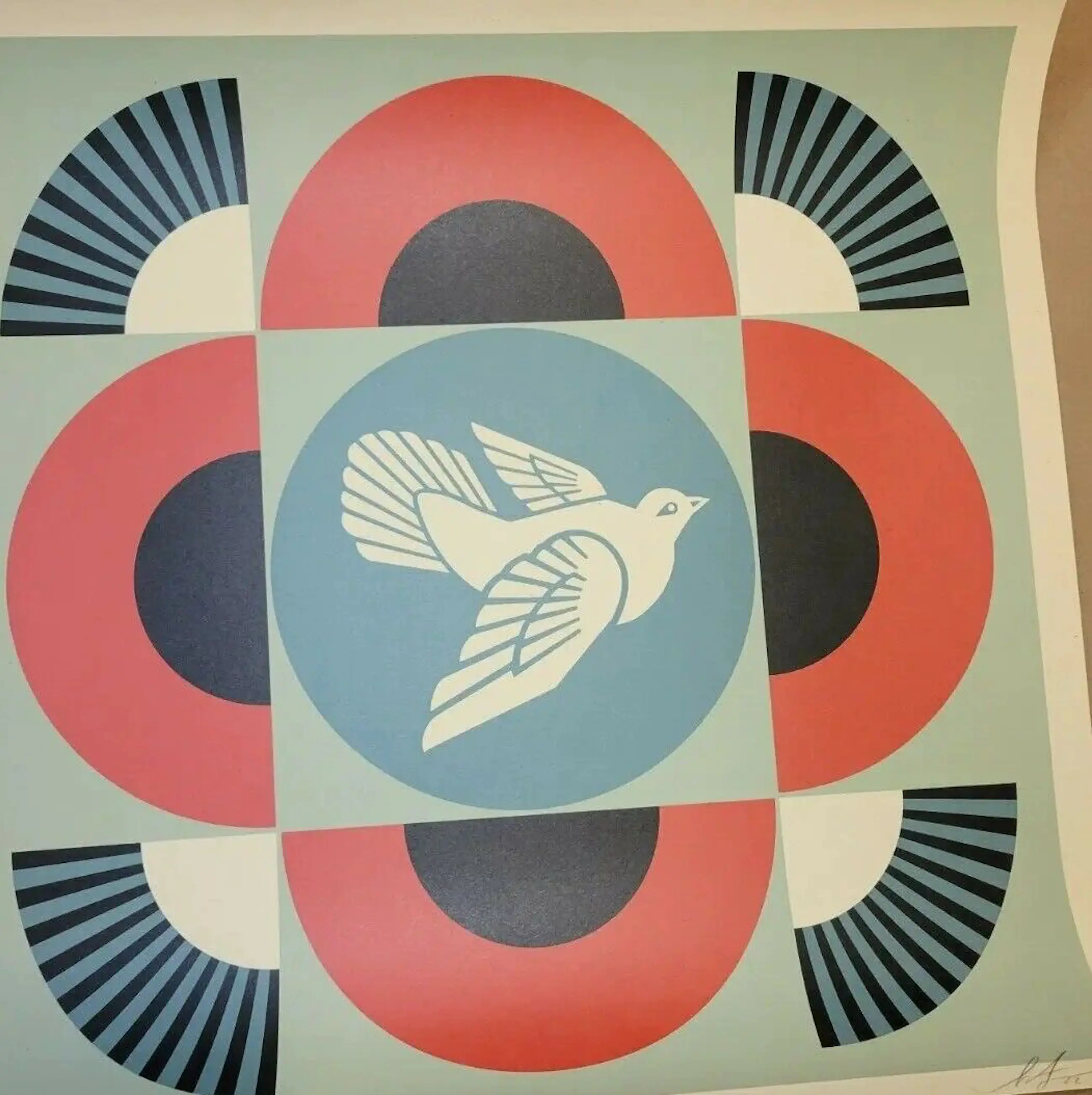 Gemaakt door Obey, aka Shepard fairey. " Geometric Dove" is de naam. 61x61cm op stevig papier. Niet ingelijst. Met orginele handtekening van Obey. Lithografie, 2022.