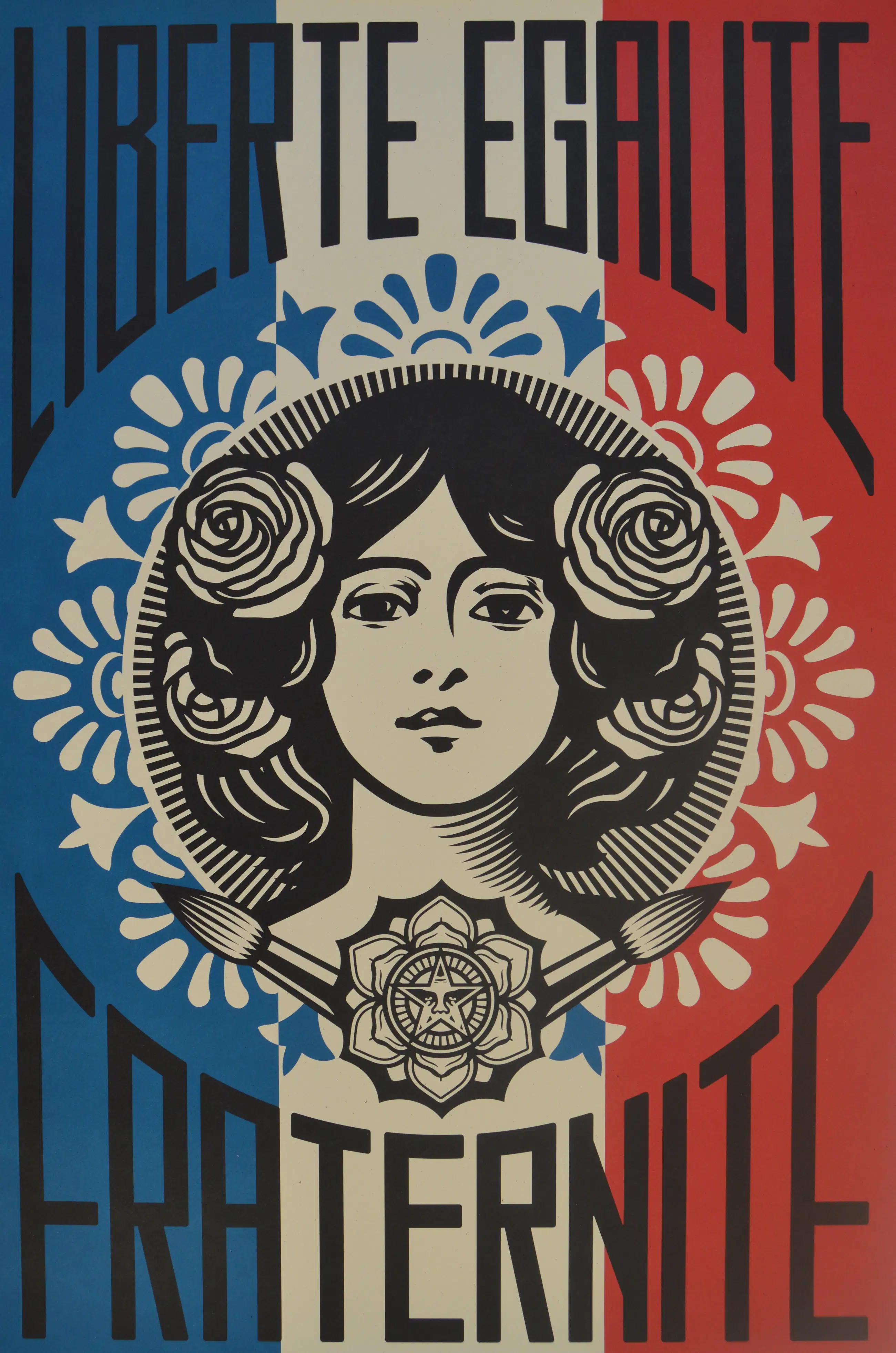 Print van Shepard Fairey op speckletone papier: Liberté, égalité, fraternité.