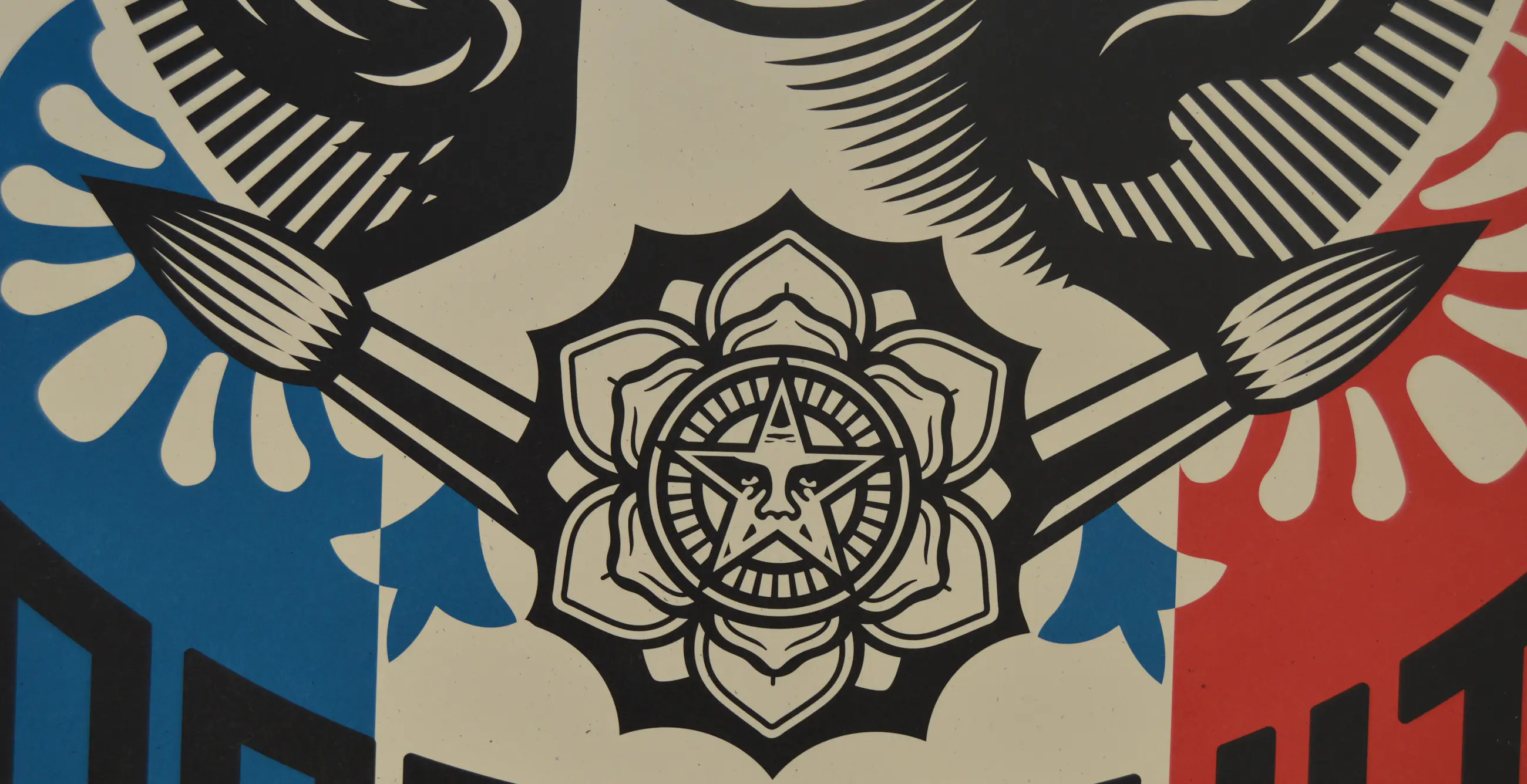 Print van Shepard Fairey op speckletone papier: Liberté, égalité, fraternité.
