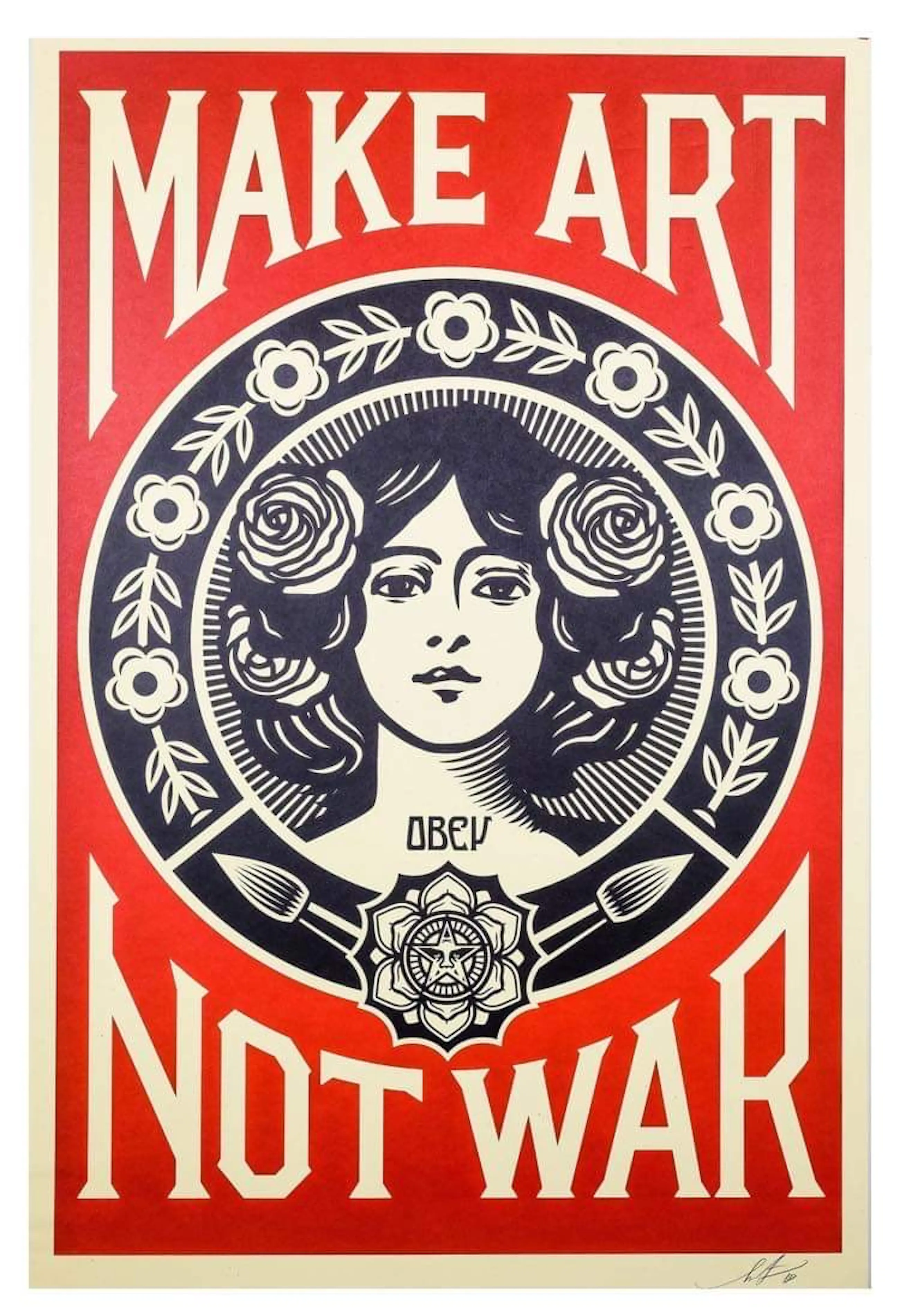 Deze litho van Obey, Shepard Fairey met de titel Make art not war, geinspireerd op de Jugendstill is gesigneerd. Het is op stevig papier gedrukt.