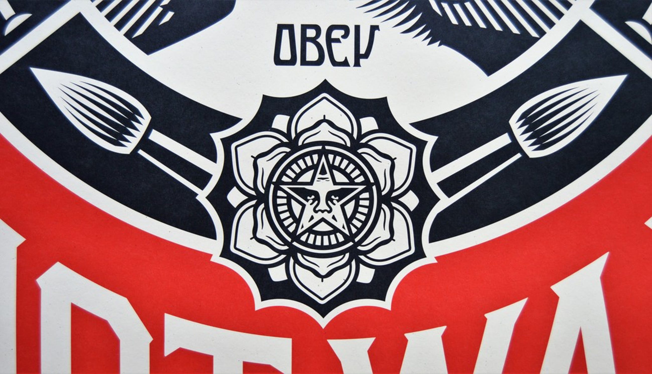 Bekende offset print van Shepard Fairey op speckletone papier: Make Art Not War. De slogan van menig straatartiest.
