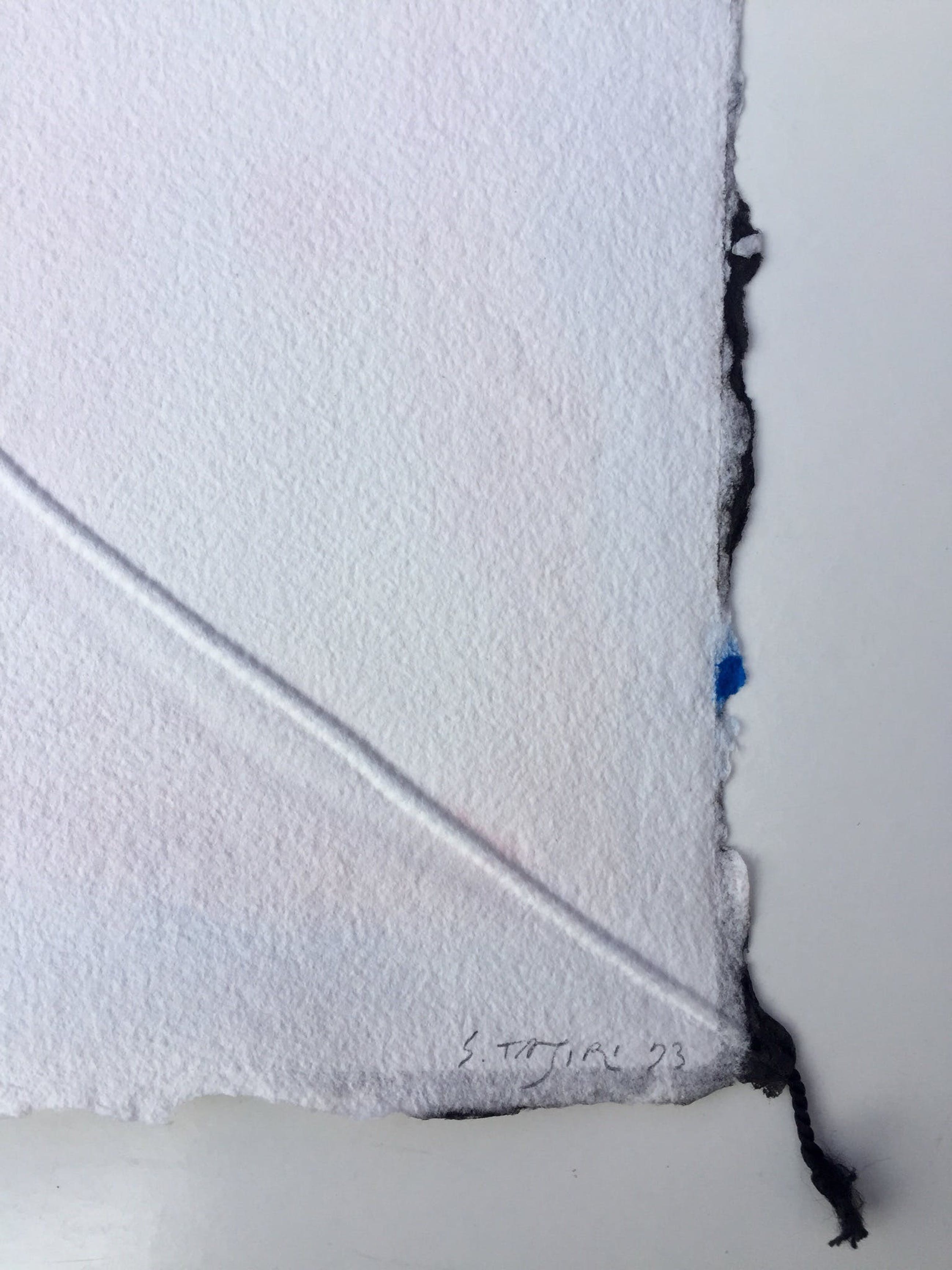 Een fraaie, zeldzame aquagravure van Tajiri uit 1993, uiteraard met de kenmerkende knoop. Het werk is aan een zijde minimalistisch wit en aan de andere zijde kleurrijk Cobra. Twee kunstwerken in een! Tevens aan beide zijden gesigneerd en genummerd. Afmetingen: 31 x 31 cm (blad).