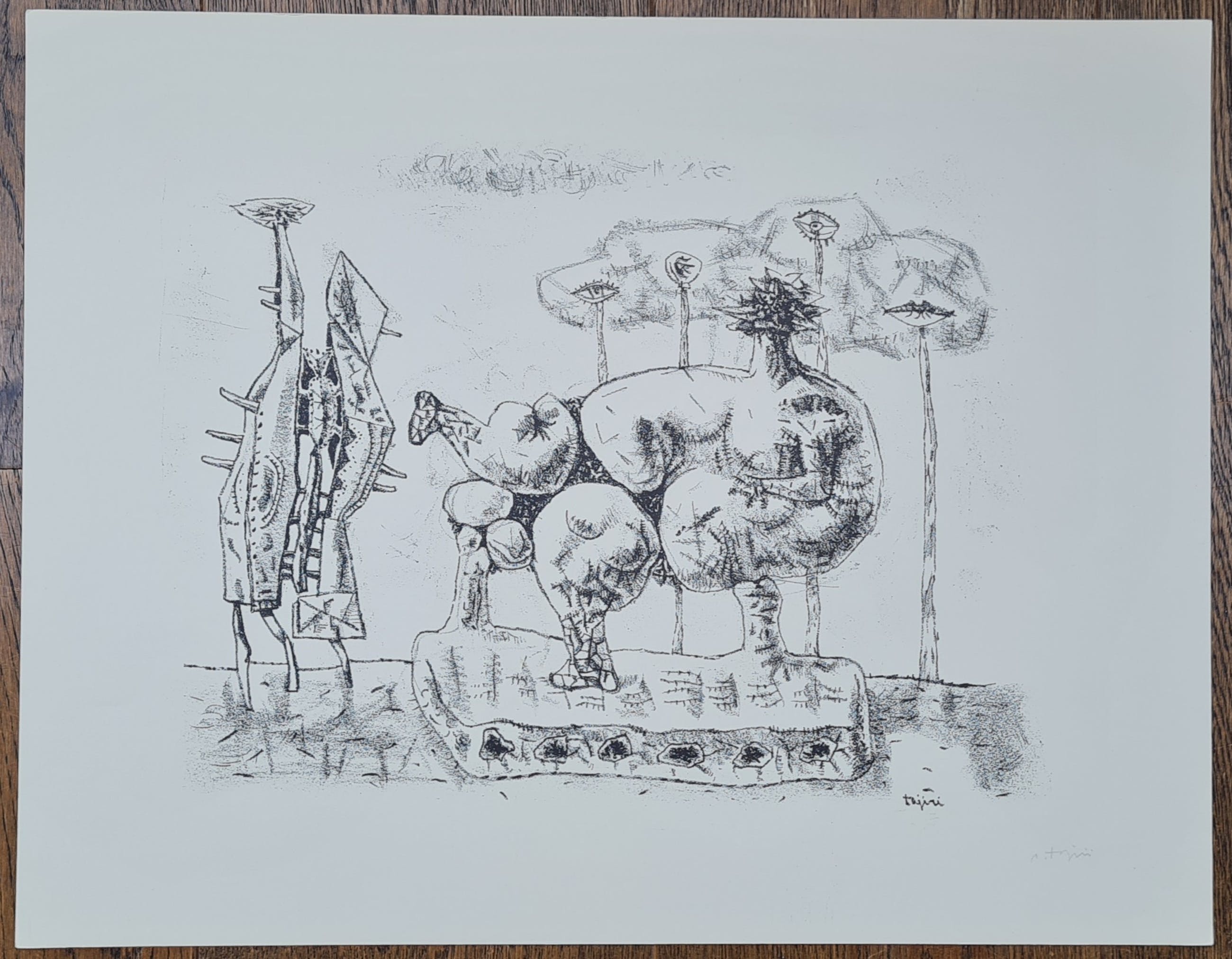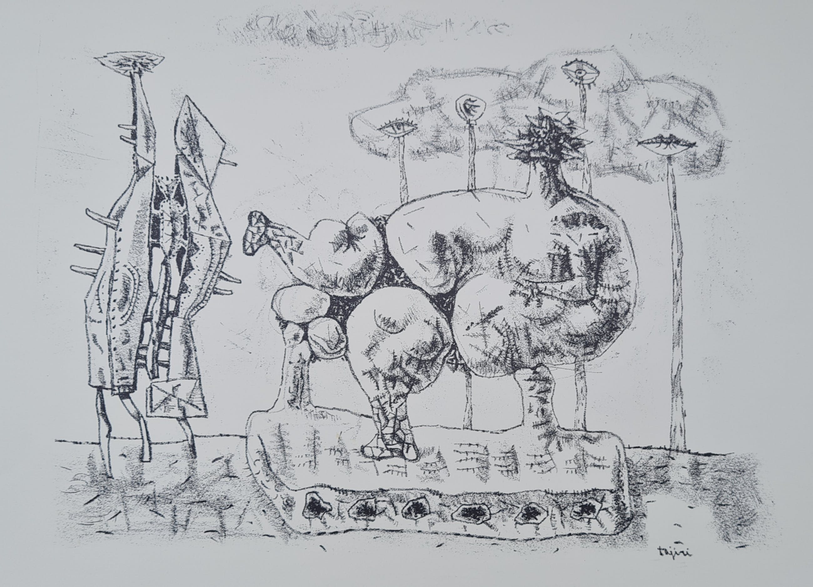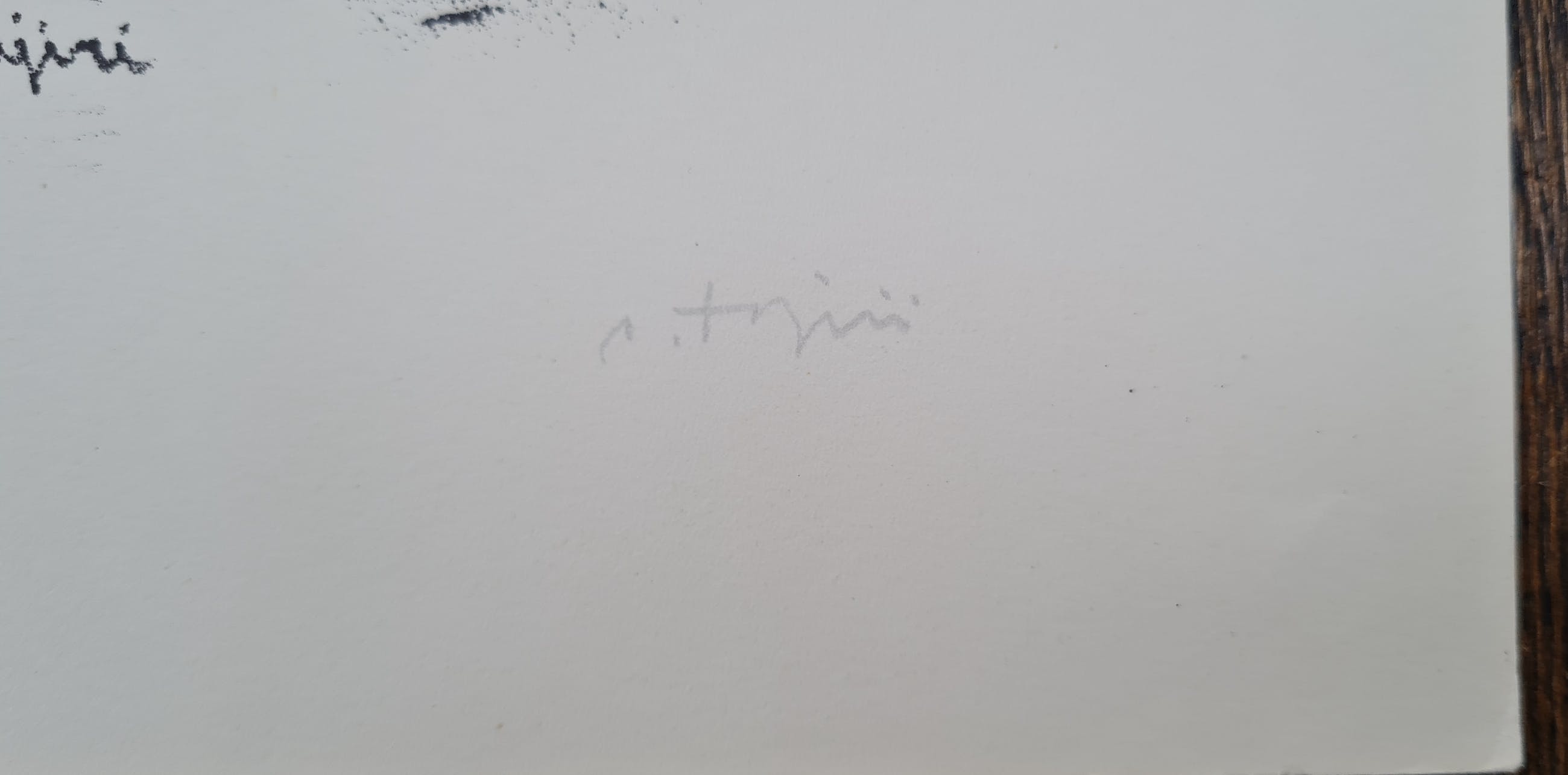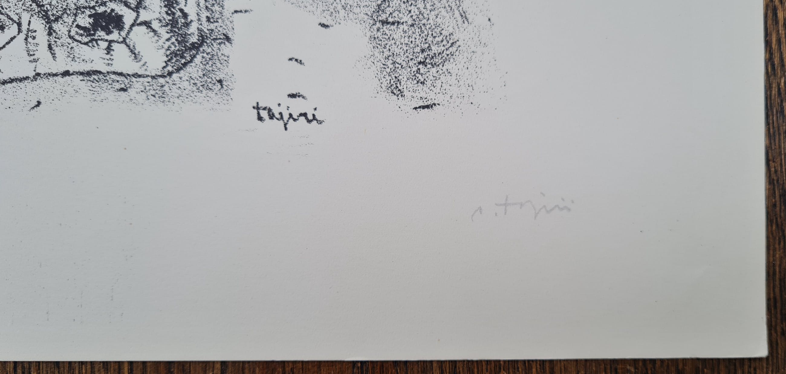 Karakteristieke compositie van Tajiri, zowel met potlood als in de steen gesigneerd