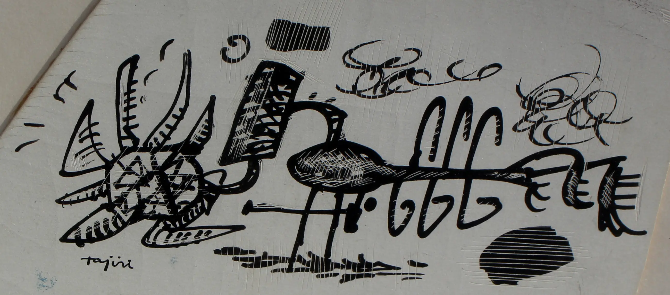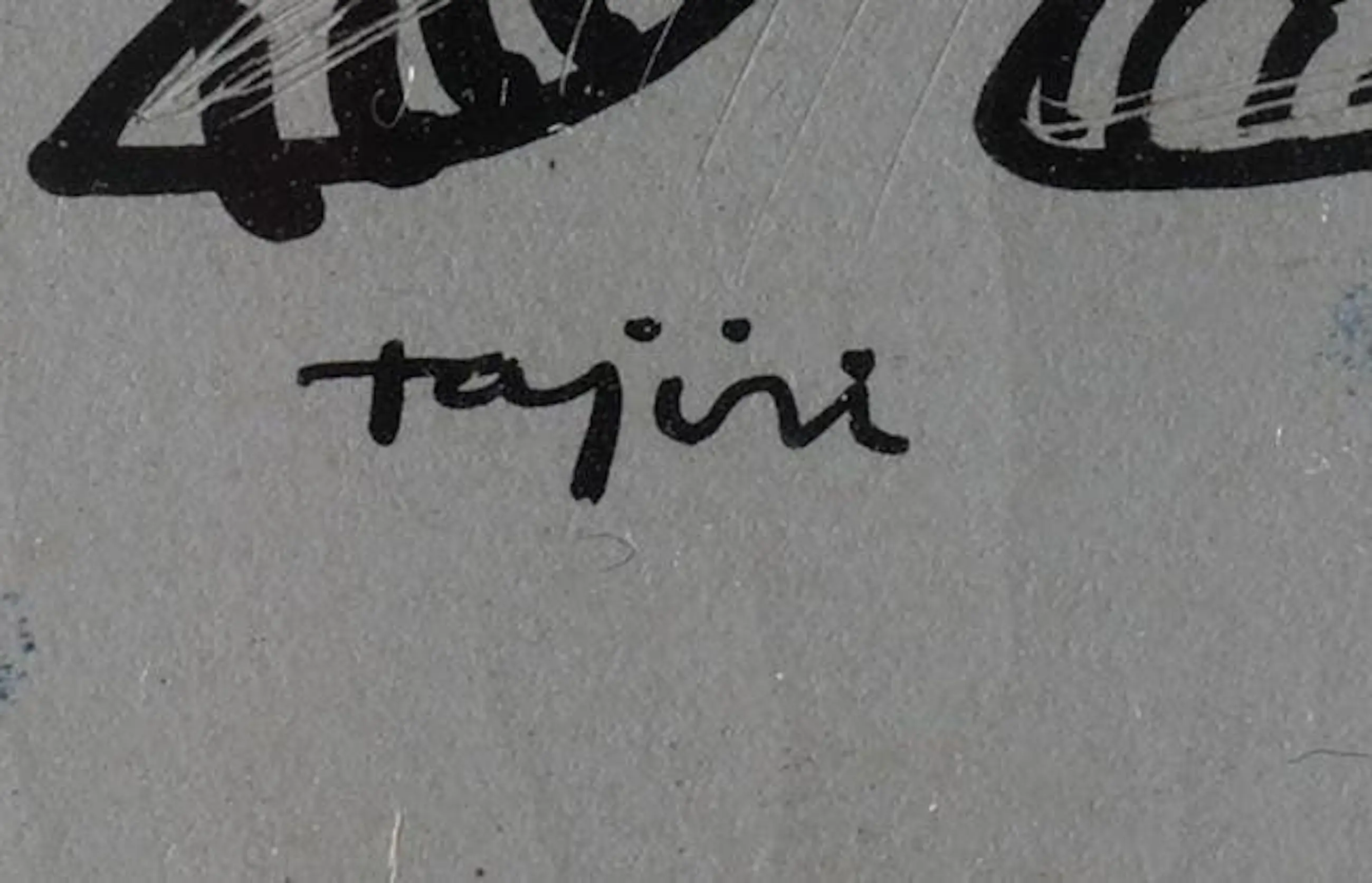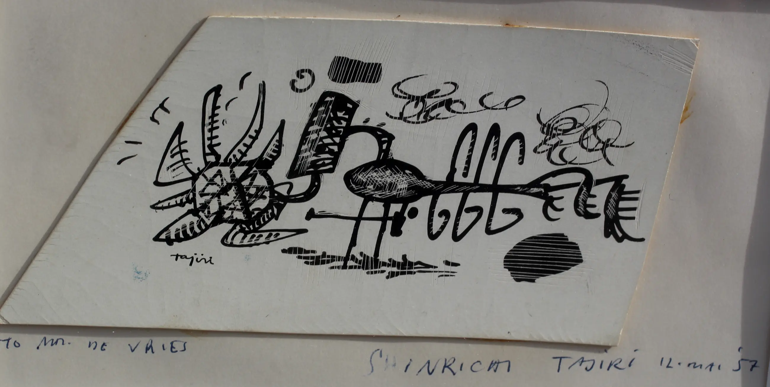 Ingelijste inkttekening, op scraperboard, van Shinkichi Tajiri. In opdracht voor Mr. de Vries. Jaar: 12 mei 1957. Afmetingen incl lijst: H42 x b32cm. Afmetingen voorstelling: H9.5 x b17cm. Het werk is, rechts onderaan, gesigneerd, door de kunstenaar. De authenticiteit van het aangeboden werk wordt volledig gegarandeerd. Een certificaat van echtheid kan, na aankoop, op aanvraag, worden gemaild.