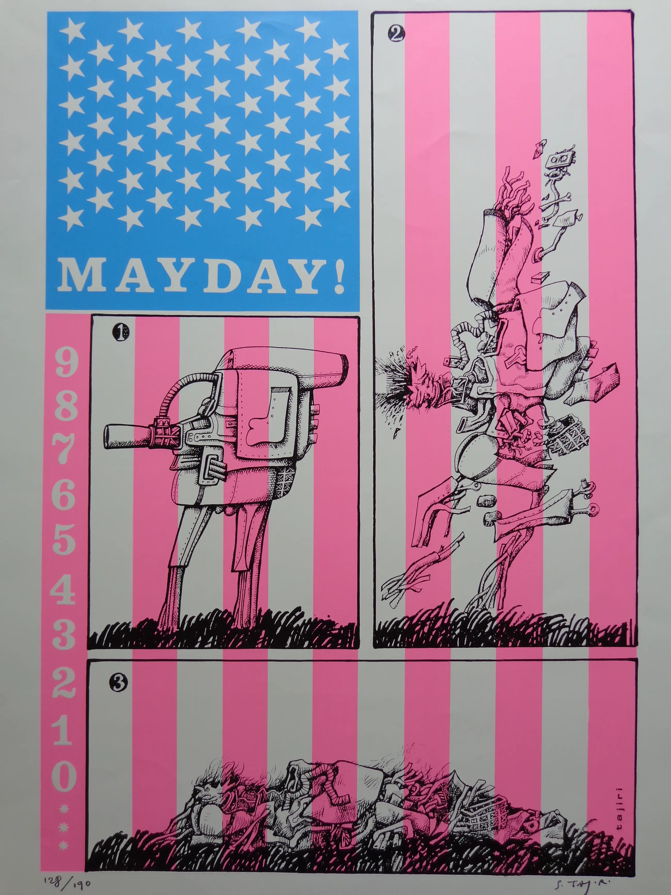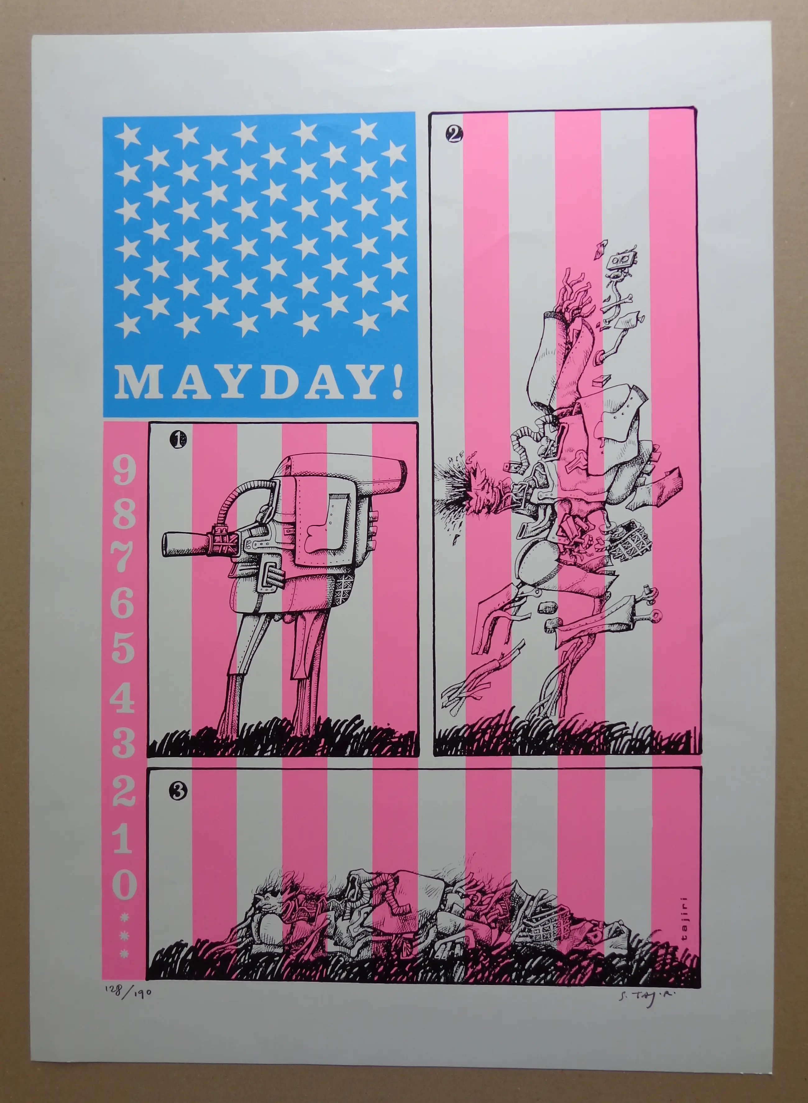 Shinkichi Tajiri (1923-2009). Titel: "Mayday". Kleurzeefdruk op blinkend papier. Gesigneerd met stift. Ex.nr. 128/190. Uitgave: Prent190. Enkele deuken over het blad. Blad: 70x50cm.