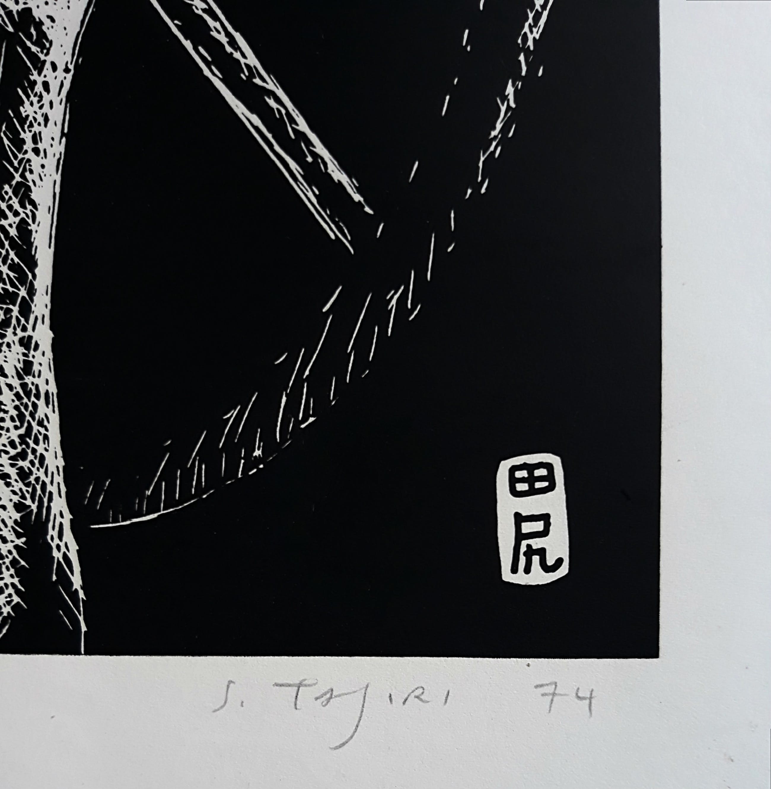 Mooi, apart werk van Shinkichi Tajiri uit 1974. Zeefdruk op glad papier, met potlood gesigneerd, gedateerd en genummerd (249/250). Deze zeefdruk werd uitgegeven ter gelegenheid van de tentoonstelling TAJIRI in Museum Boymans - van Beuningen in Rotterdam en het Bonnefantenmuseum in Maastricht. In goede conditie, slechts wat kleine kreukjes in de marge onderaan en ook twee kleine vlekjes helemaal onderaan het blad. Ingelijst met passe-partout is het werk zeer goed.