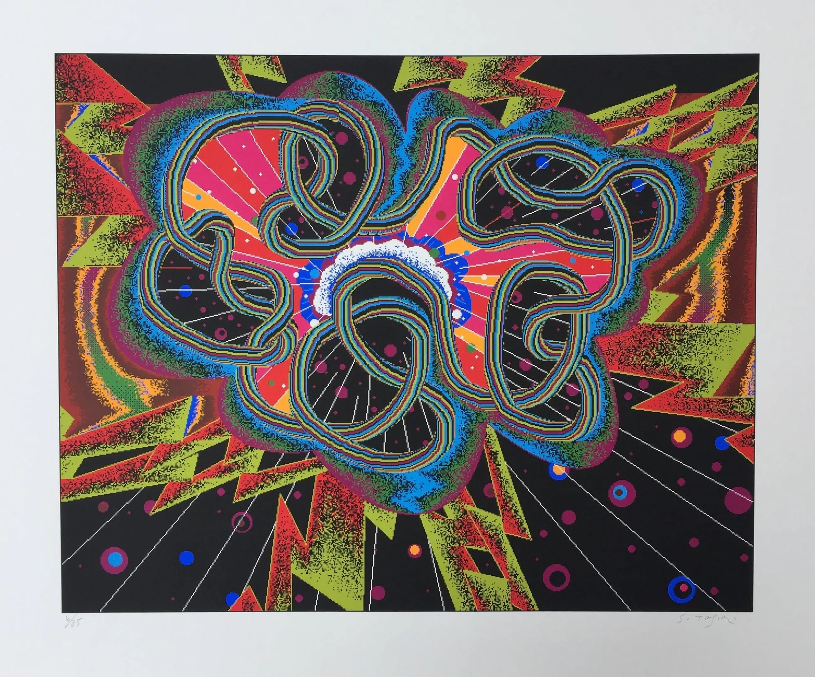 Een zeldzame zeefdruk van Shinkichi Tajiri, met zijn typerende knoop die wereldwijd bekend is. Het werk is gesigneerd en genummerd, oplage 85 ex. en is in goede conditie.