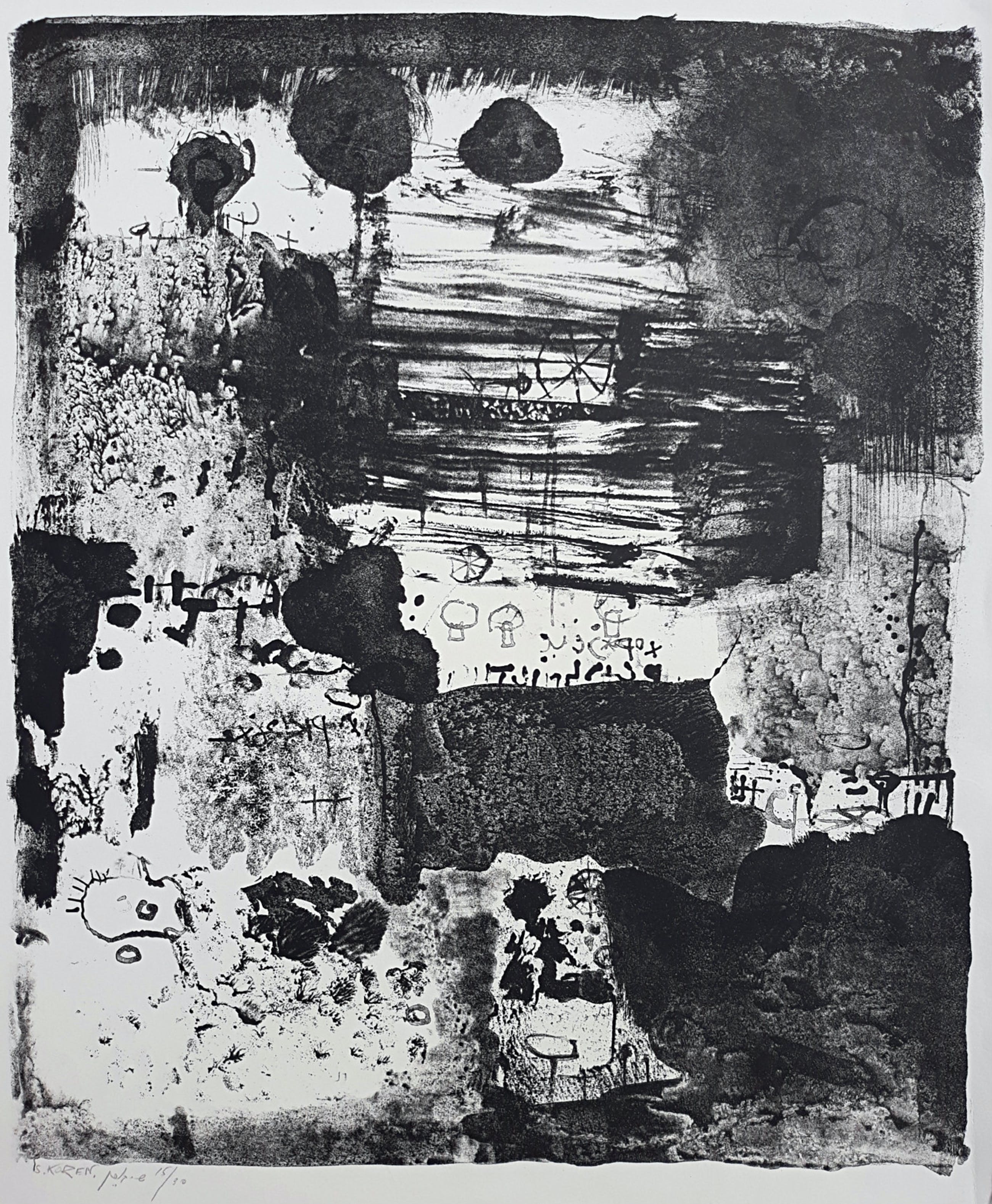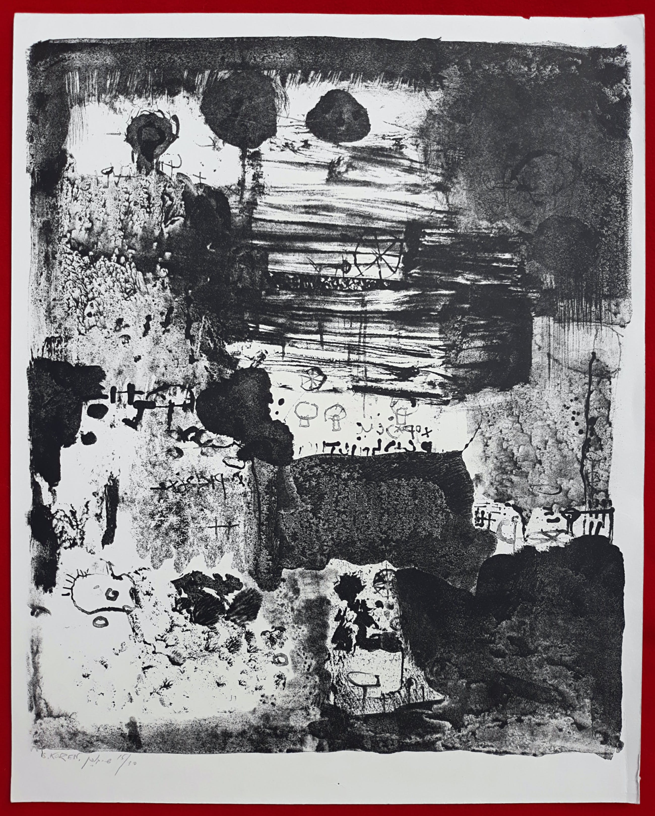 Karakteristieke compositie van Shlomo Koren. Litho op geschept papier, met potlood gesigneerd, getiteld (niet te ontcijferen door mij, mogelijk Hebreeuws) en genummerd (15/30). In goede conditie; kreukje in de hoek rechtsonder, punaise gaatje in de marge onderin. Ingelijst met passe-partout is het werk prima.
