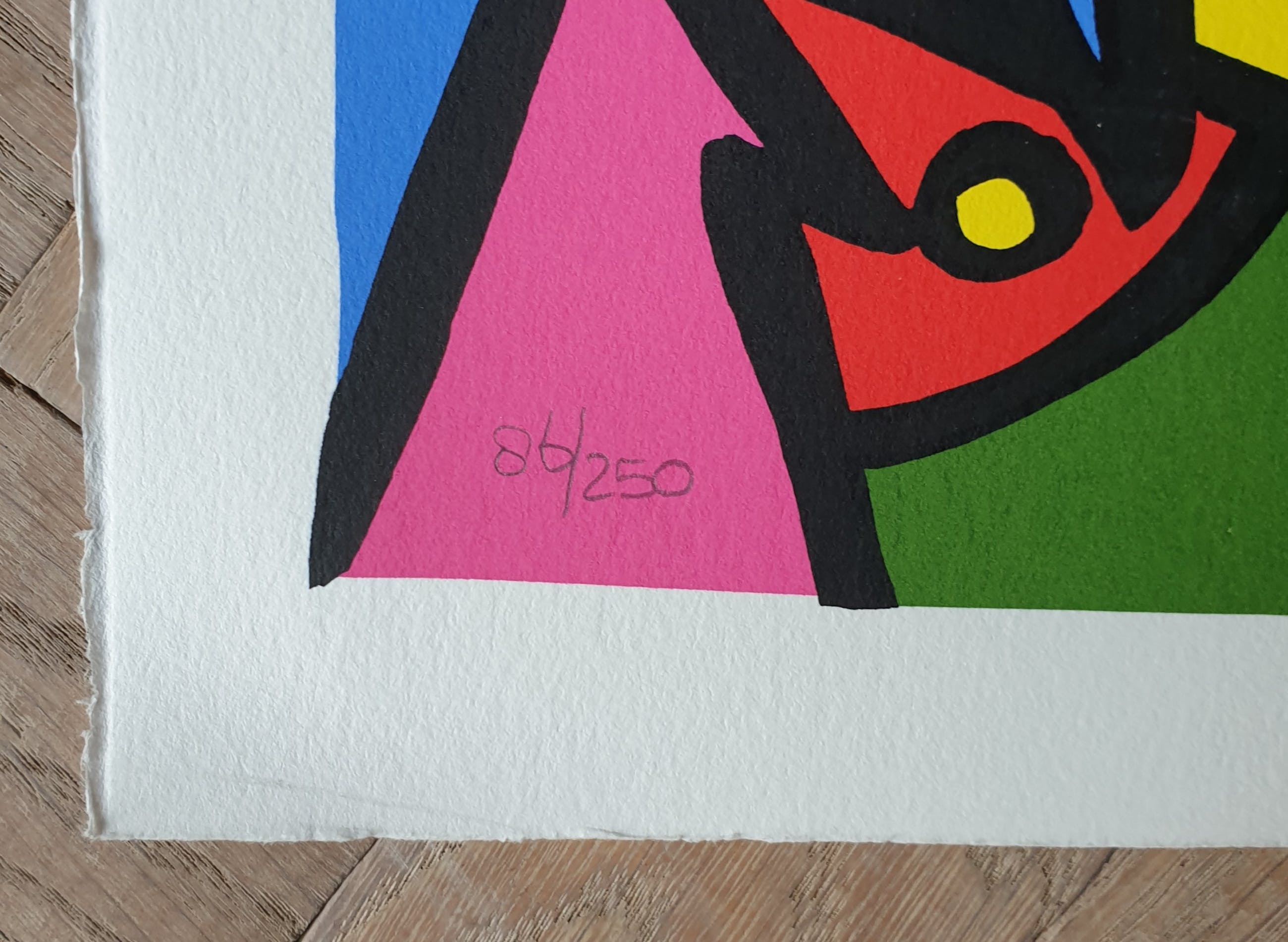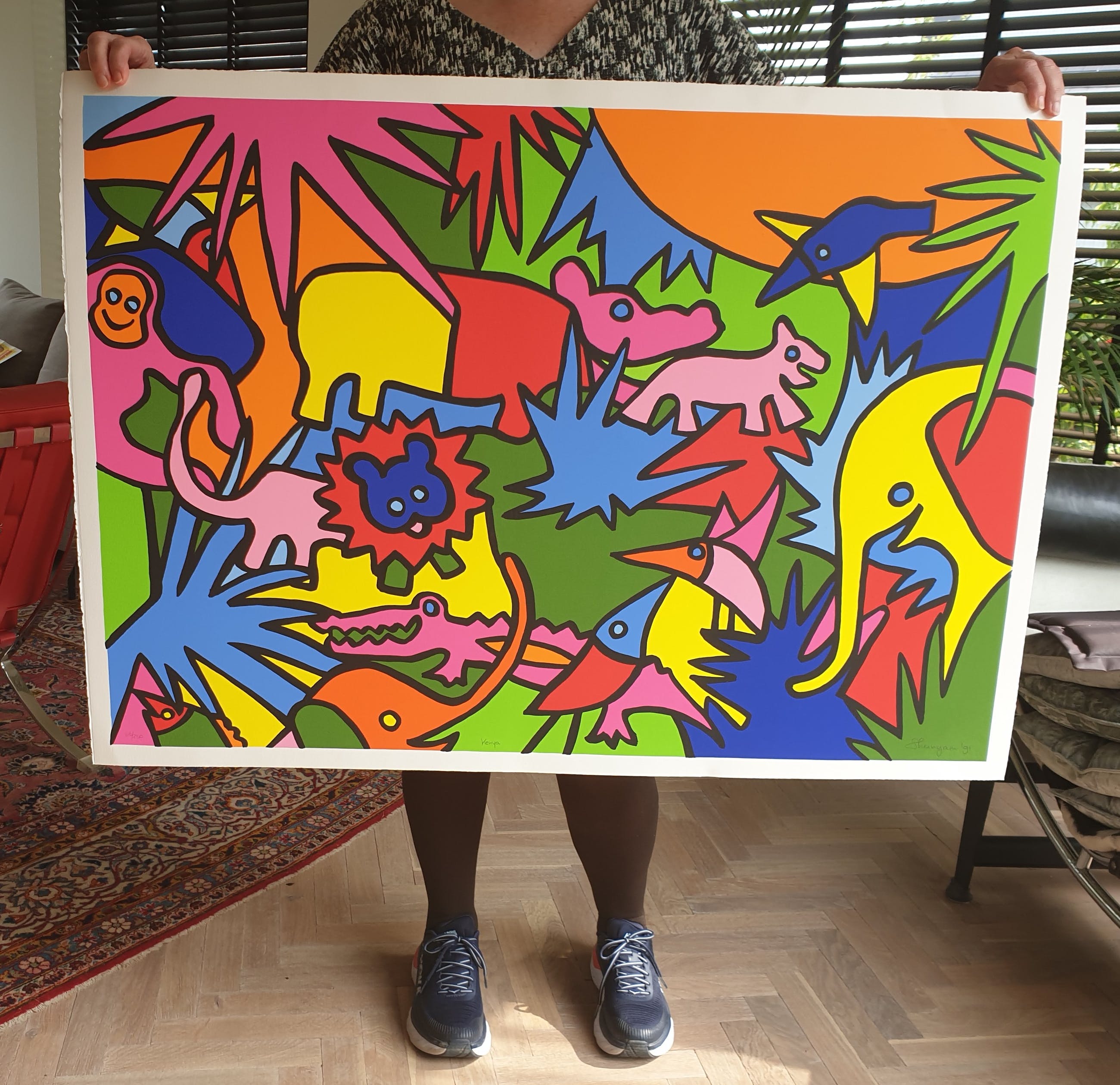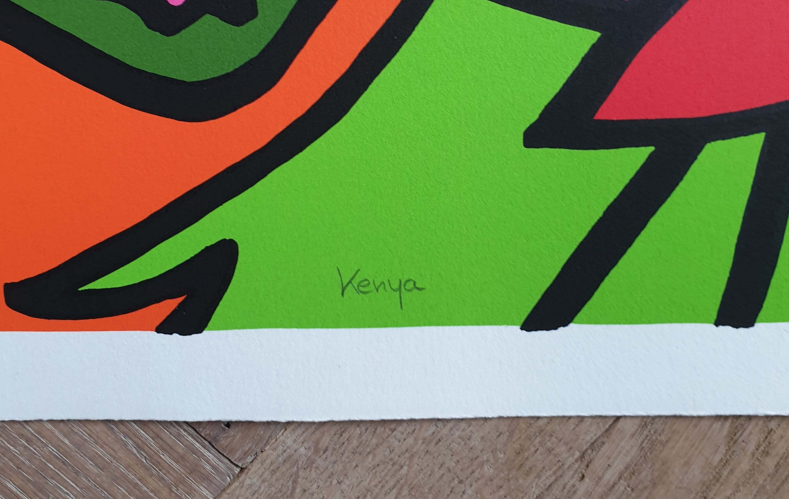 Groot kleurrijk werk van Shunyam. Getiteld "Kenya". Het werk meet 75 x 105 cm en heeft als nummering 86/250. Wordt in stevige koker verstuurd.
