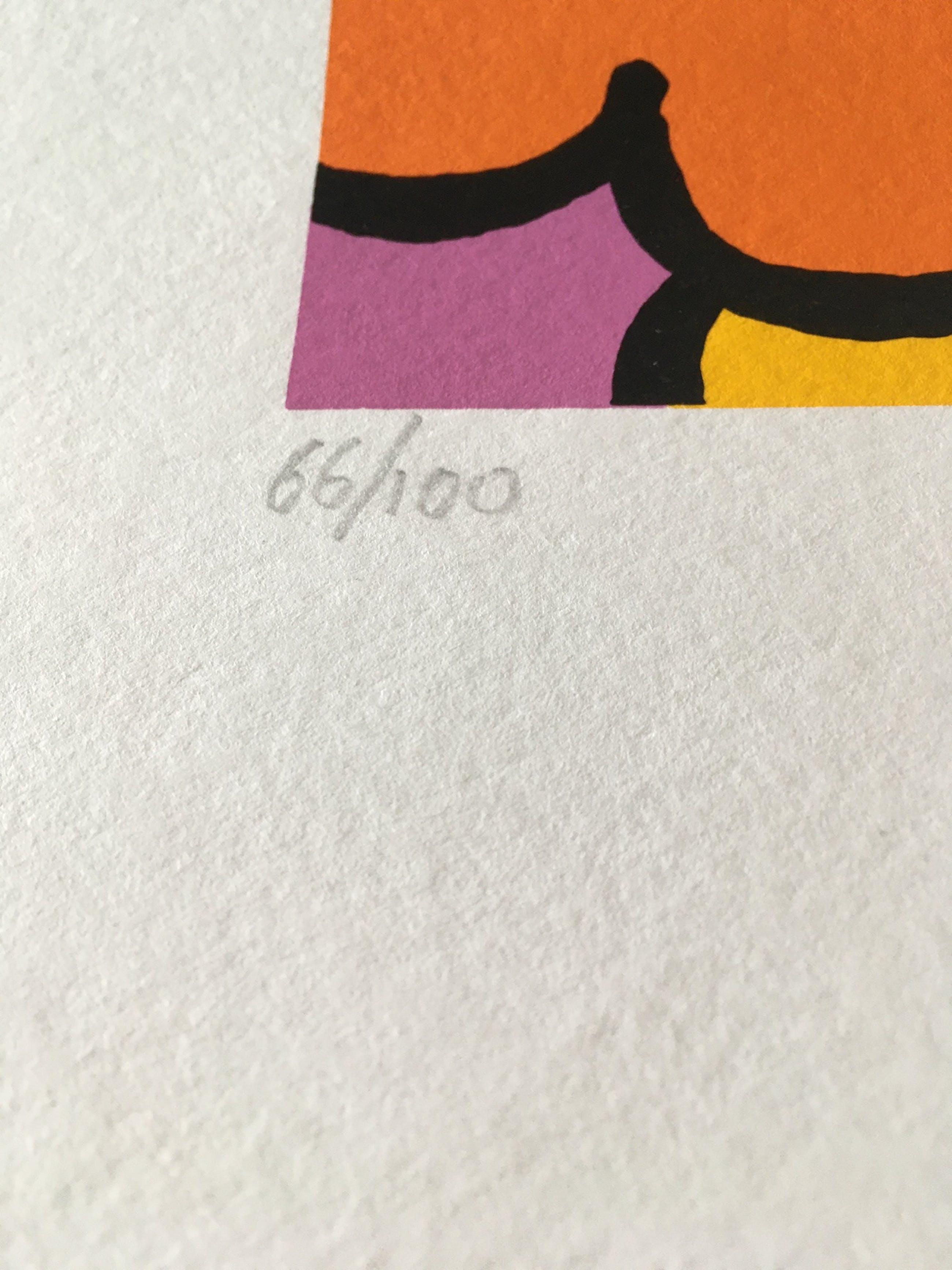 Zeer fraaie en grote kleurenzeefdruk van Shunyam. Met l.o.66/100 met potlood,in het midden Royal Smile met potlood en r.o.Shunyam met potlood.