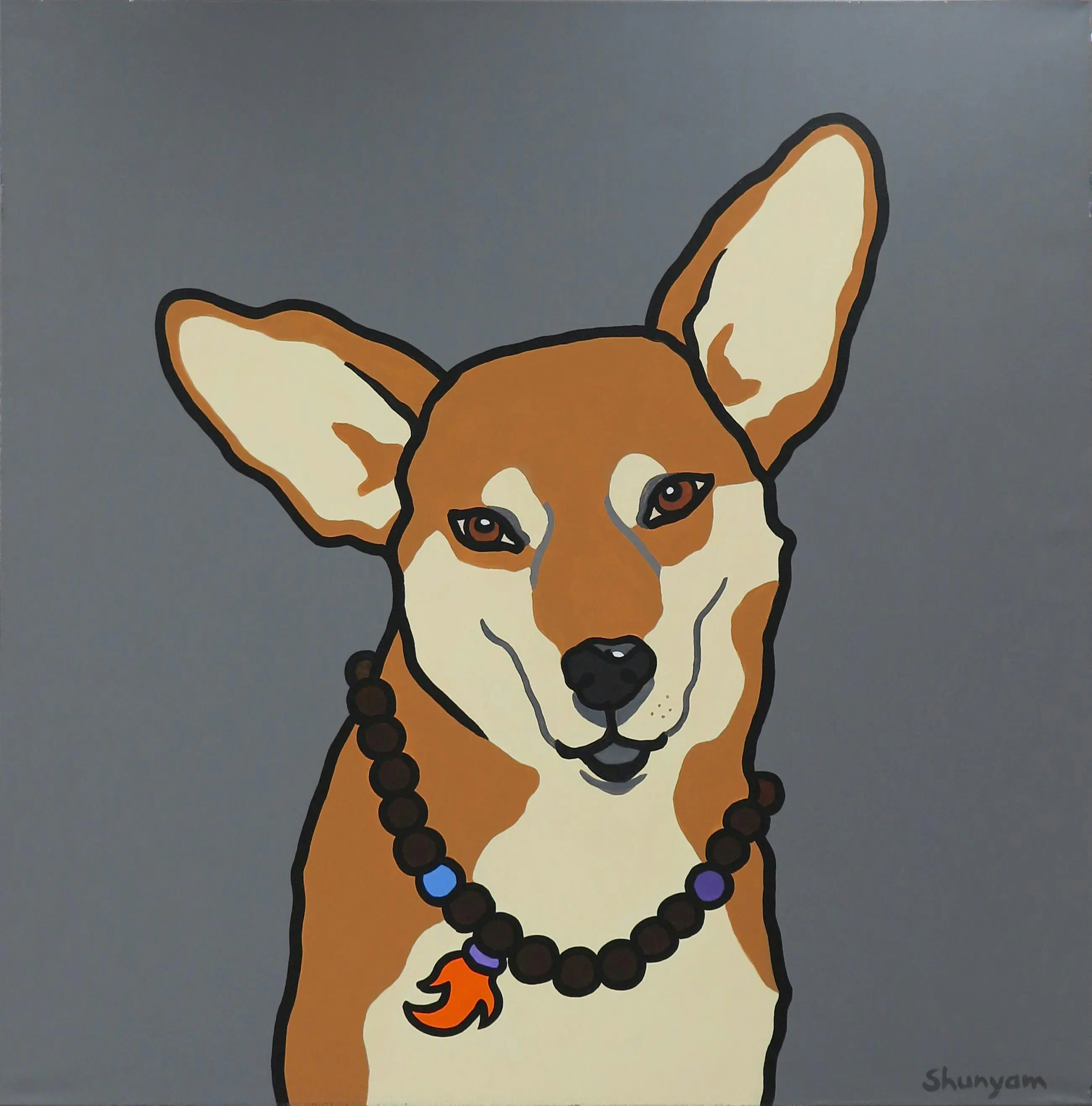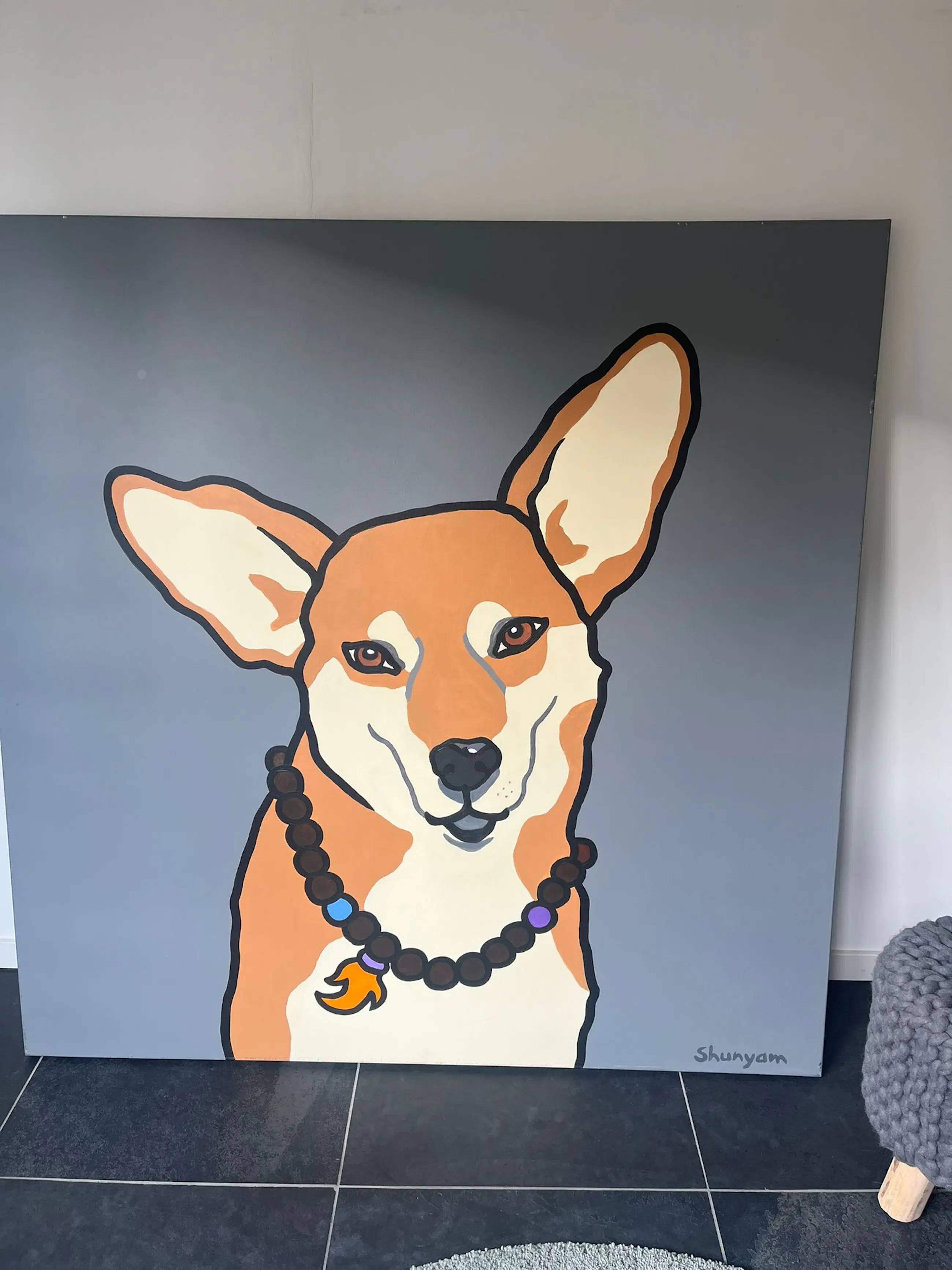 Het doek laat een corgi (hond) zien die je iedere dag vrolijk aankijkt, kunstwerk zit op een spieraam , kan zo aan de muur gehangen worden.