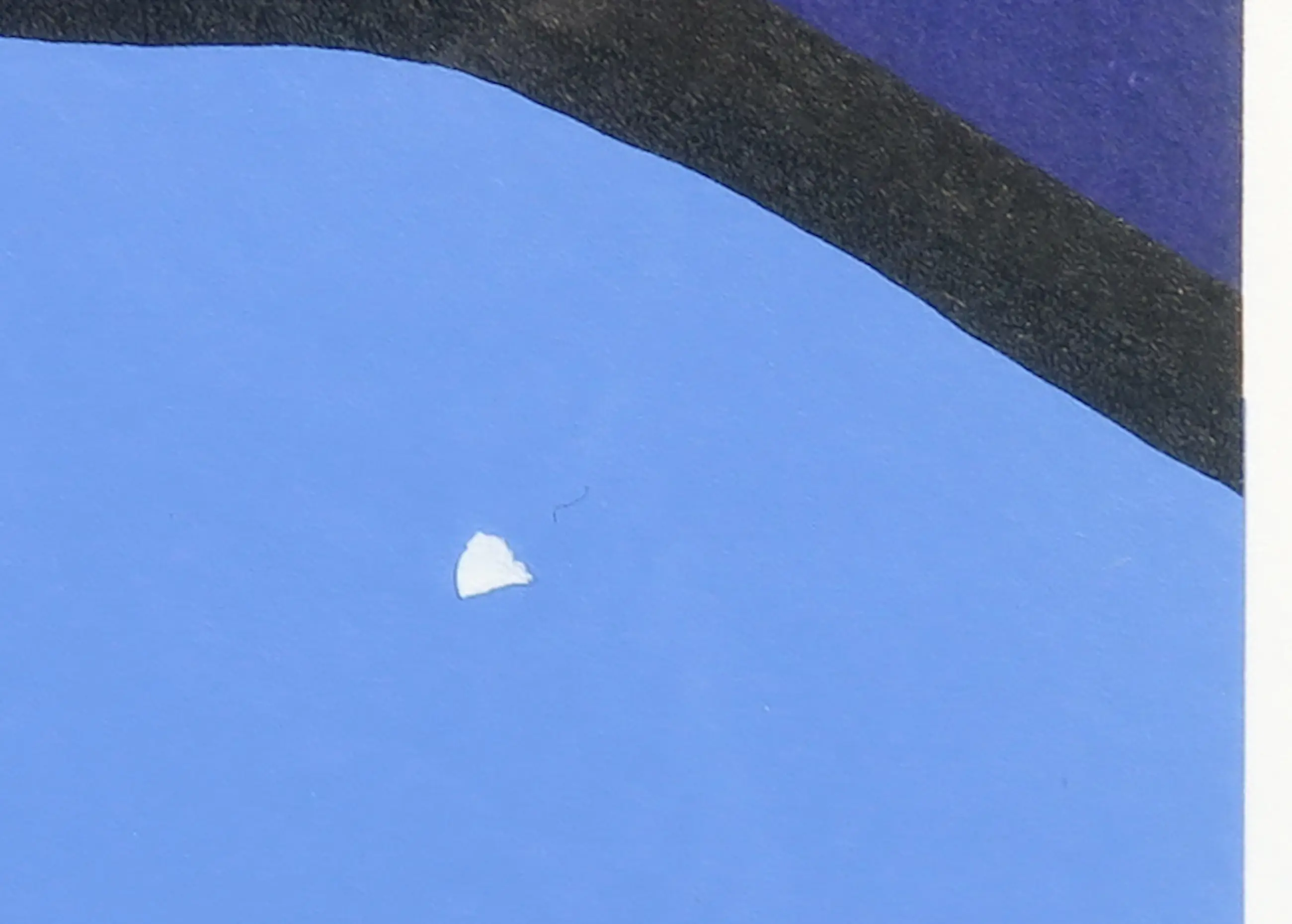 | Rechts onder in de compositie lijkt er een op een enkel plekje wat oppervlakteschade te zitten. (Zie detailfoto) | |