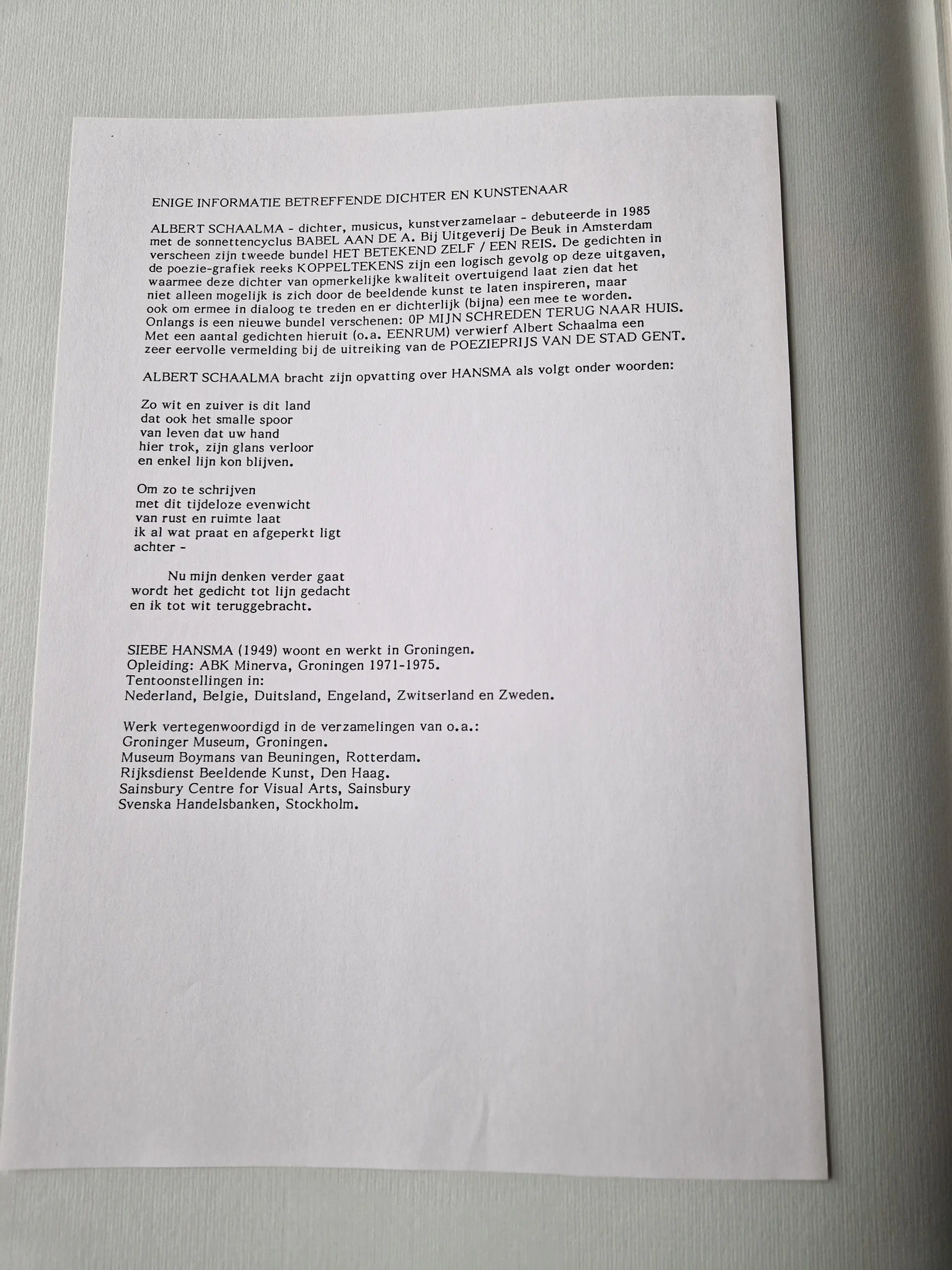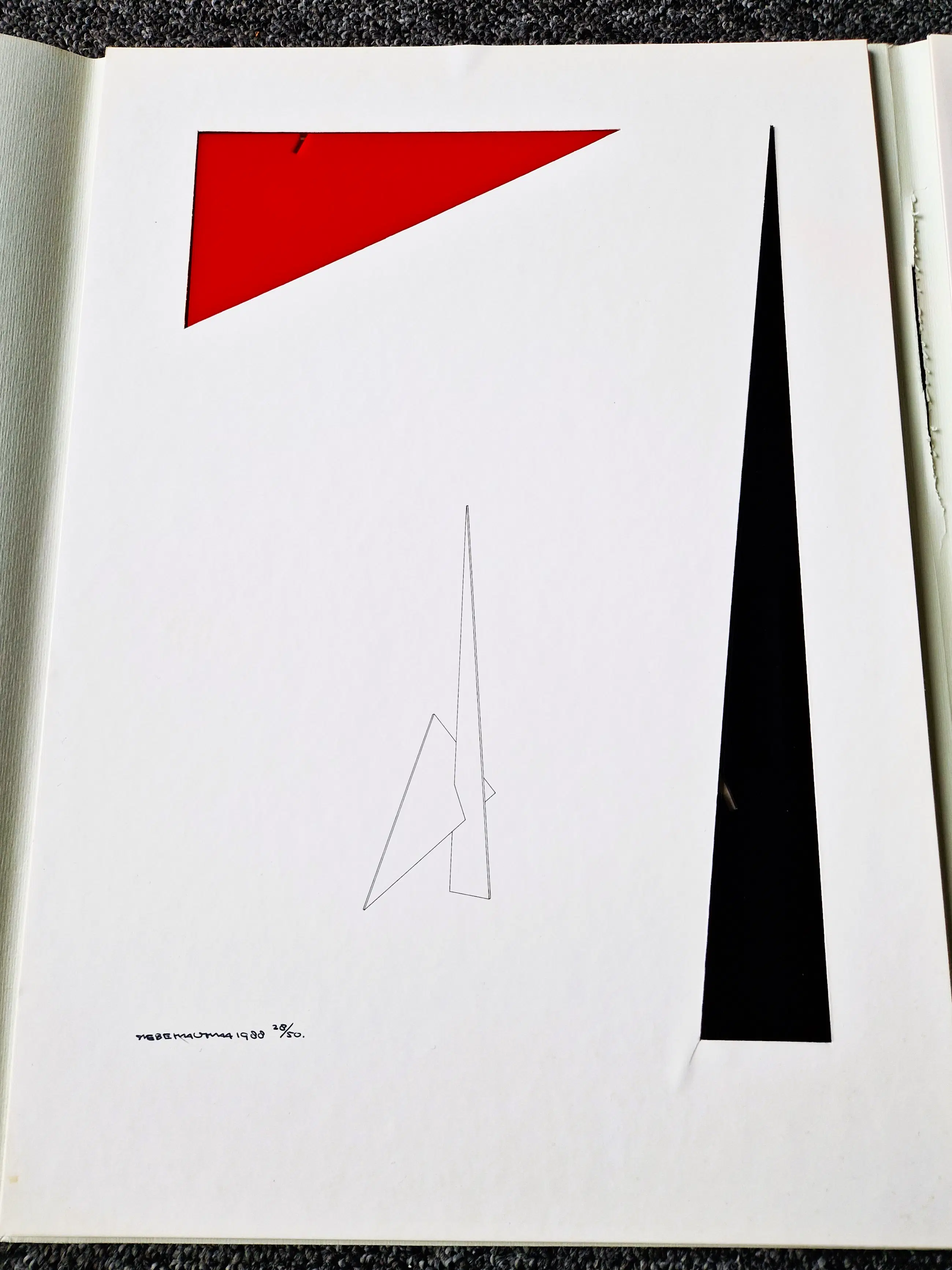 Nog niet in elkaar gezet plastiek in twee delen, in een map van de kunstenaar Siebe Hansma. Met een gedicht van dichter Albert Schaalma. Het geheel bestaat uit een grijze map met daarin het zwart en rode plastiek in verpakking. Genummerd en gesigneerd. Verder in de map 3 bladen met het gedicht, een colophon en een toelichting. In originele staat.