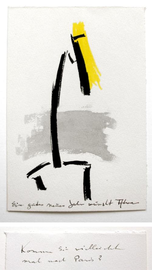 Gouache auf Bütten im Maß 15,5 x 10,5 cm; mit handsignierter Grußformel; verso weitere Textzeile.