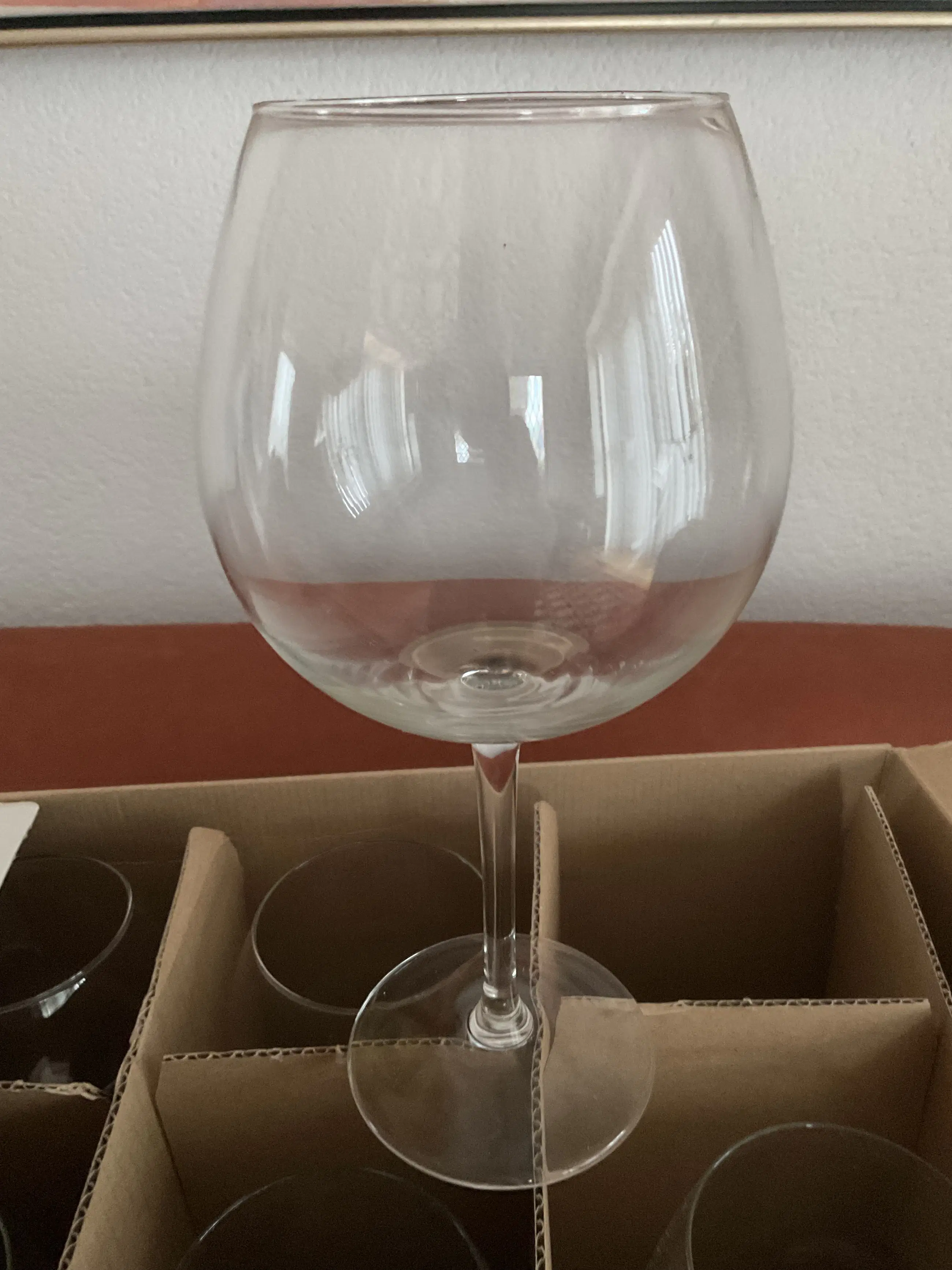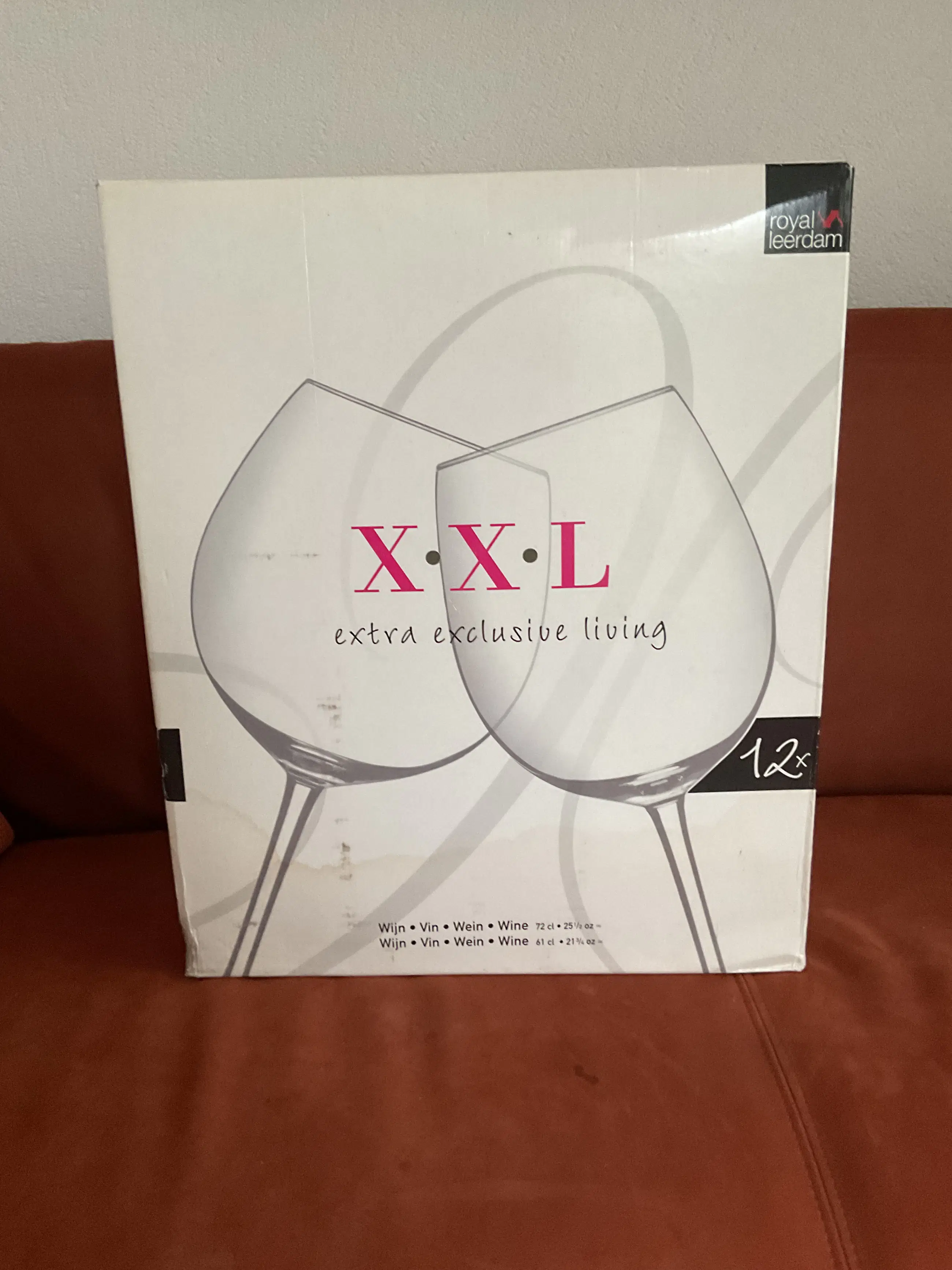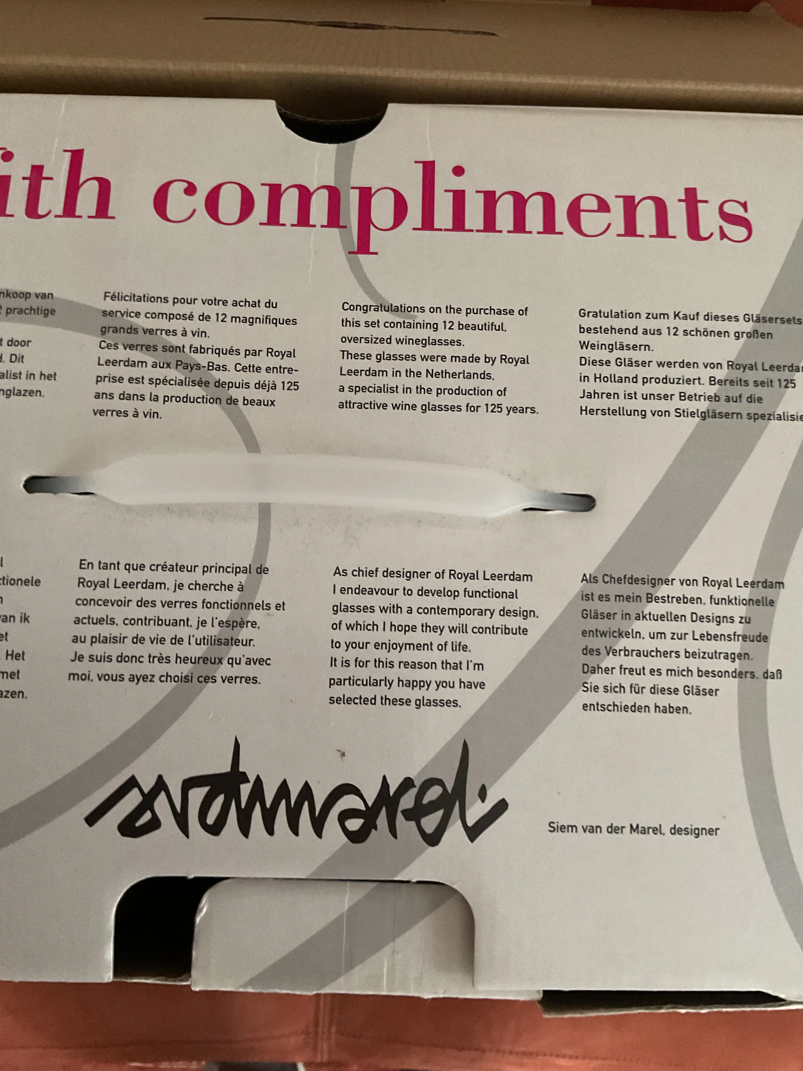 Doos met 12 stuks mooie grote kristal wijnglazen exclusief ontworpen door Siem van der Marel voor Leerdam Gesigneerd op de doos Extra Exclusive Living Ongebruikt Hoogte 22 cm Doorsnee 10cm Alleen ophalen