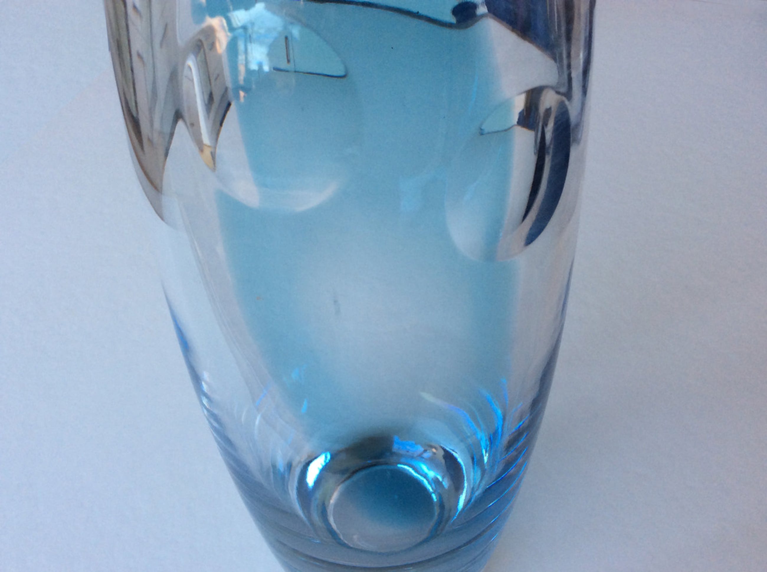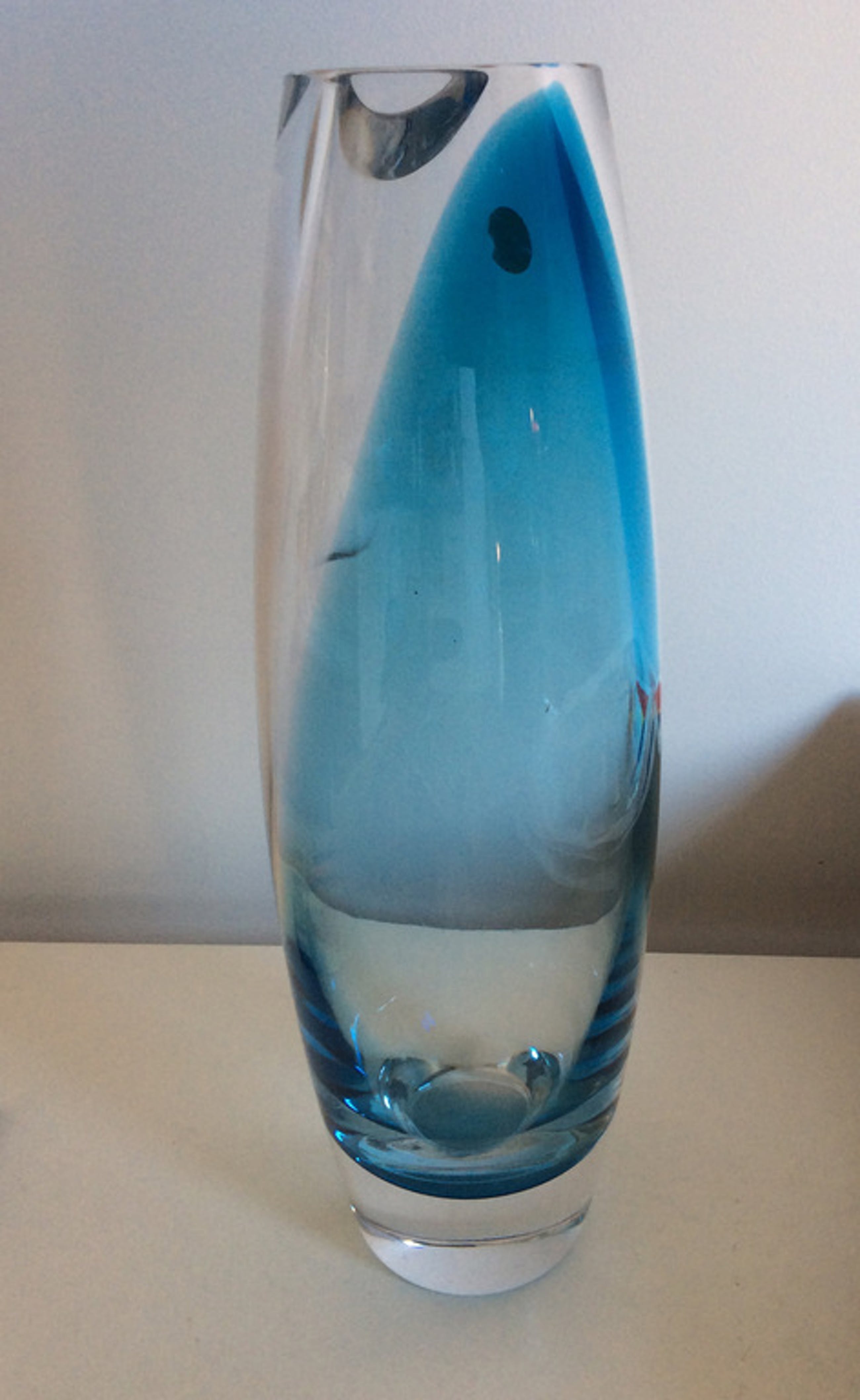 Siem van der Marel voor Leerdam 2004: Essilor kristallen vaas met blauw kleurvlak en twee geslepen lenzen, met origineel Leerdam label. Hoogte 30 cm. Enkele zeer minieme gebruikskrasjes, lichte aanslag.