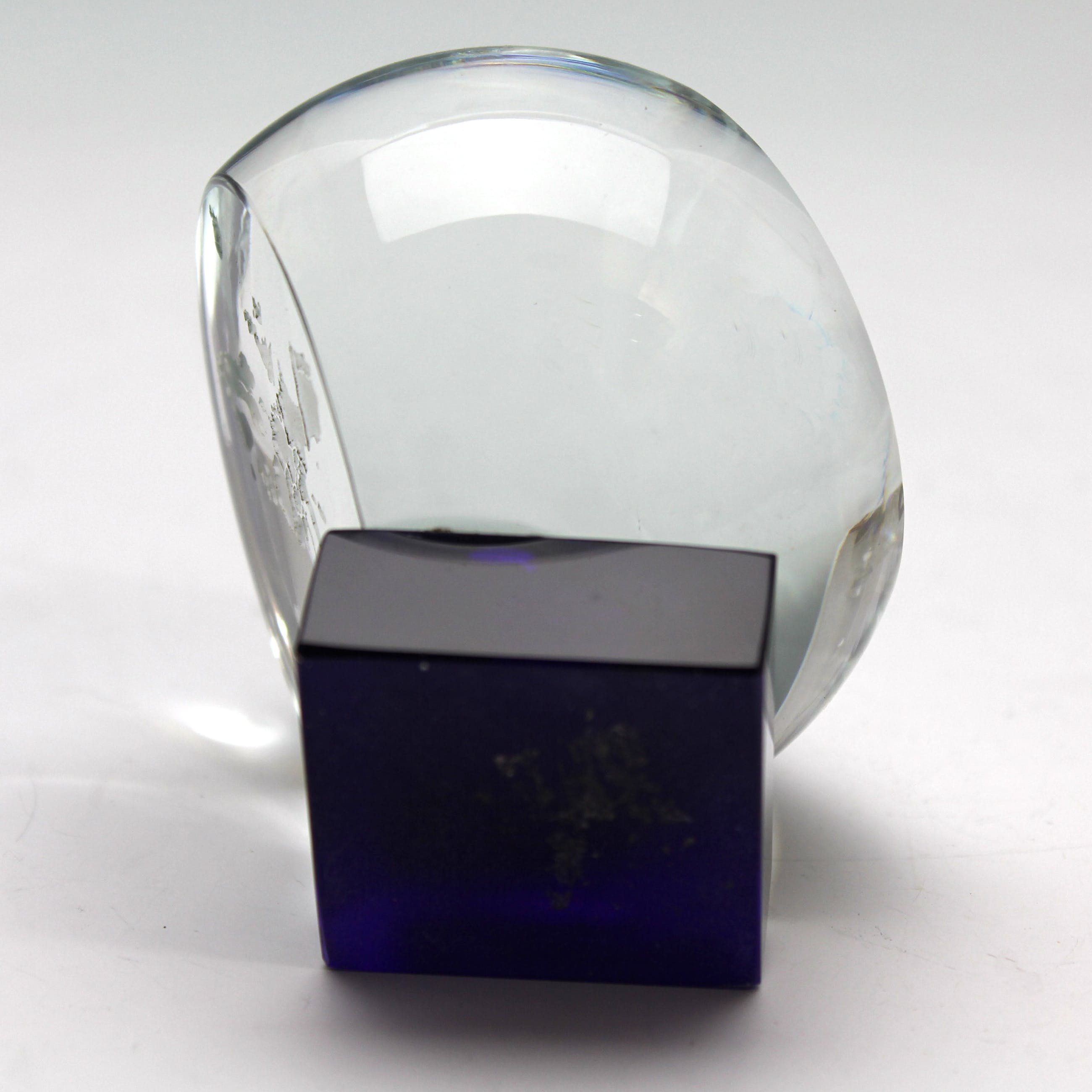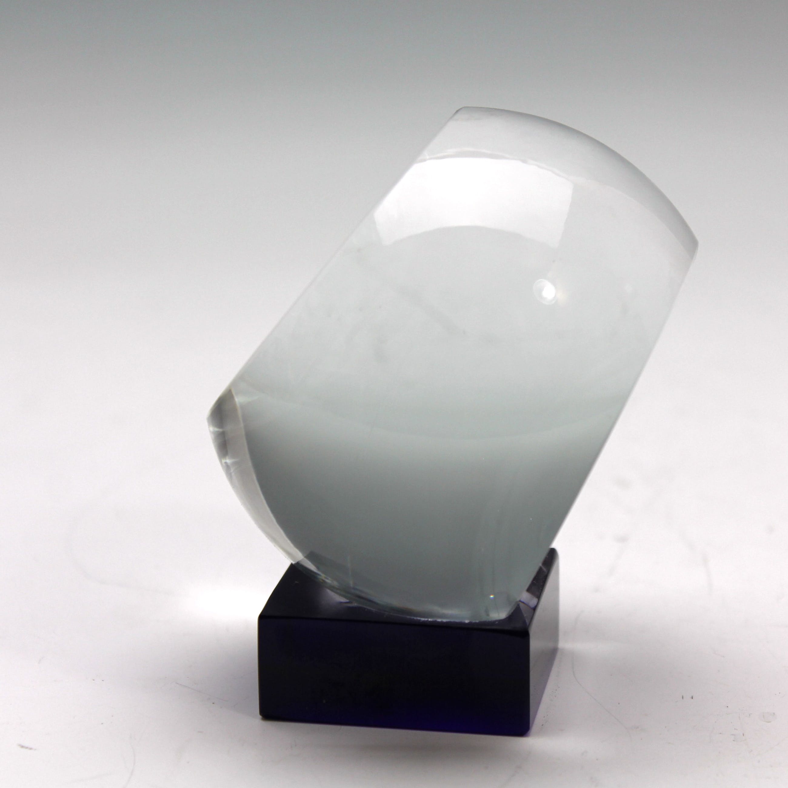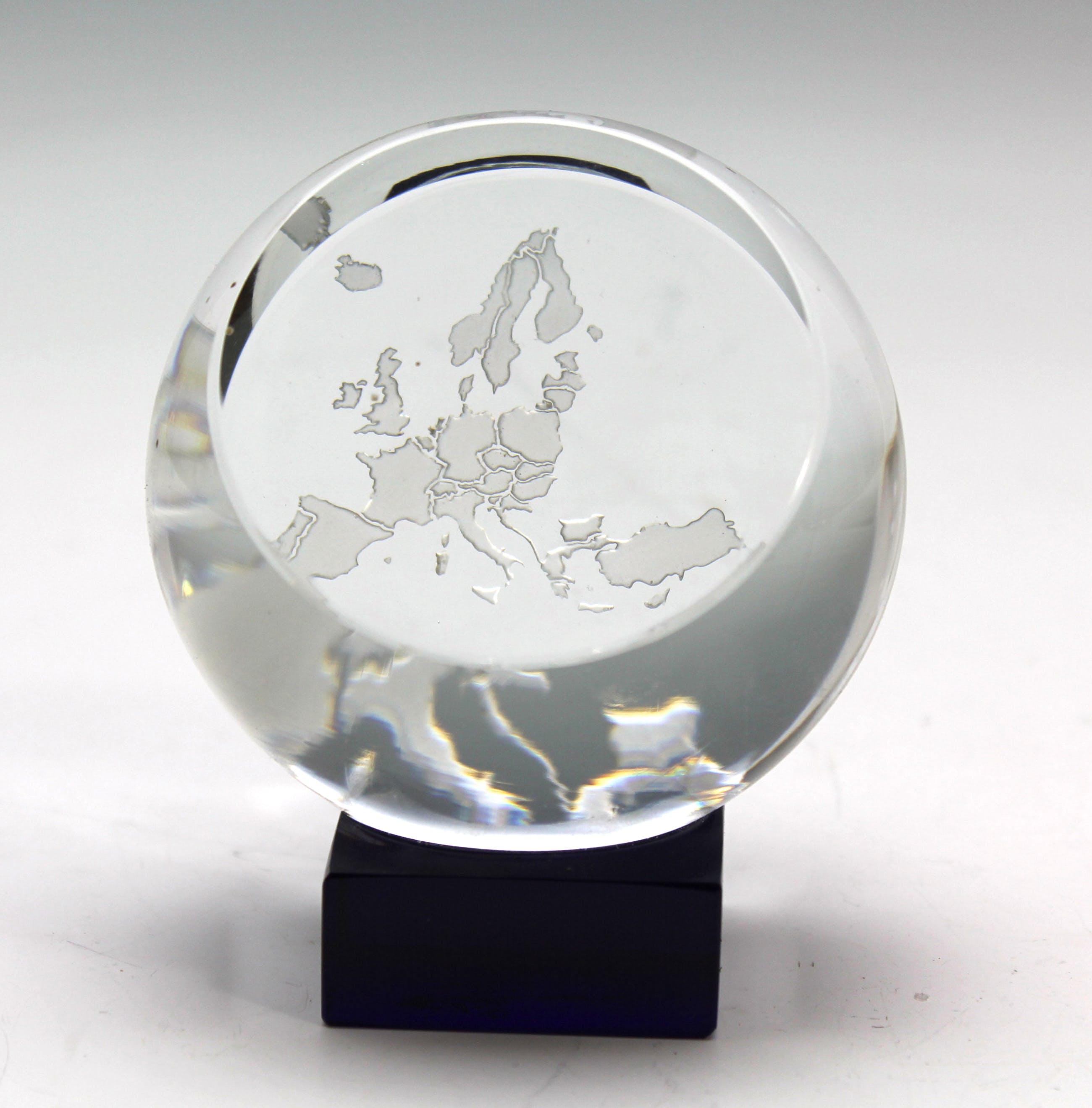Een blank glazen object met afbeelding van Europa op een zwartglazen voetstuk.