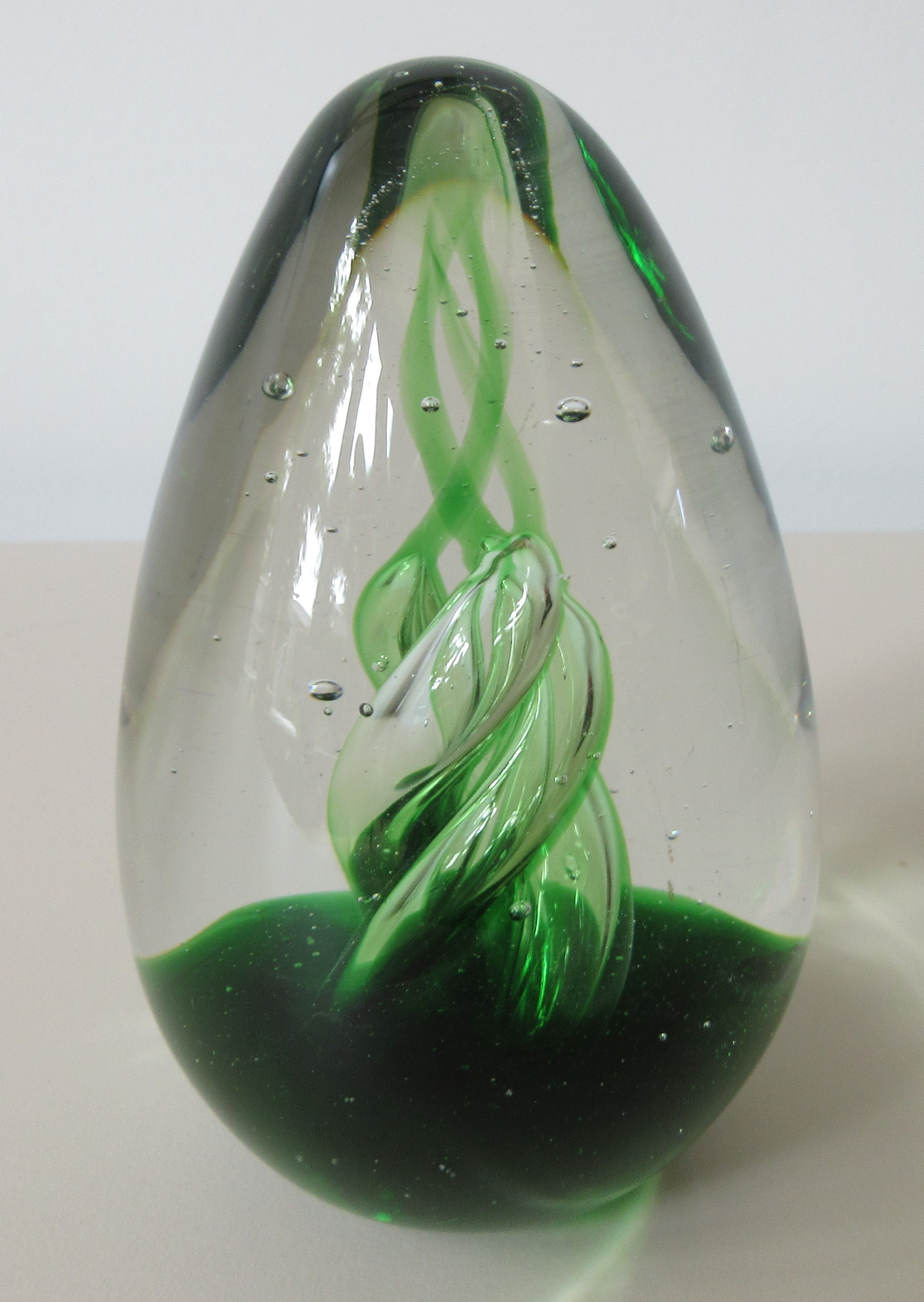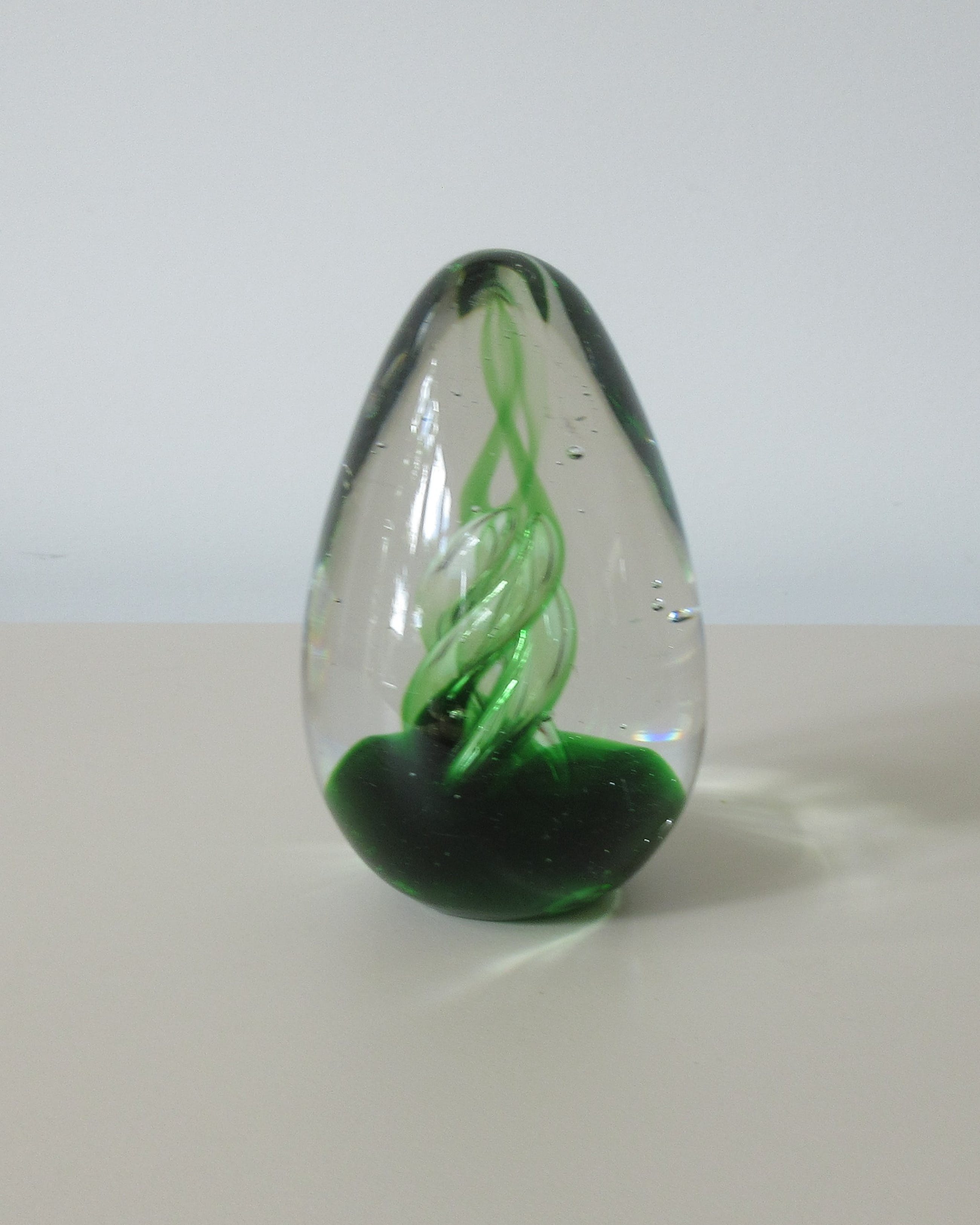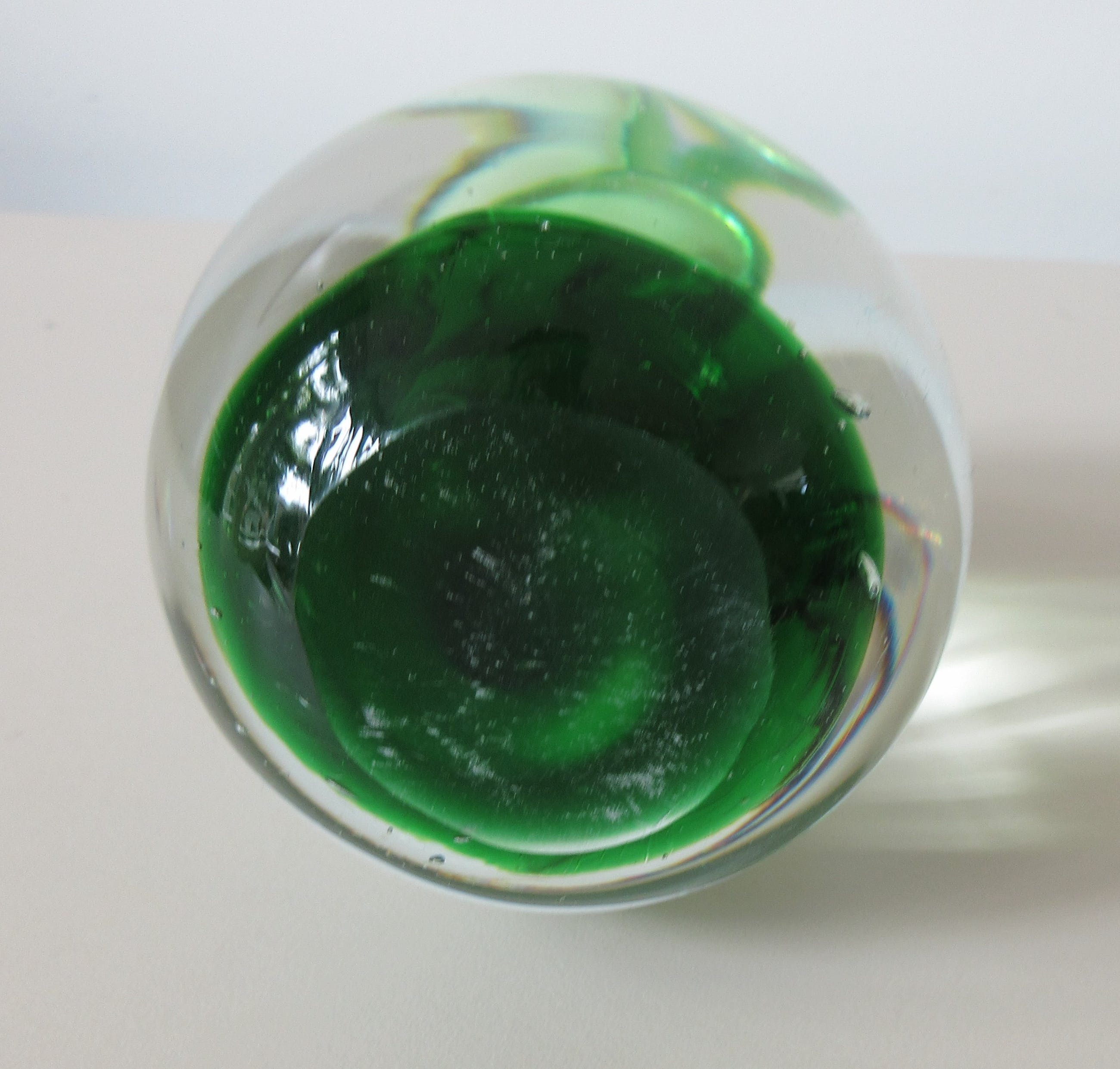 Presse papier met groene en heldere slingers en luchtbellen. Ontwerp Siem van der Marel voor Royal Leerdam. Niet gemerkt.