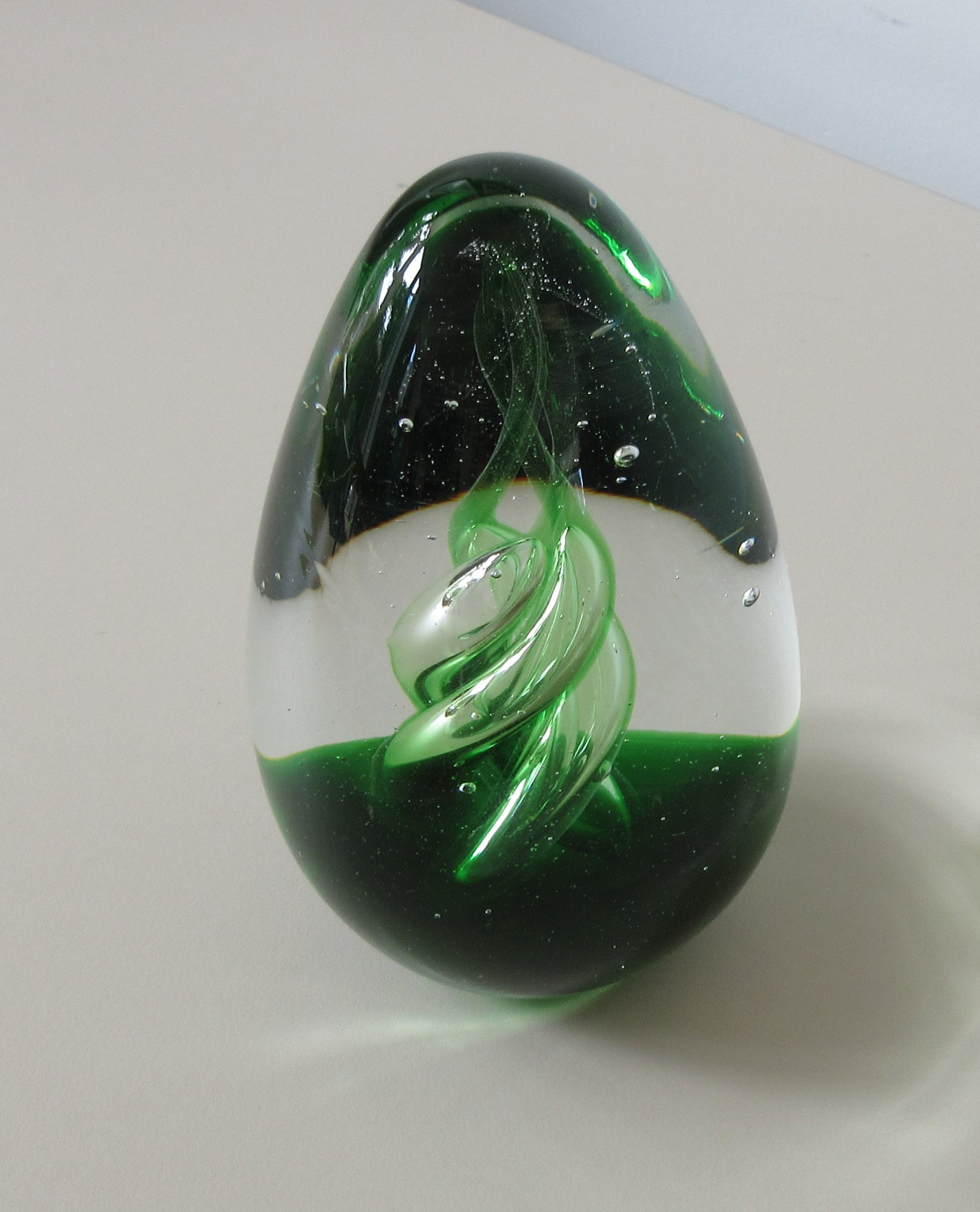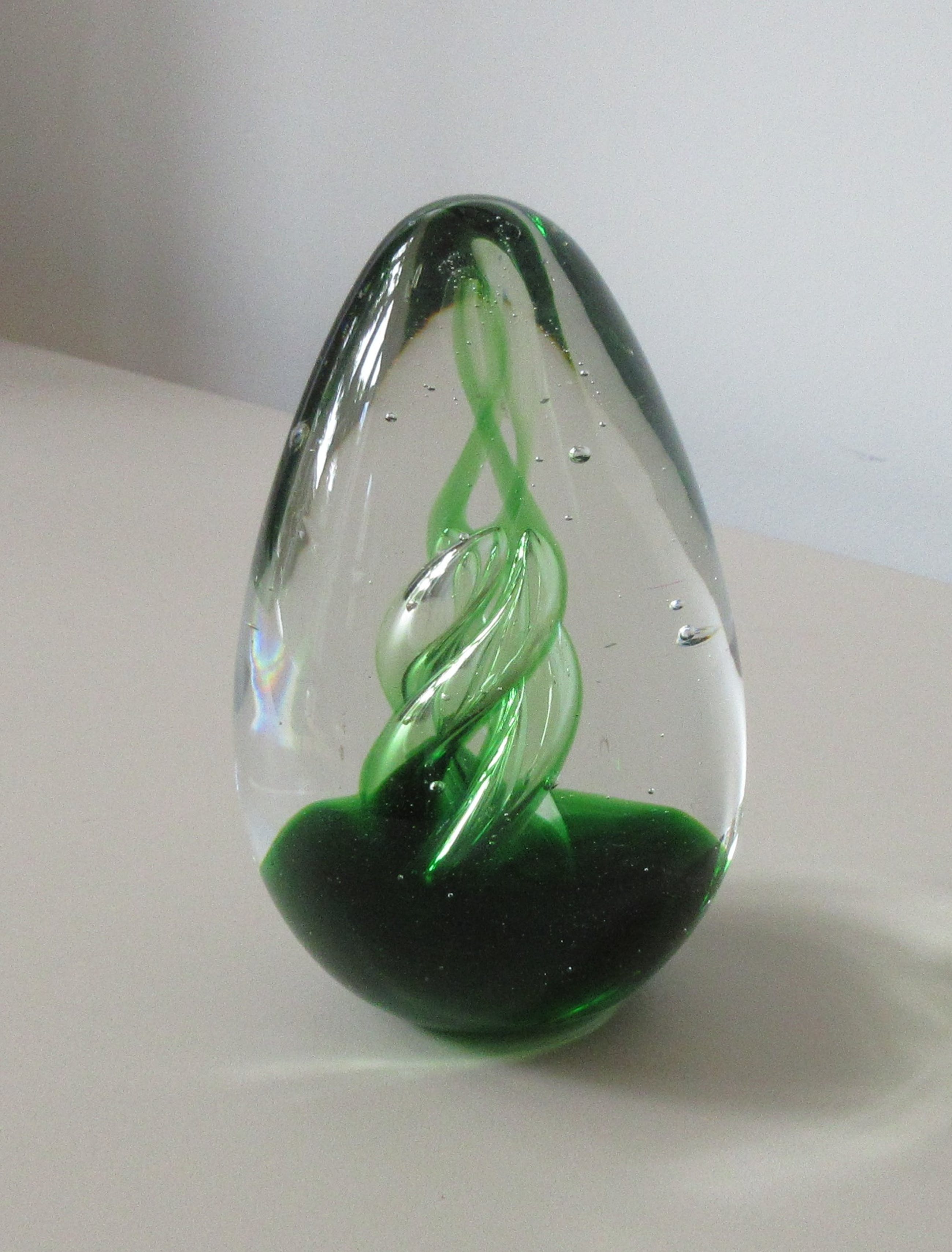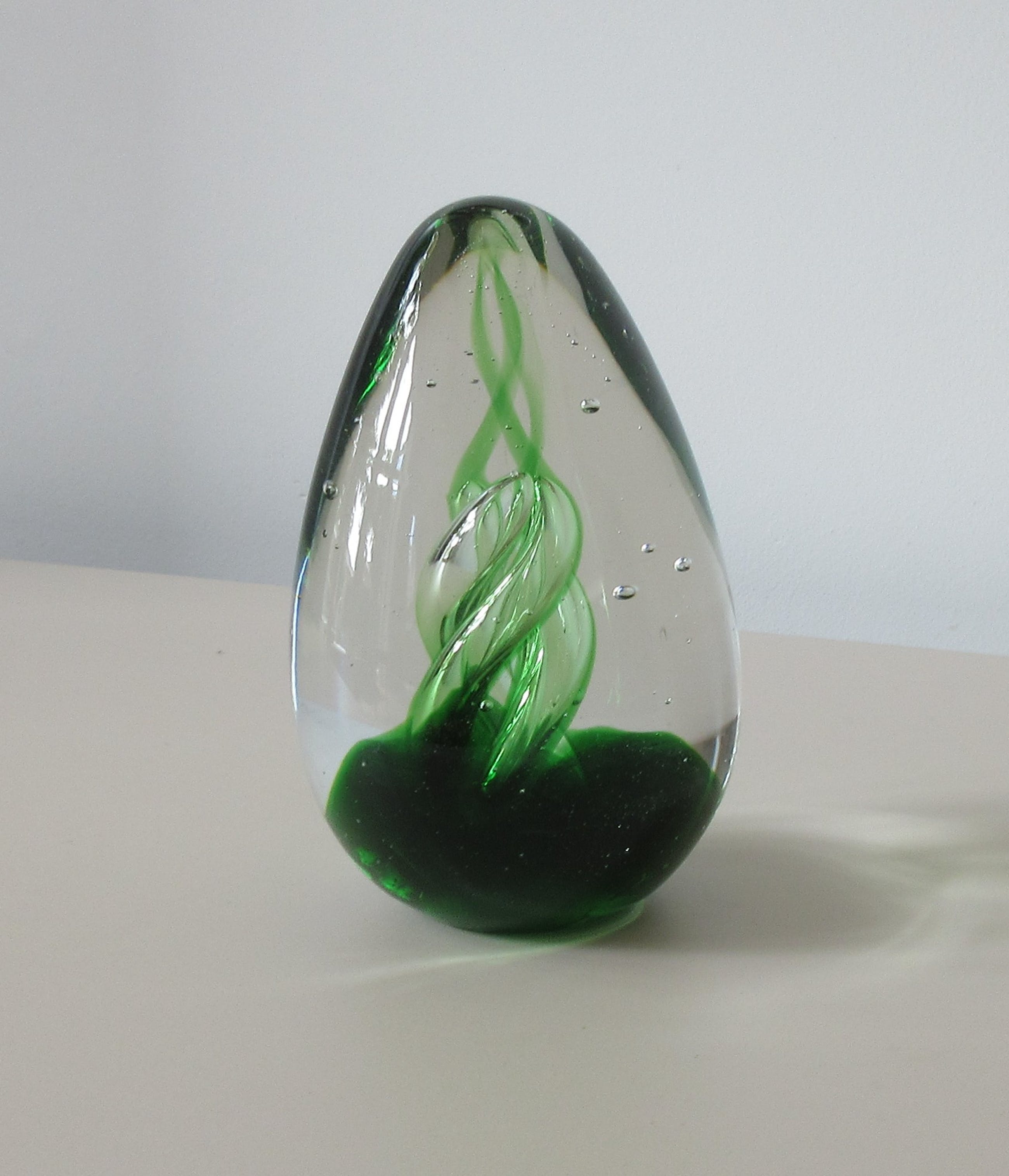 Presse papier met groene en heldere slingers en luchtbellen. Ontwerp Siem van der Marel voor Royal Leerdam. Niet gemerkt.