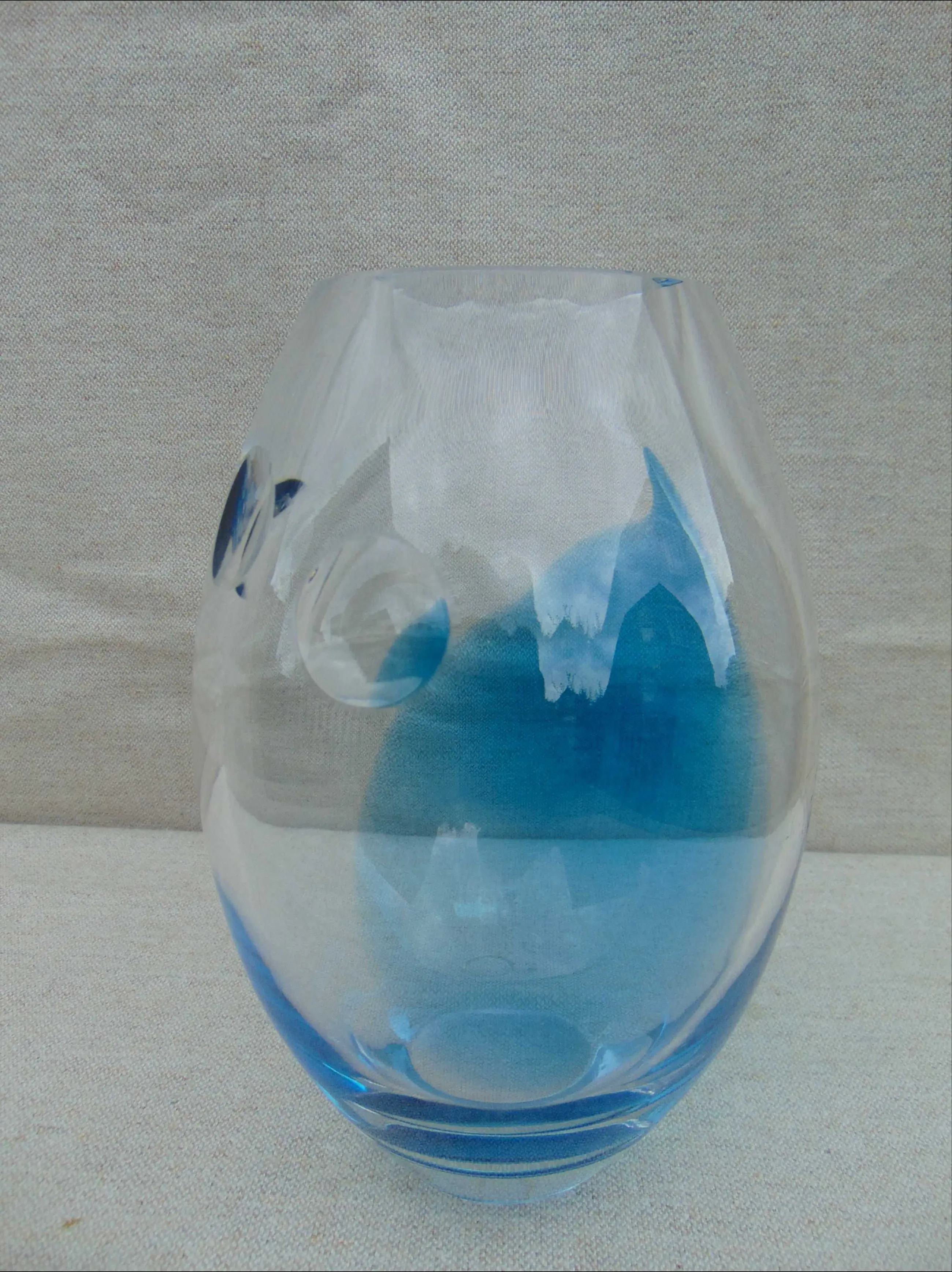 Deze kristallen vaas heeft 2 ingeslepen lenzen. De vaas is uitgevoerd in helder en blauw Crystal glas. De vaas is gemaakt bij Royal Leerdam (merksticker op vaas).