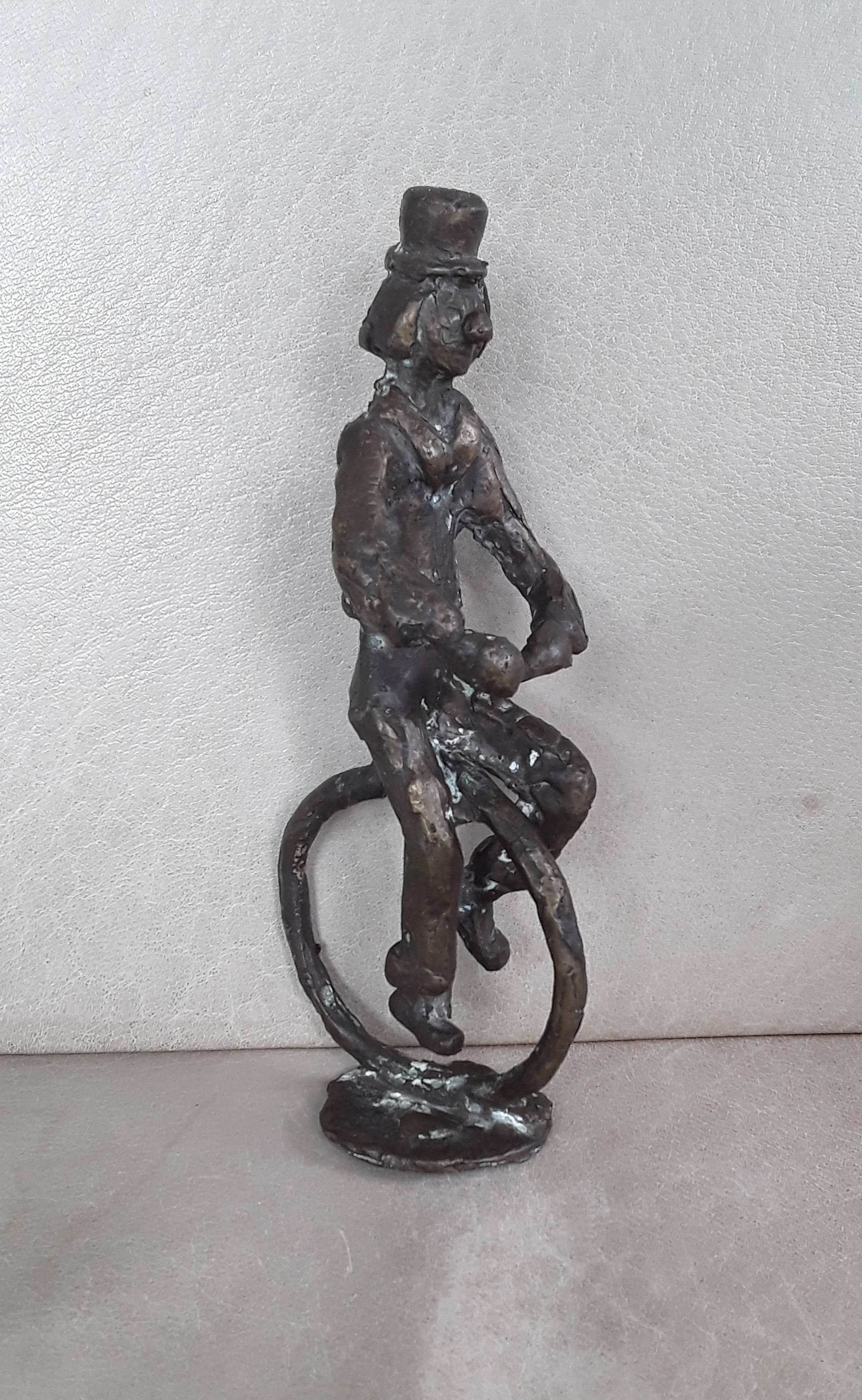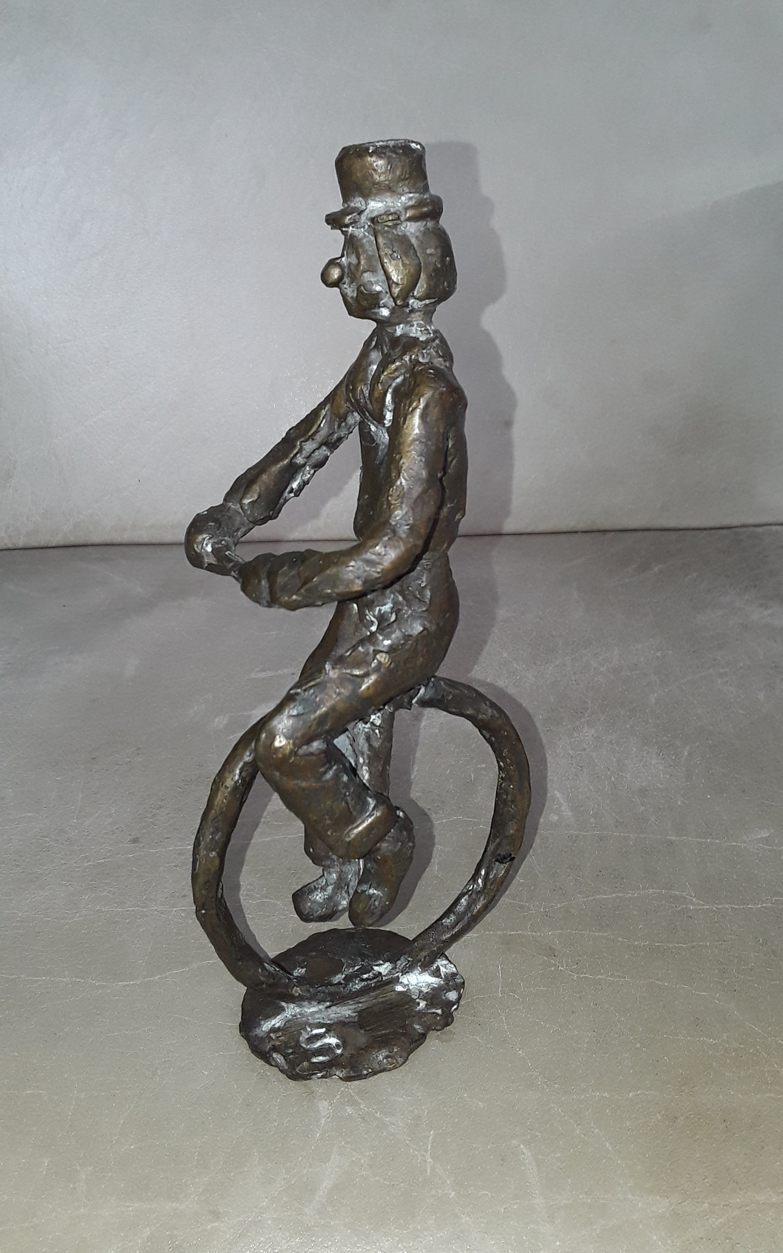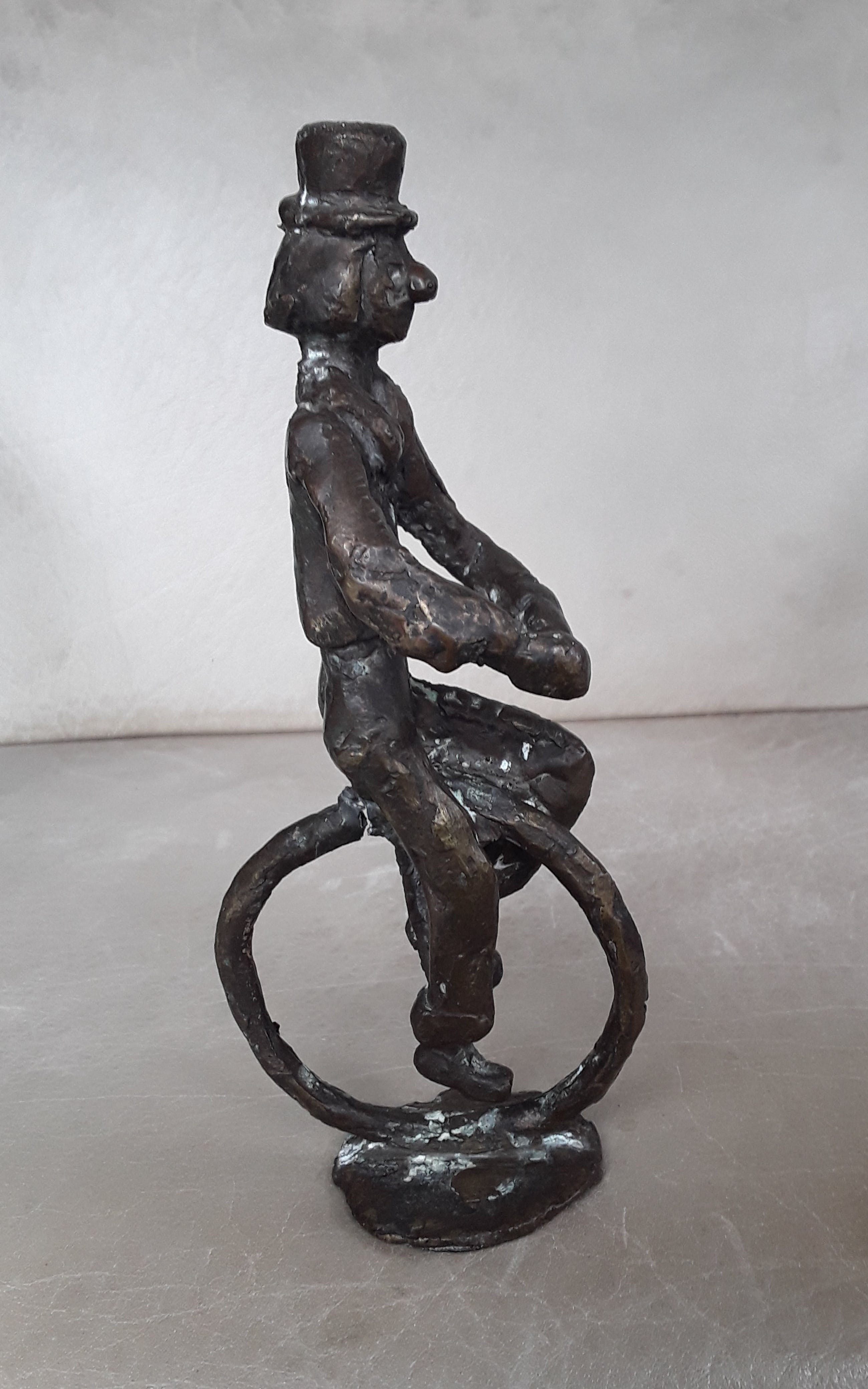 Een bronzen beeld clown op een eenwieler gemaakt door kunstenaar Siem Wardenaar.